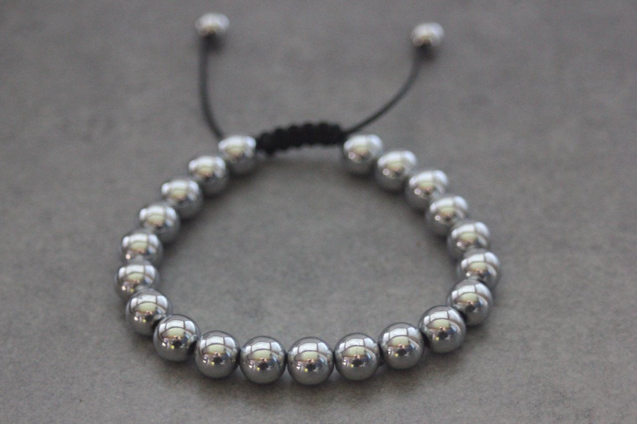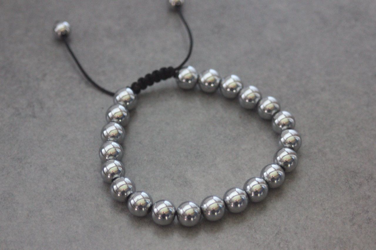 Bracelet ajustable avec fermoir coulissant de type macramé se terminant par 2 perles en hématite argenté de 6mm.