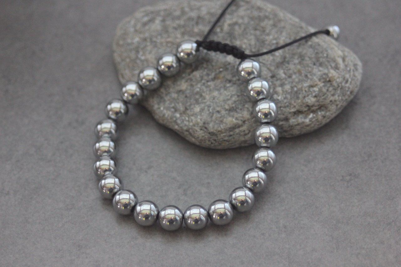 Bracelet en pierres naturelles semi-précieuses. Matériaux utilisés : perles hématite argentées. Fermoir coulissant (convient à tous les poignets)
