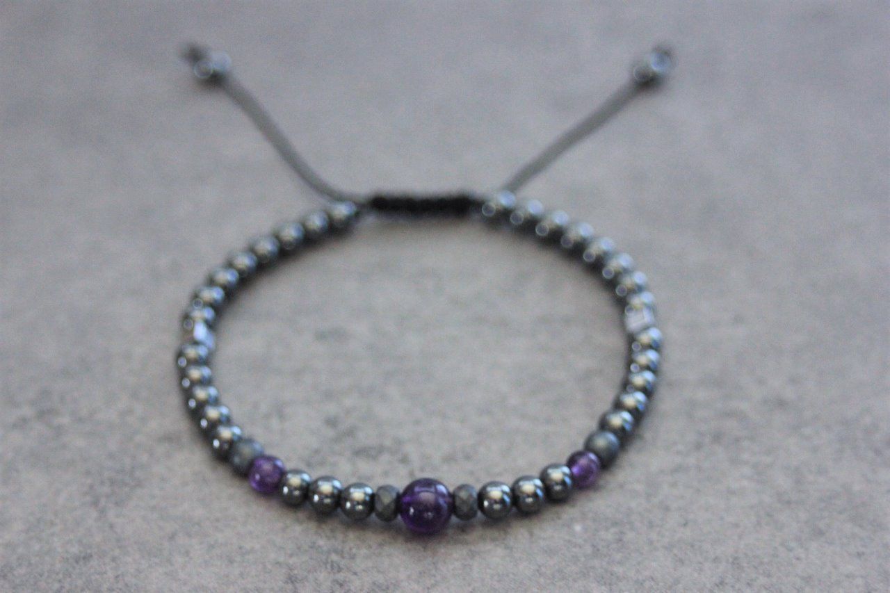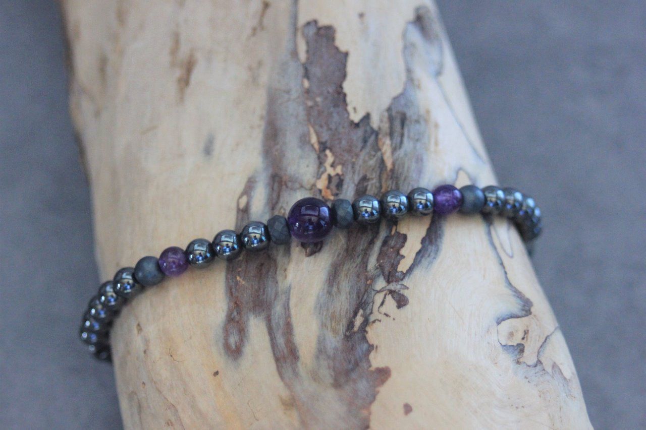 Bracelet en pierres naturelles semi-précieuses. Matériaux utilisés : perles hématite, perles hématite mat et perles améthyste. Fermoir coulissant (convient à tous les poignets)