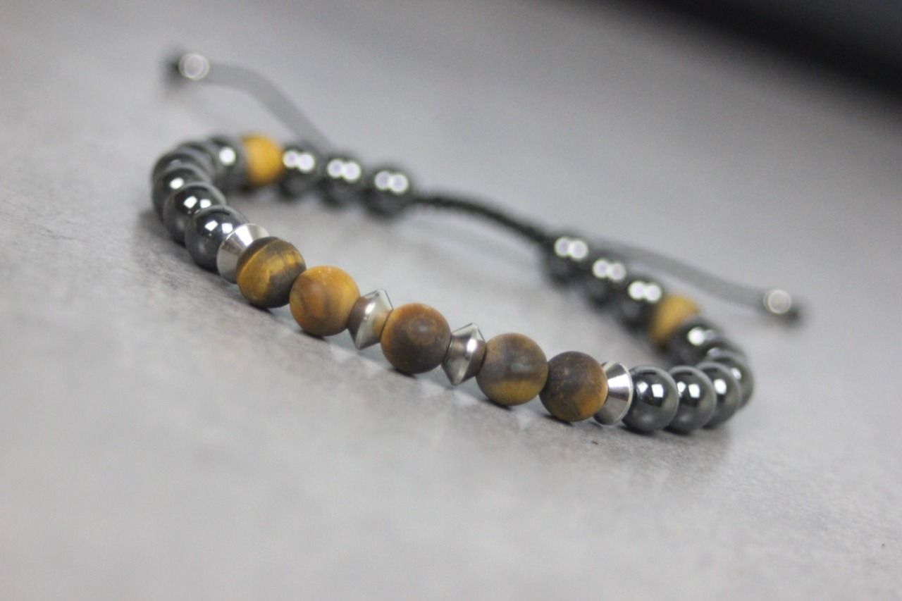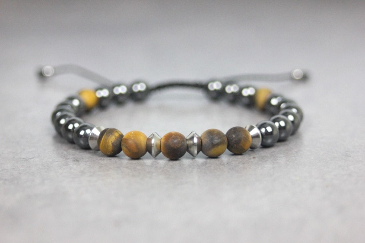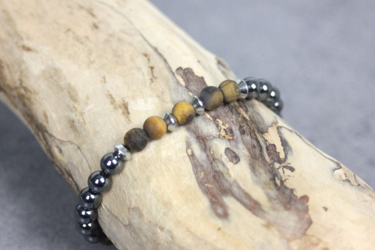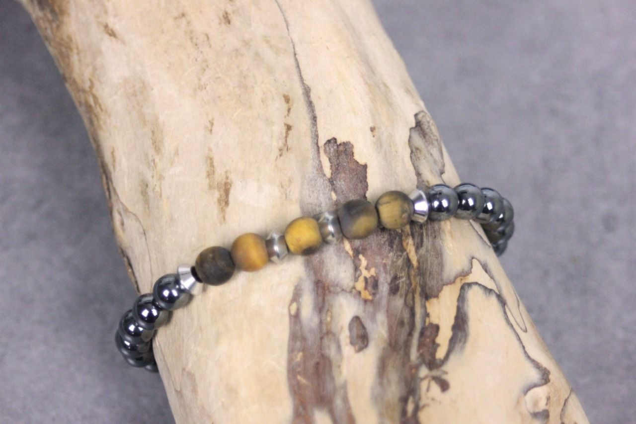 Bracelet en pierres naturelles semi-précieuses et acier inoxydable. Matériaux utilisés : perles hématite, oeil de tigre mat et acier inoxydable. Fermoir coulissant (convient à tous les poignets)
