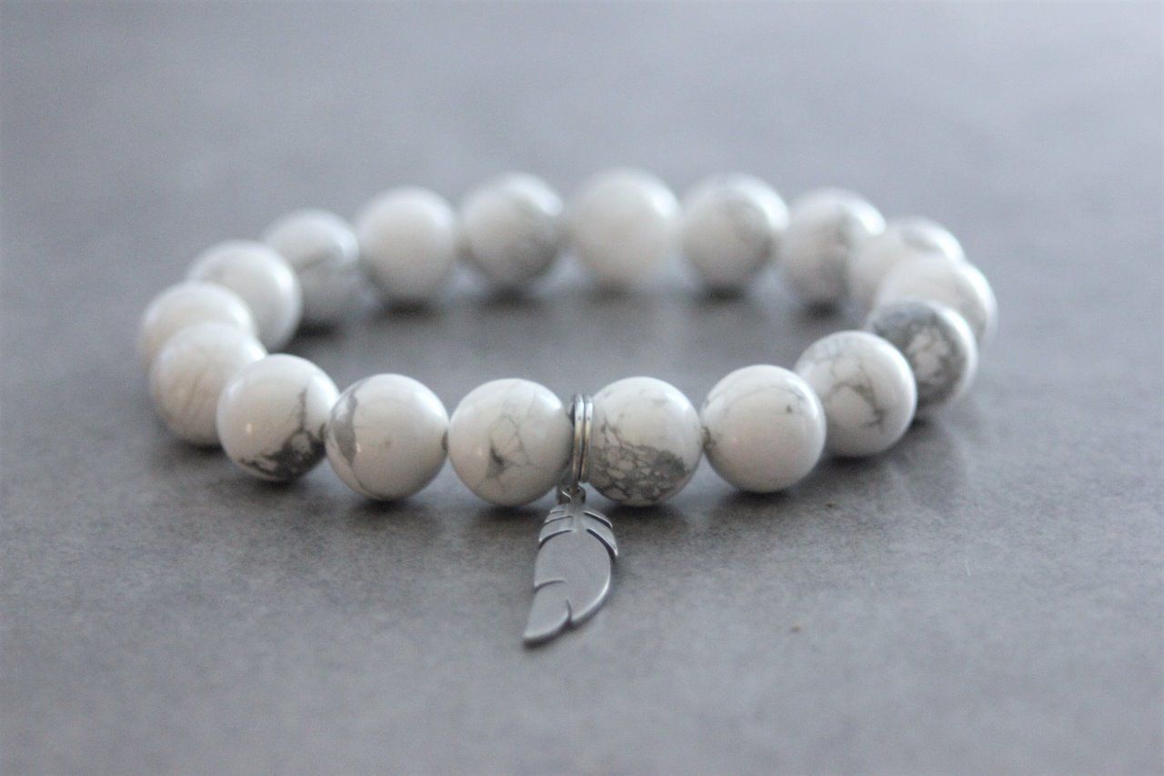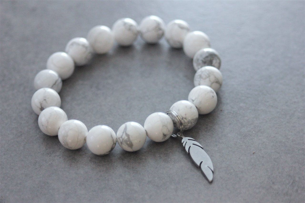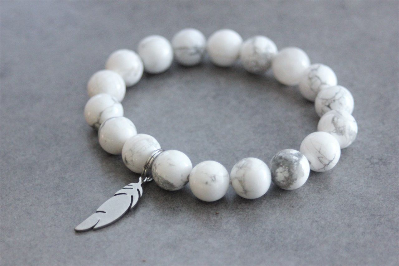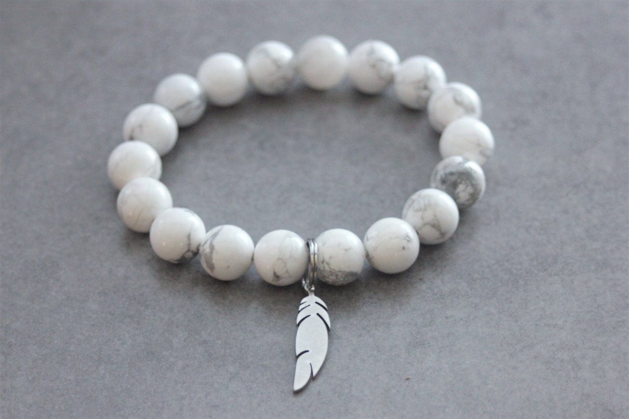 Bracelet perles howlite blanche et breloque plume en acier inoxydable