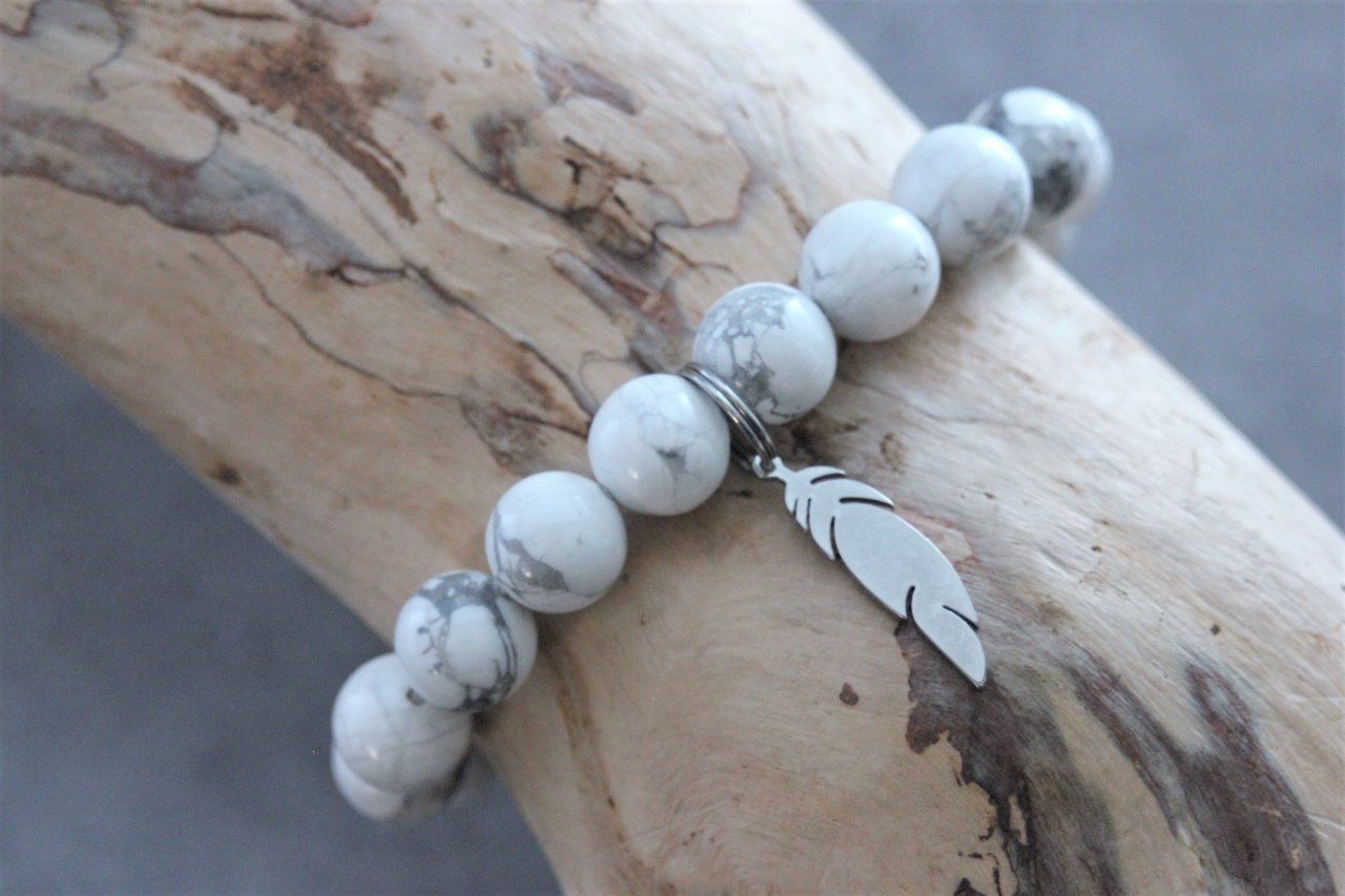 Bracelet perles howlite blanche et plume acier inoxydable - bracelet pierres naturelles - bracelet pierres gemmes - Bracelet perles