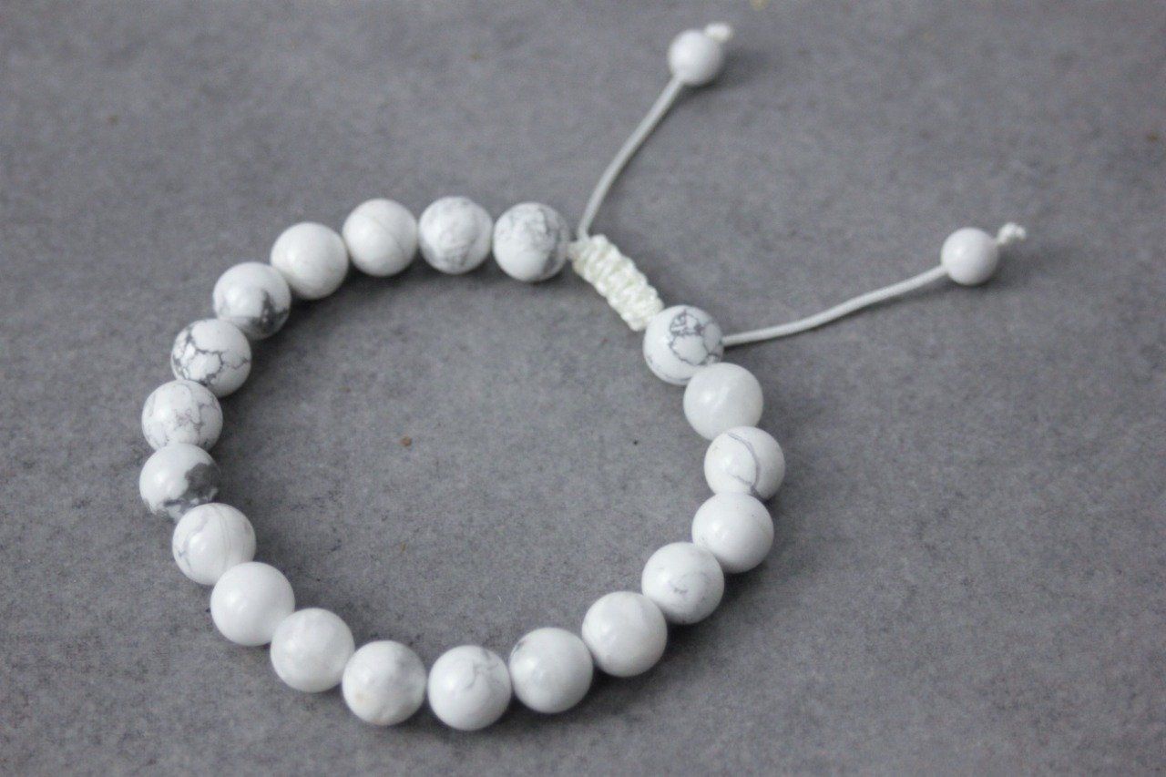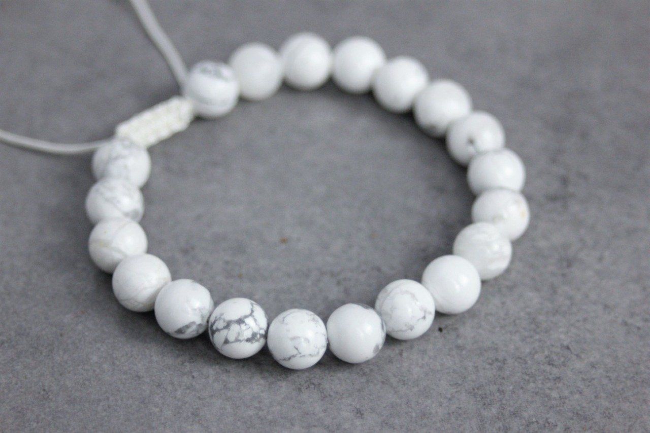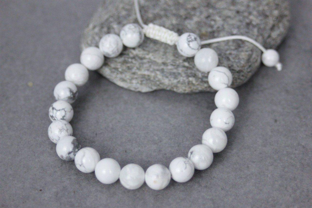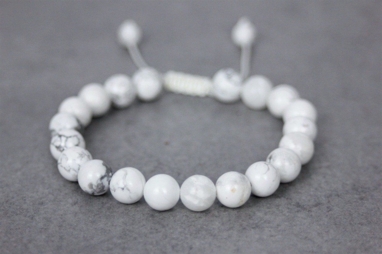 Bracelet ajustable avec fermoir coulissant de type macramé se terminant par 2 perles en howlite blanche de 6mm.