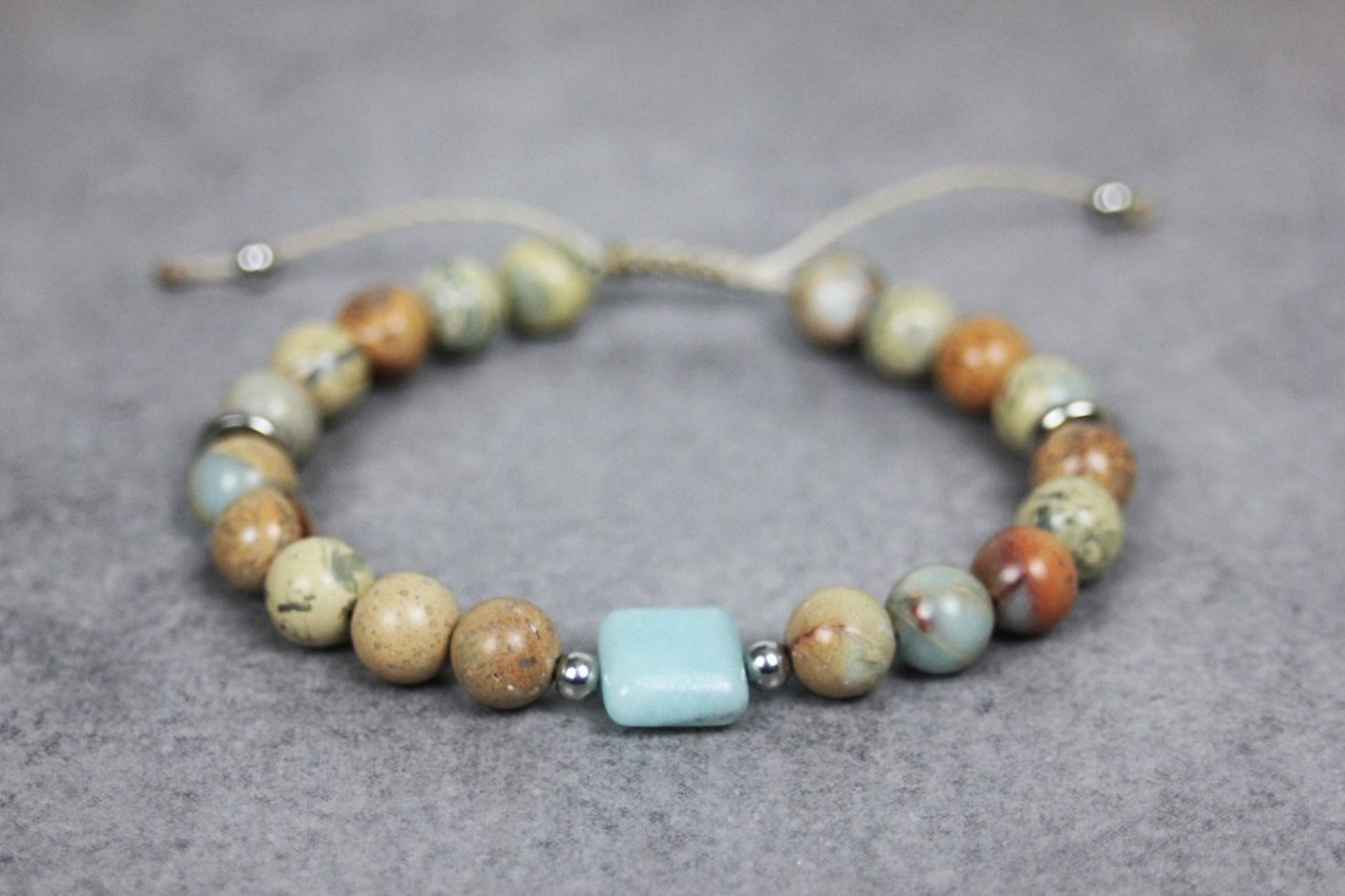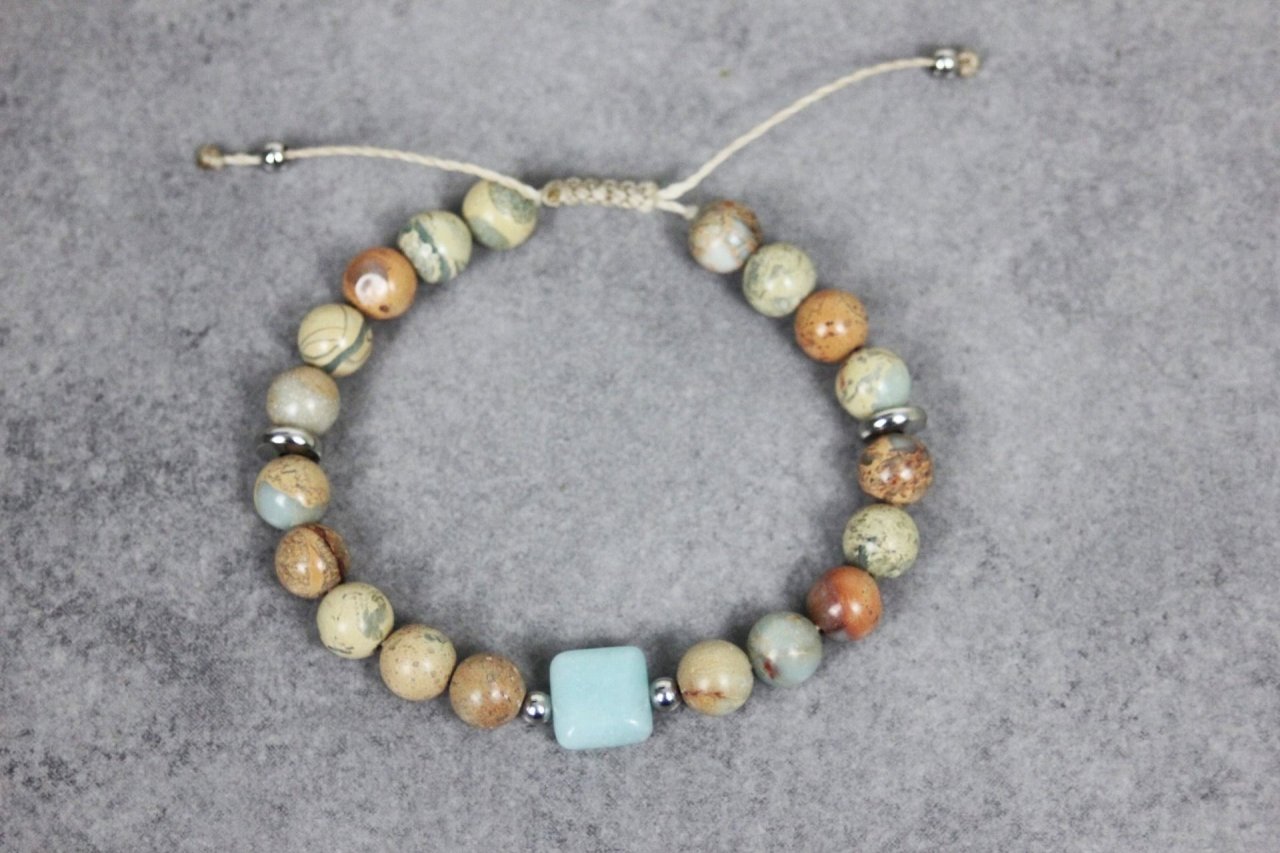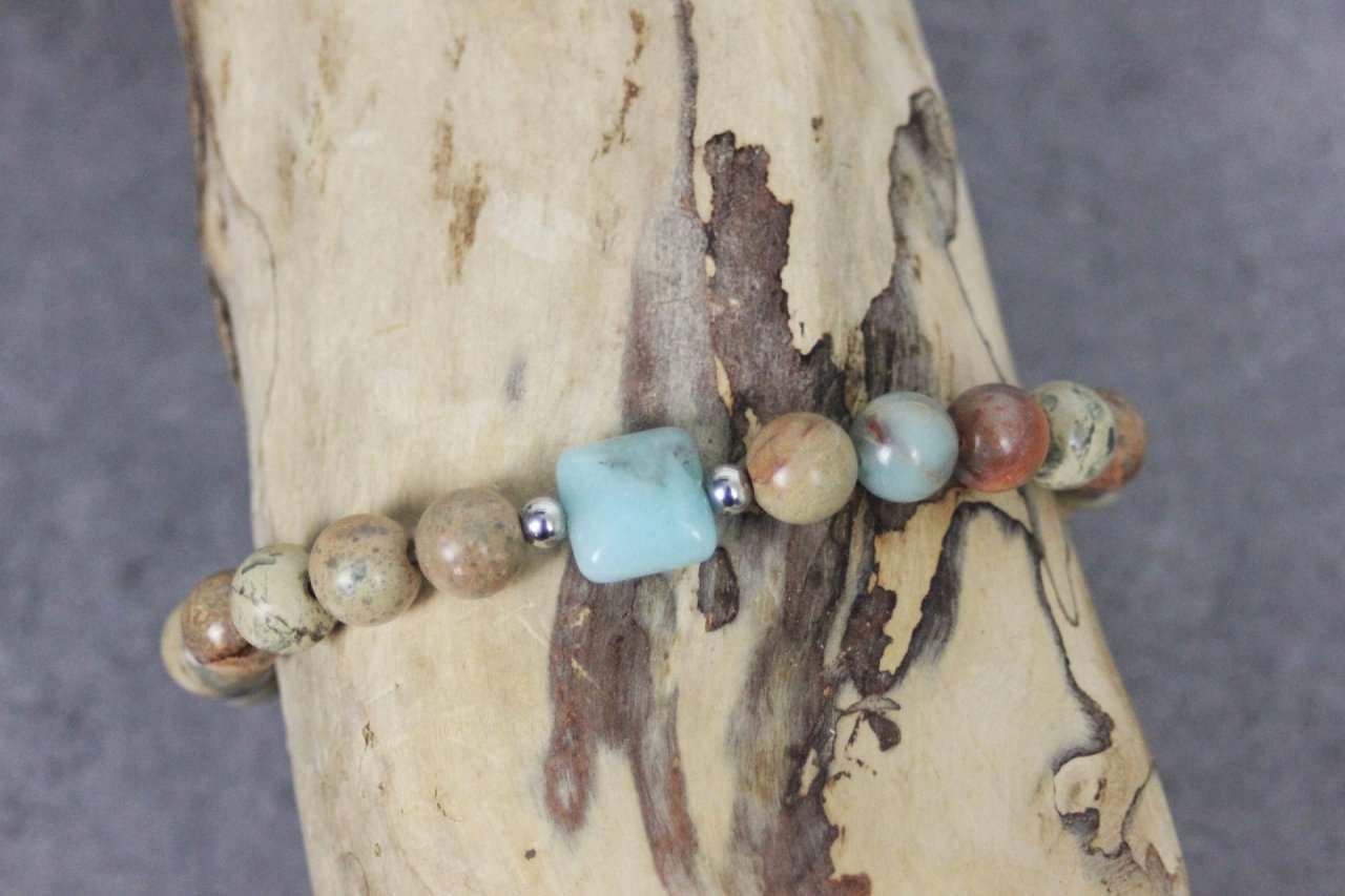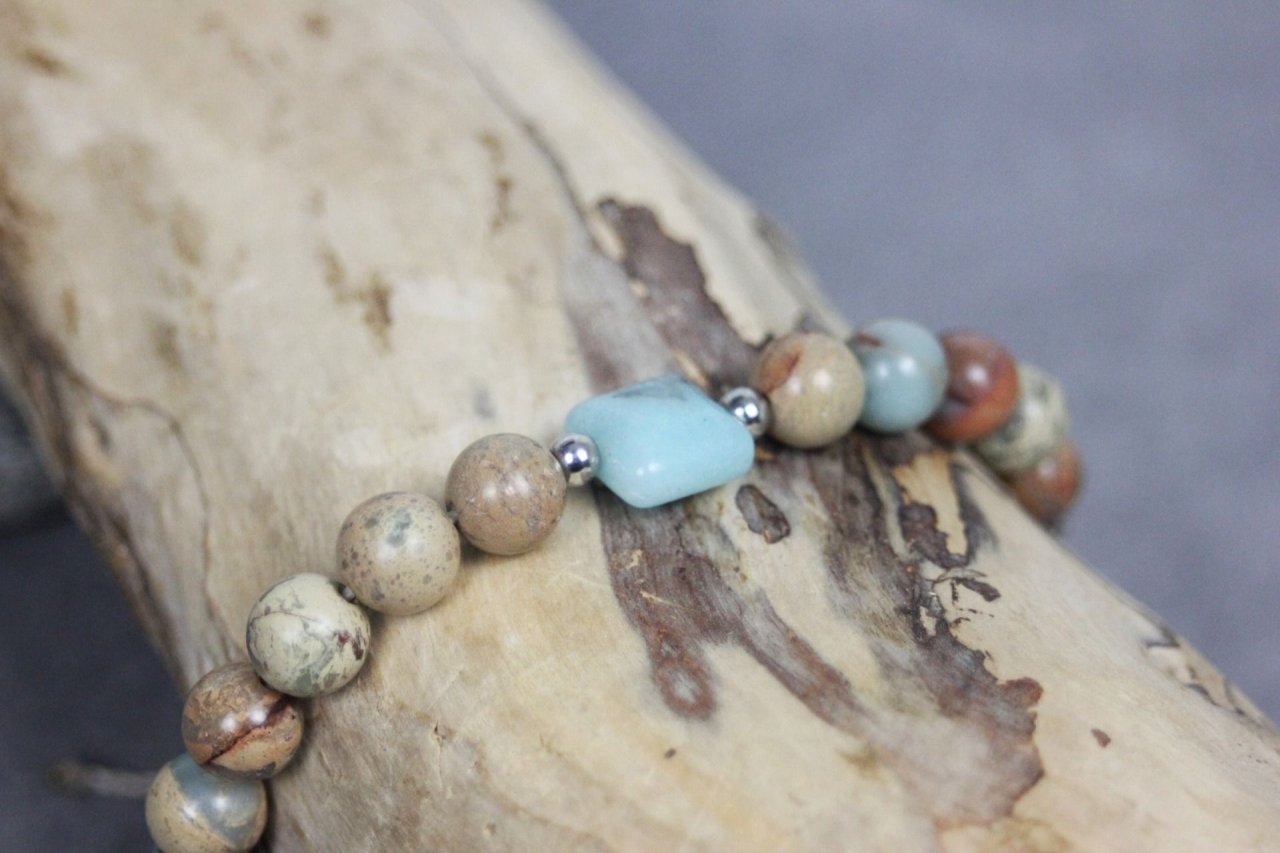 Bracelet en pierres naturelles semi-précieuses et acier inoxydable. Matériaux utilisés : perles jaspe impériale peau de serpent, amazonite et perles en acier inoxydable. Fermoir coulissant (convient à tous les poignets)