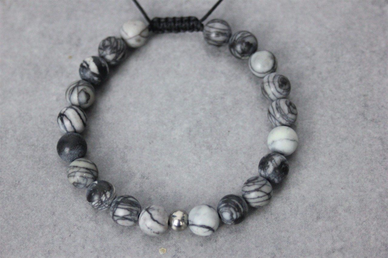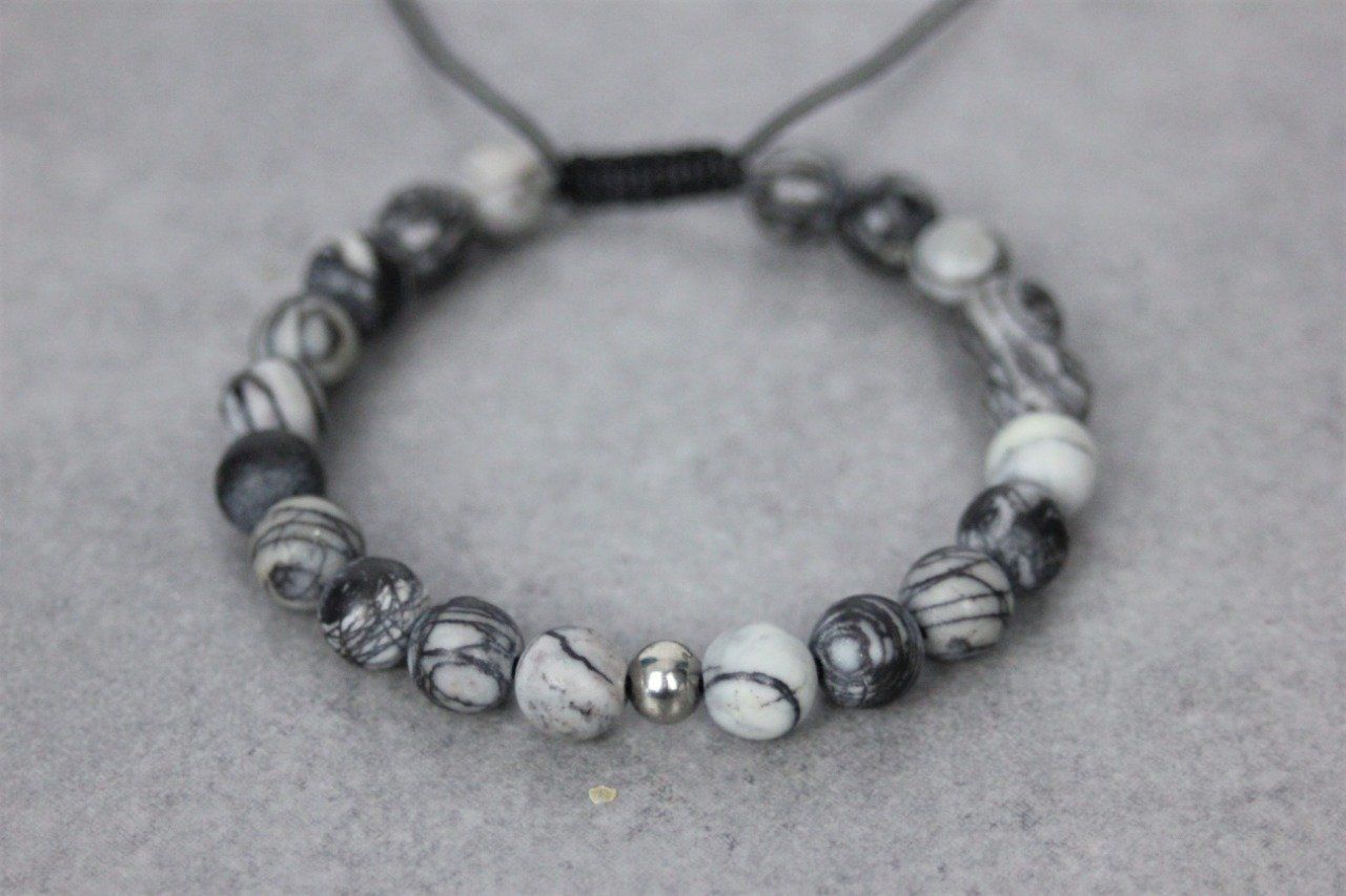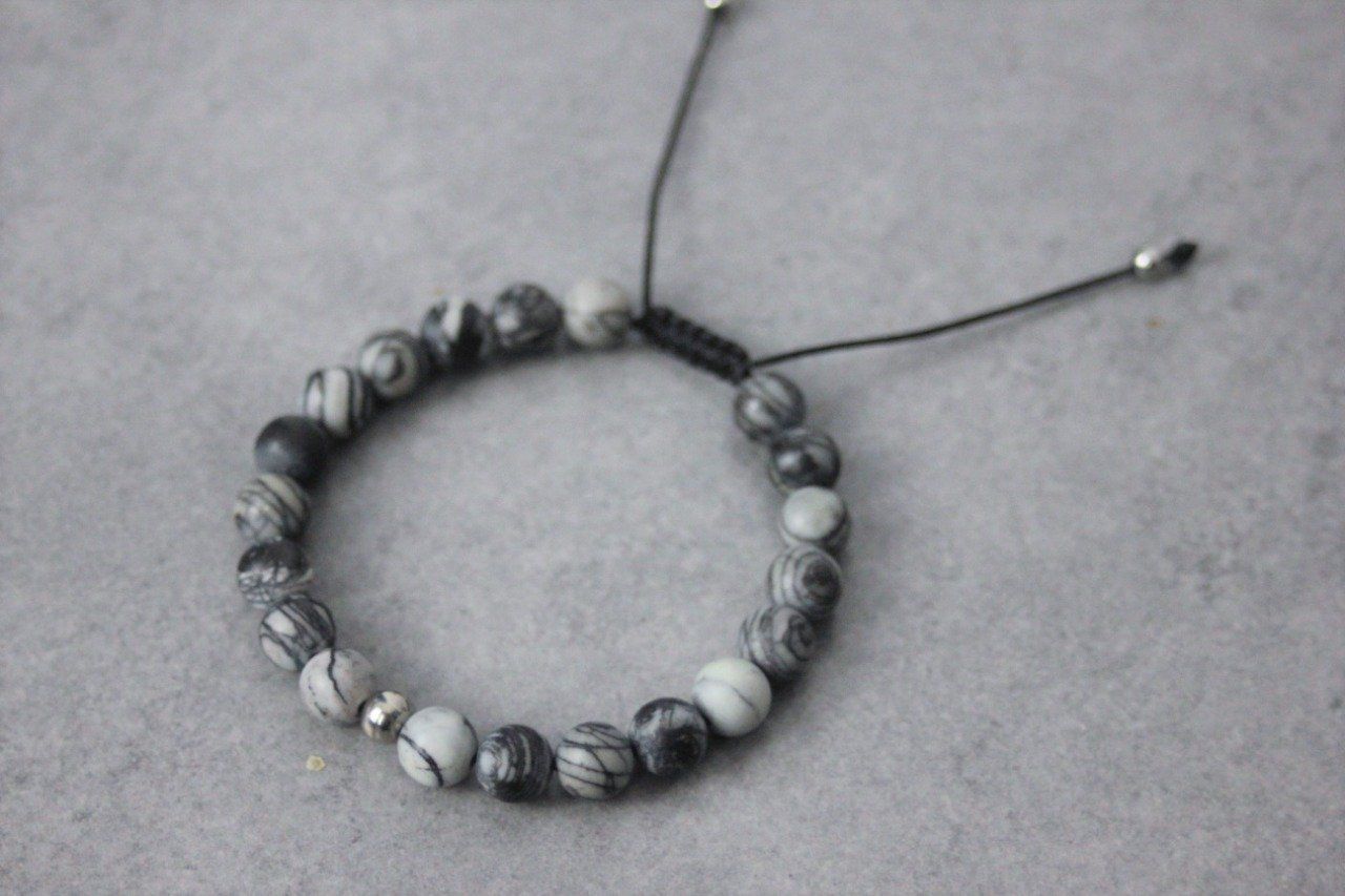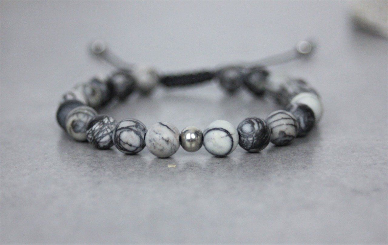 Bracelet en pierres naturelles semi-précieuses et acier inoxydable. Matériaux utilisés : perles jaspe picasso et perles acier inoxydable. Fermoir coulissant (convient à tous les poignets)