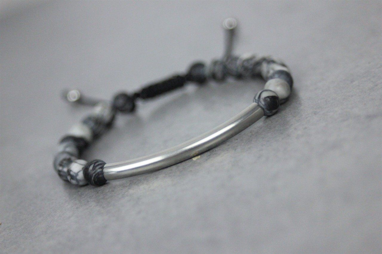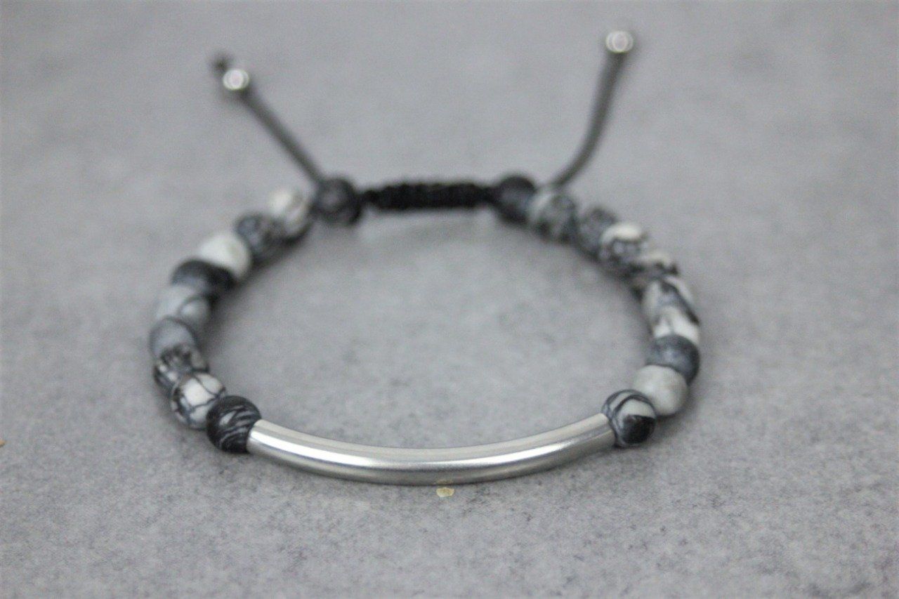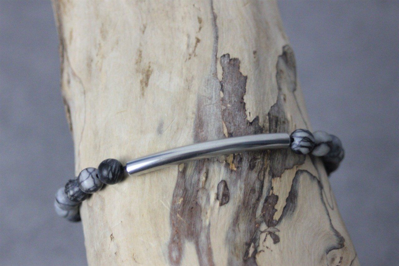 Bracelet perles jaspe picasso mat et perle tube acier inoxydable