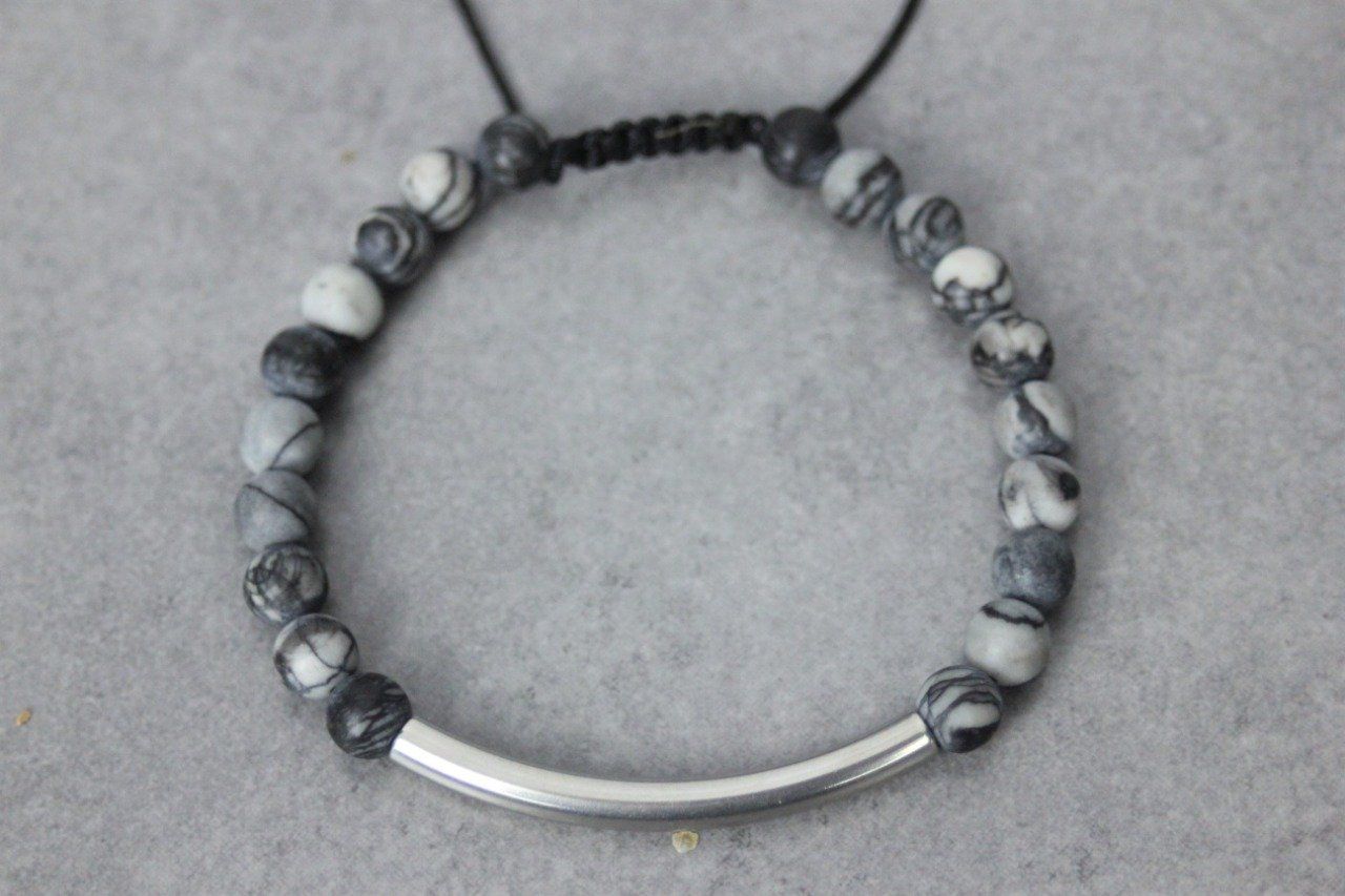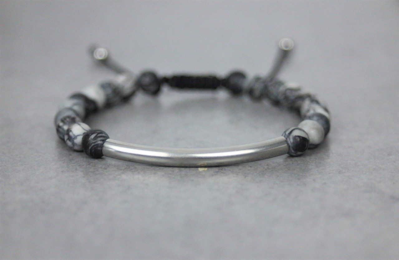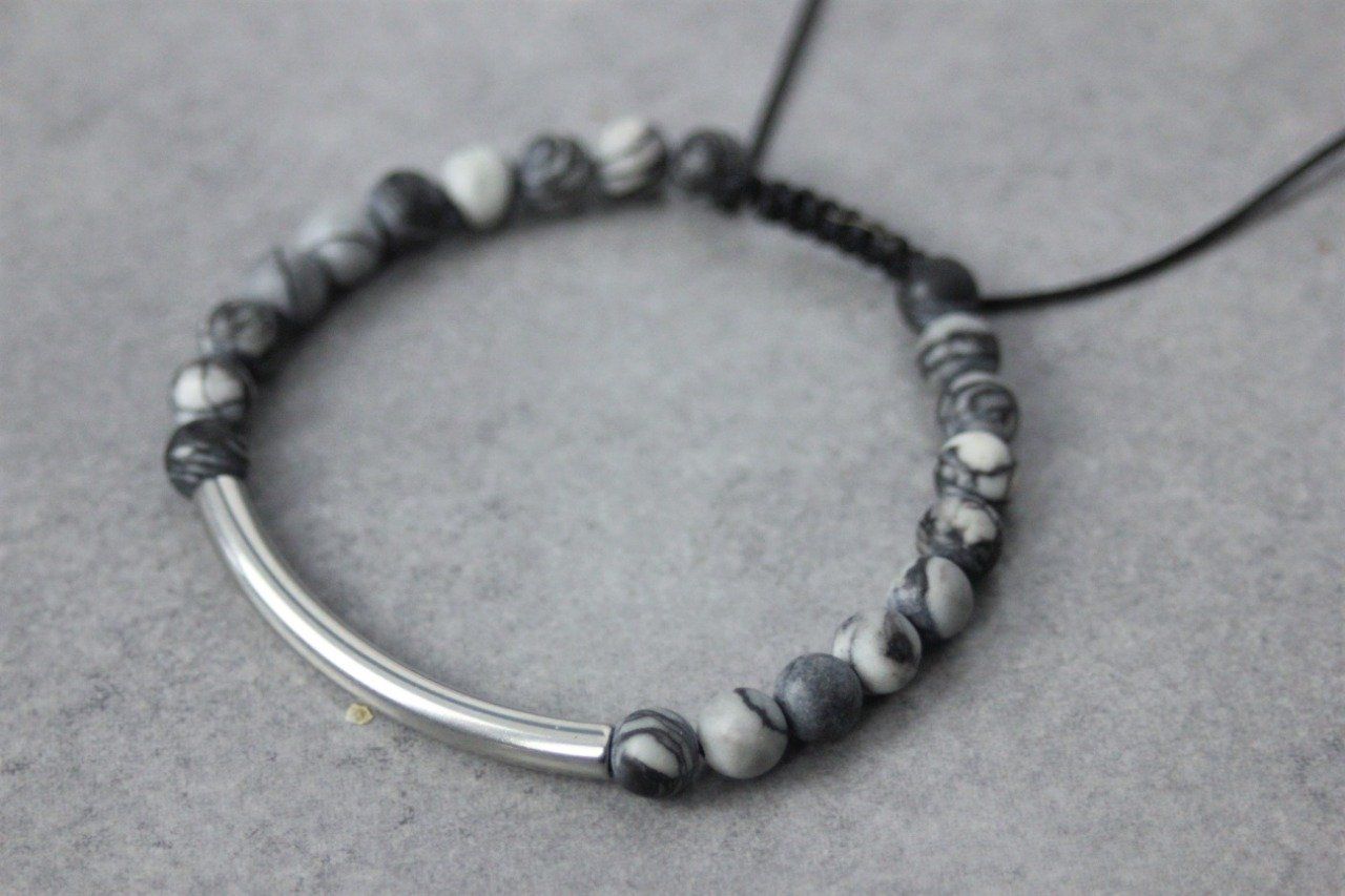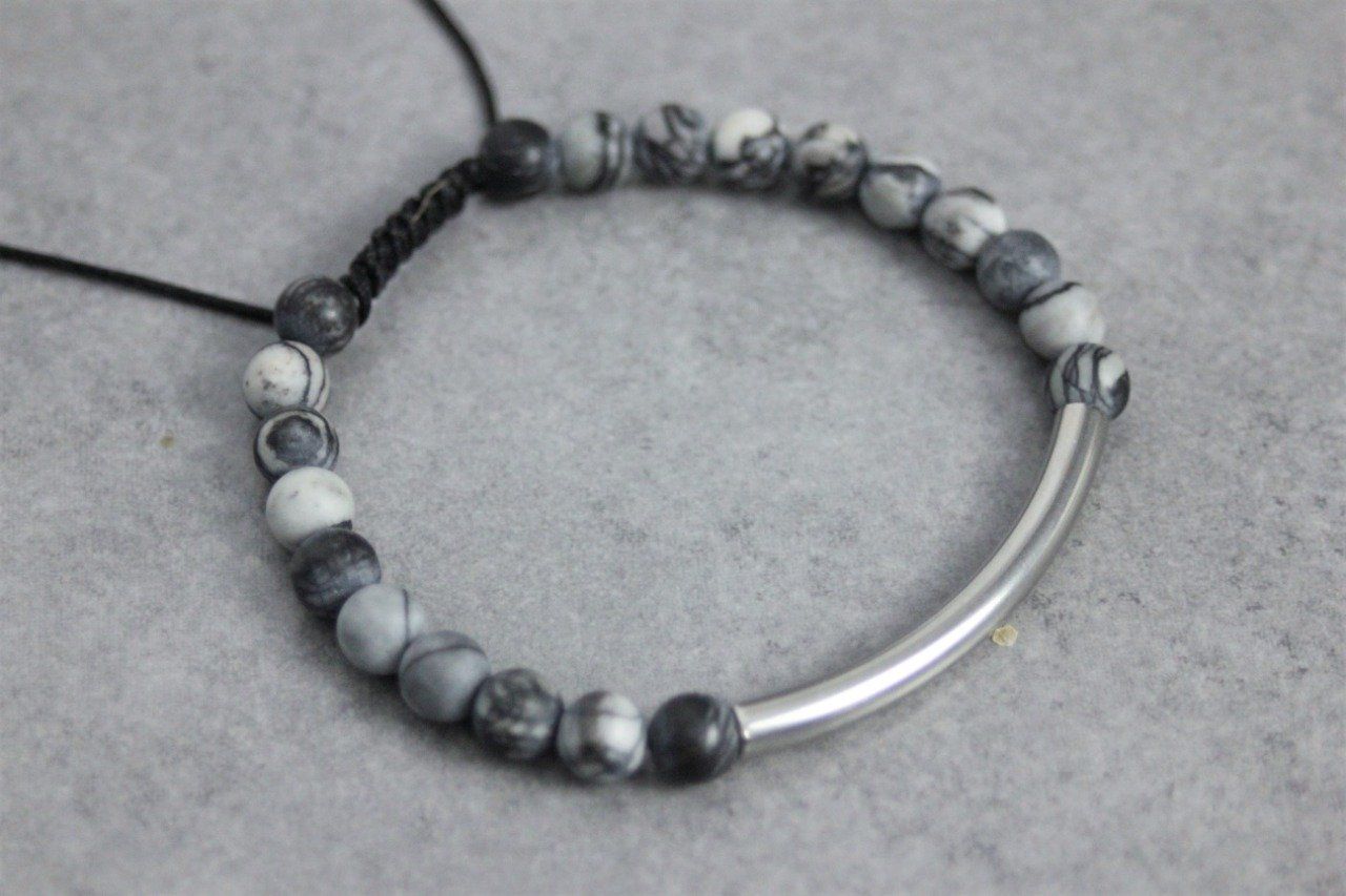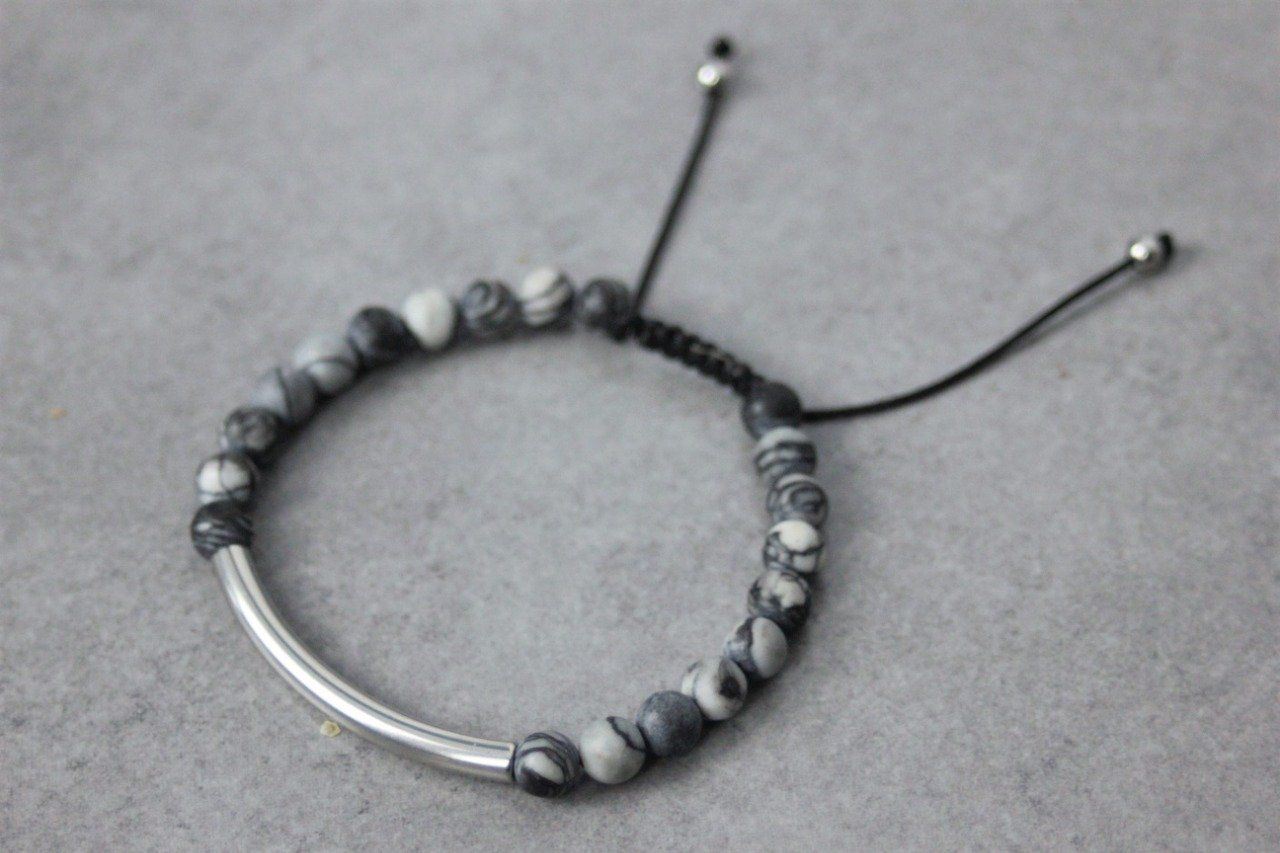 Bracelet en pierres naturelles semi-précieuses et acier inoxydable. Matériaux utilisés : perles jaspe picasso mat et perles en acier inoxydable. Fermoir coulissant (convient à tous les poignets)
