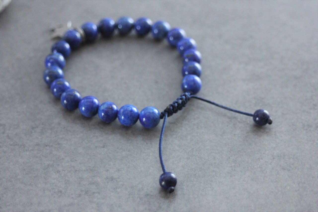 Bracelet ajustable avec fermoir coulissant de type macramé se terminant par 2 perles en lapis lazuli de 6mm.