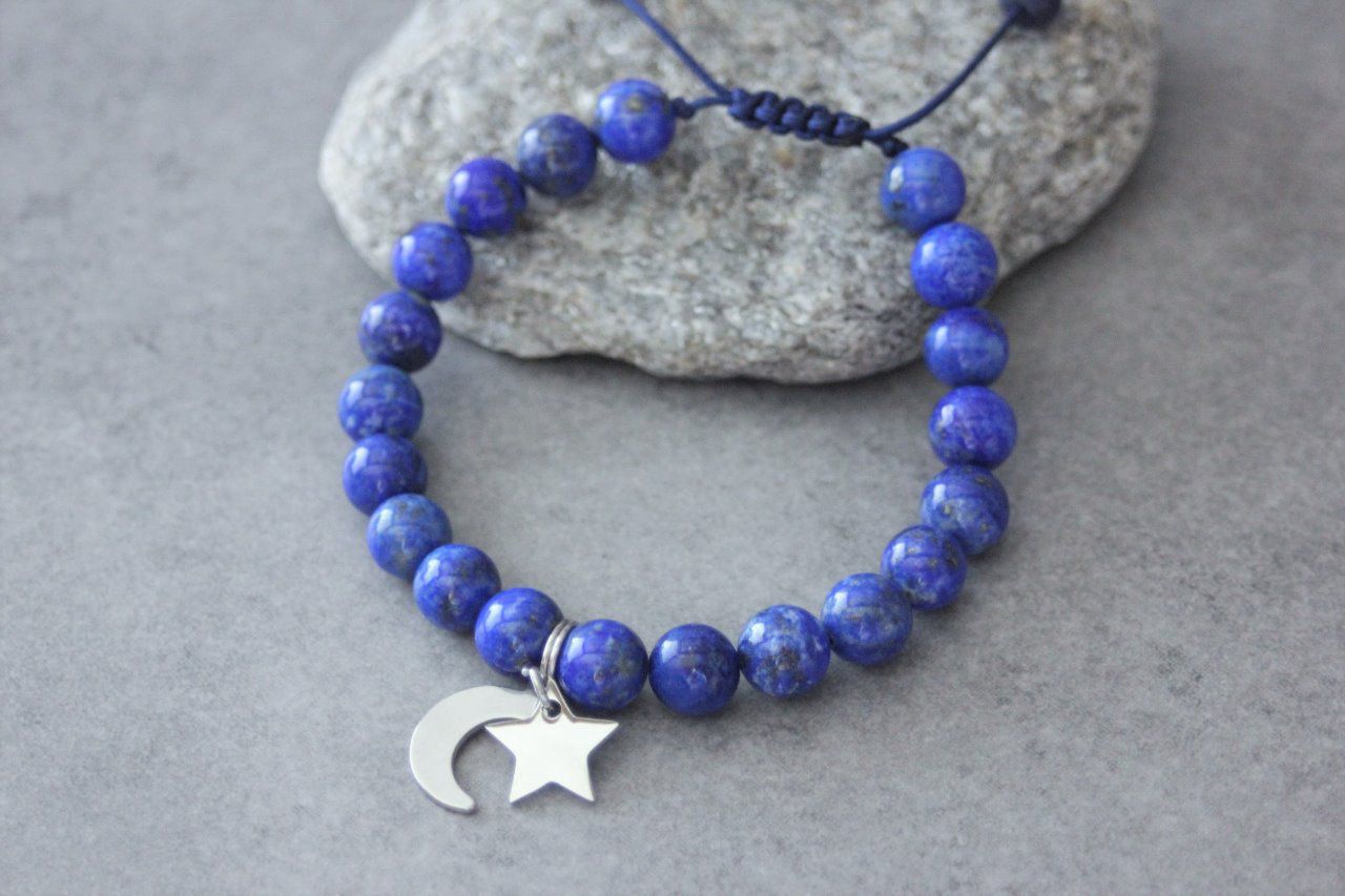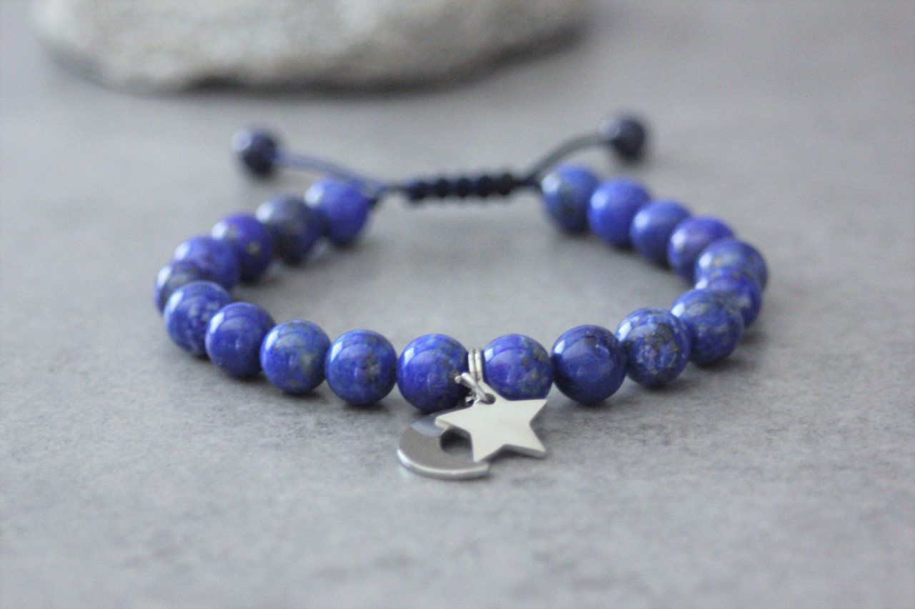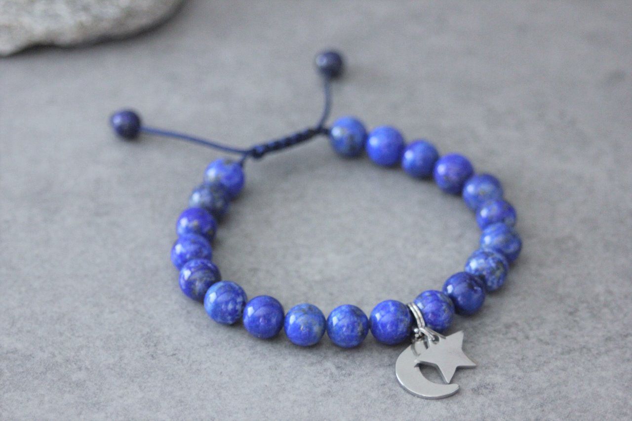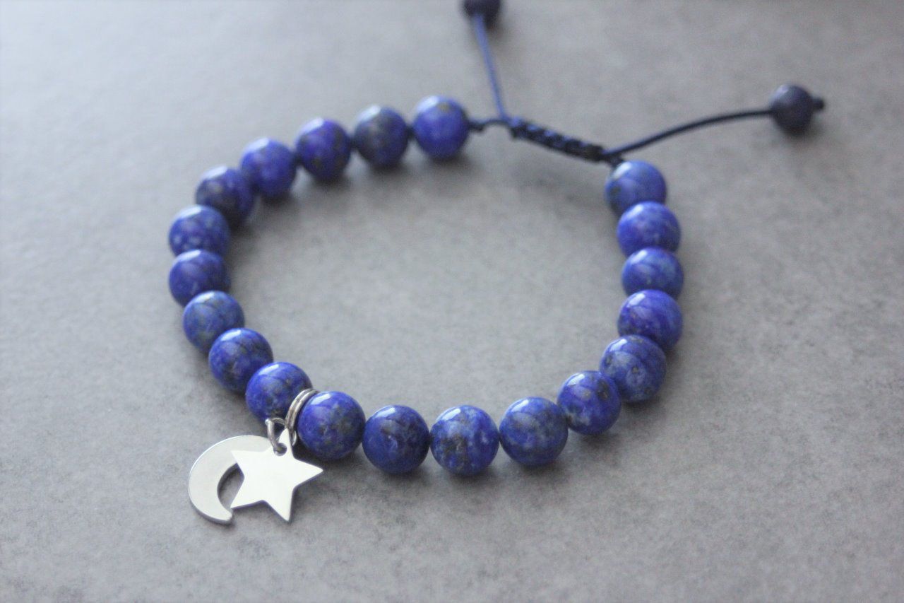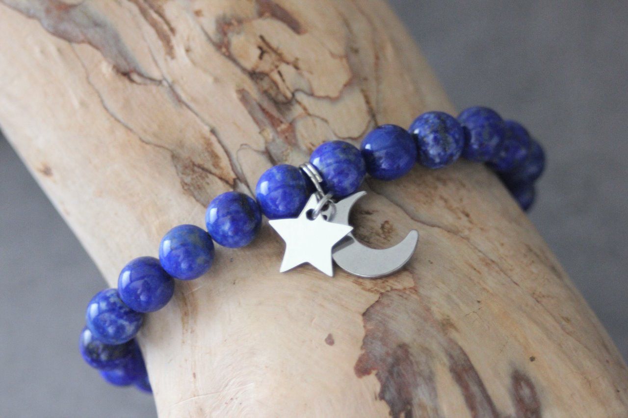 Bracelet en pierres naturelles semi-précieuses et acier inoxydable. Matériaux utilisés : perles lapis lazuli, et breloques lune et étoile en acier inoxydable. Fermoir coulissant (convient à tous les poignets)