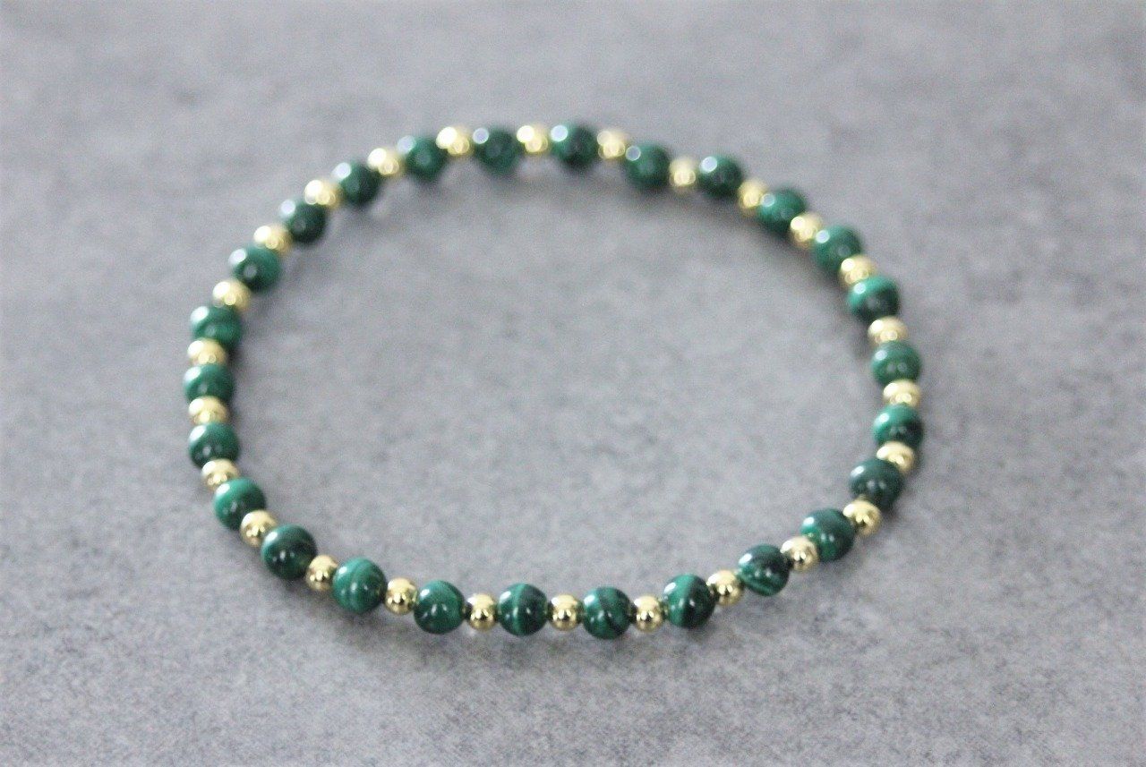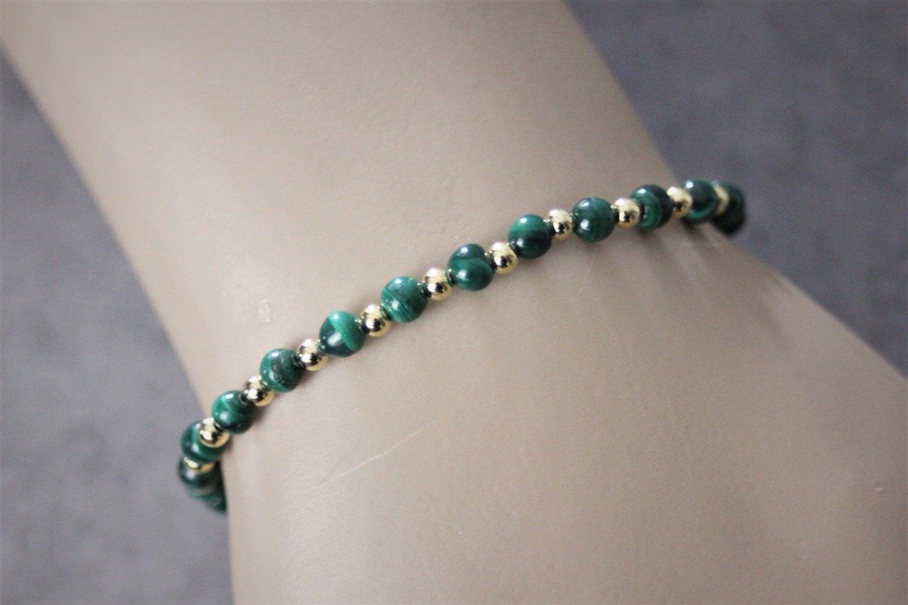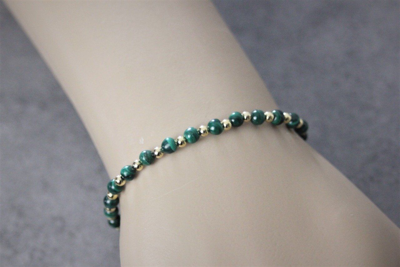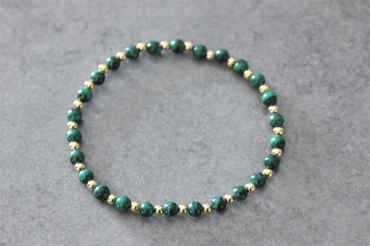 Bracelet femme en pierres naturelles, perles malachite et perles plaqué or - Bracelet pierres gemmes Ø4mm