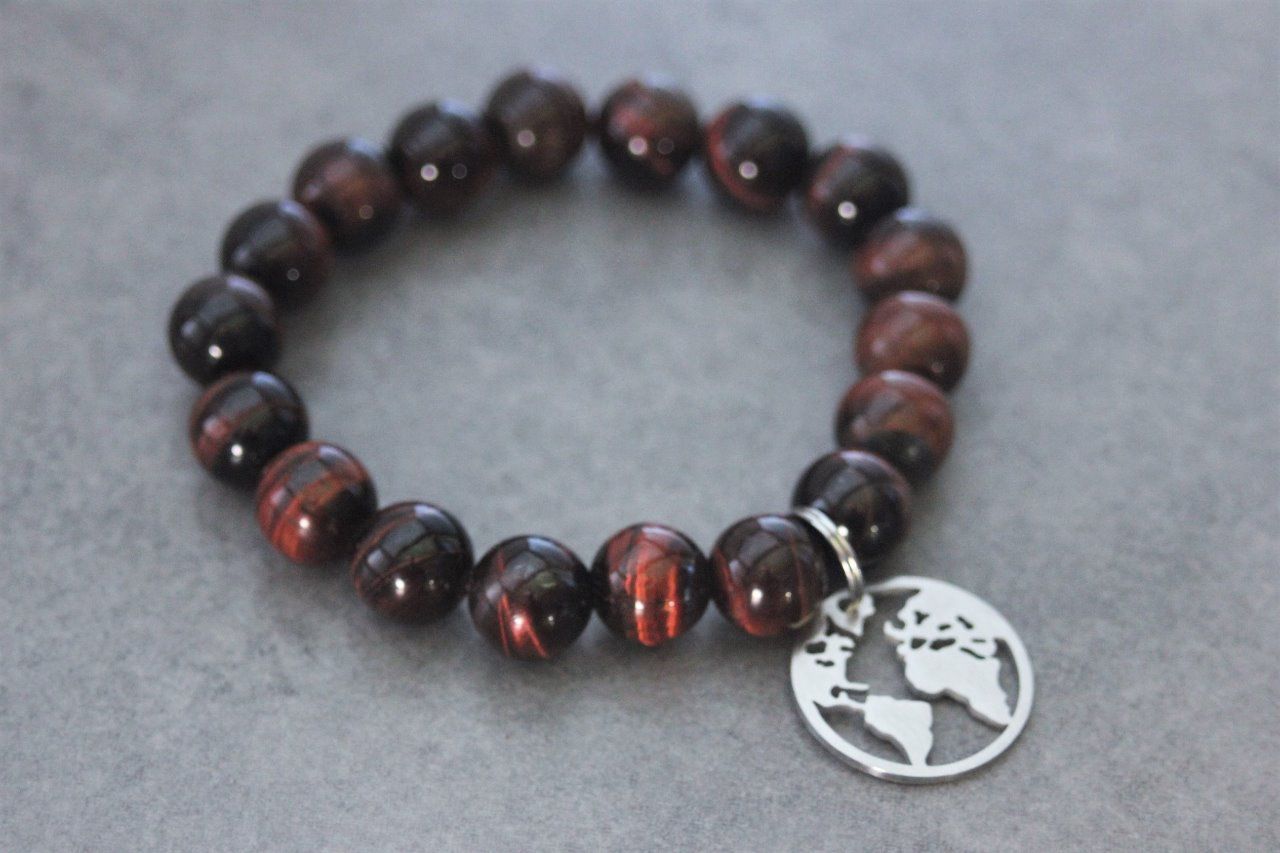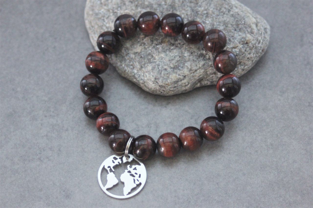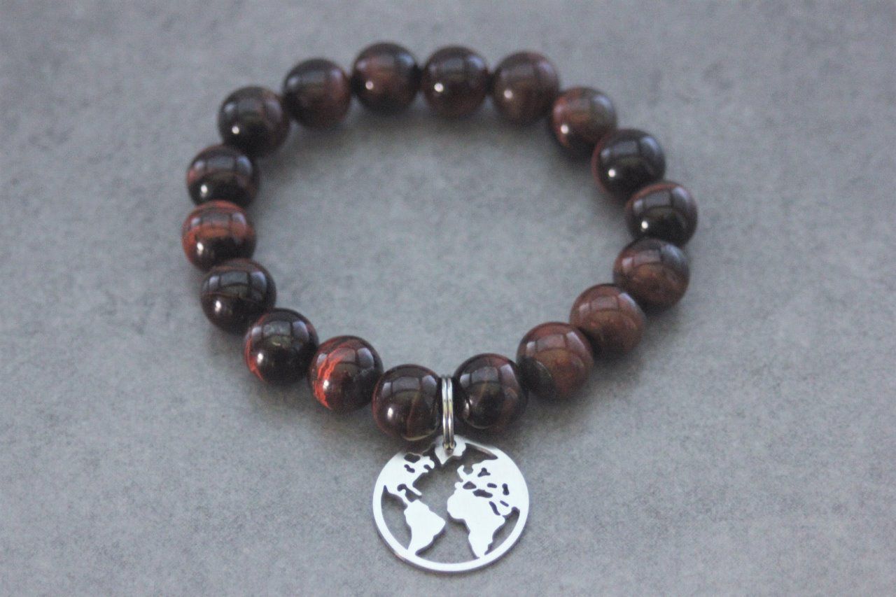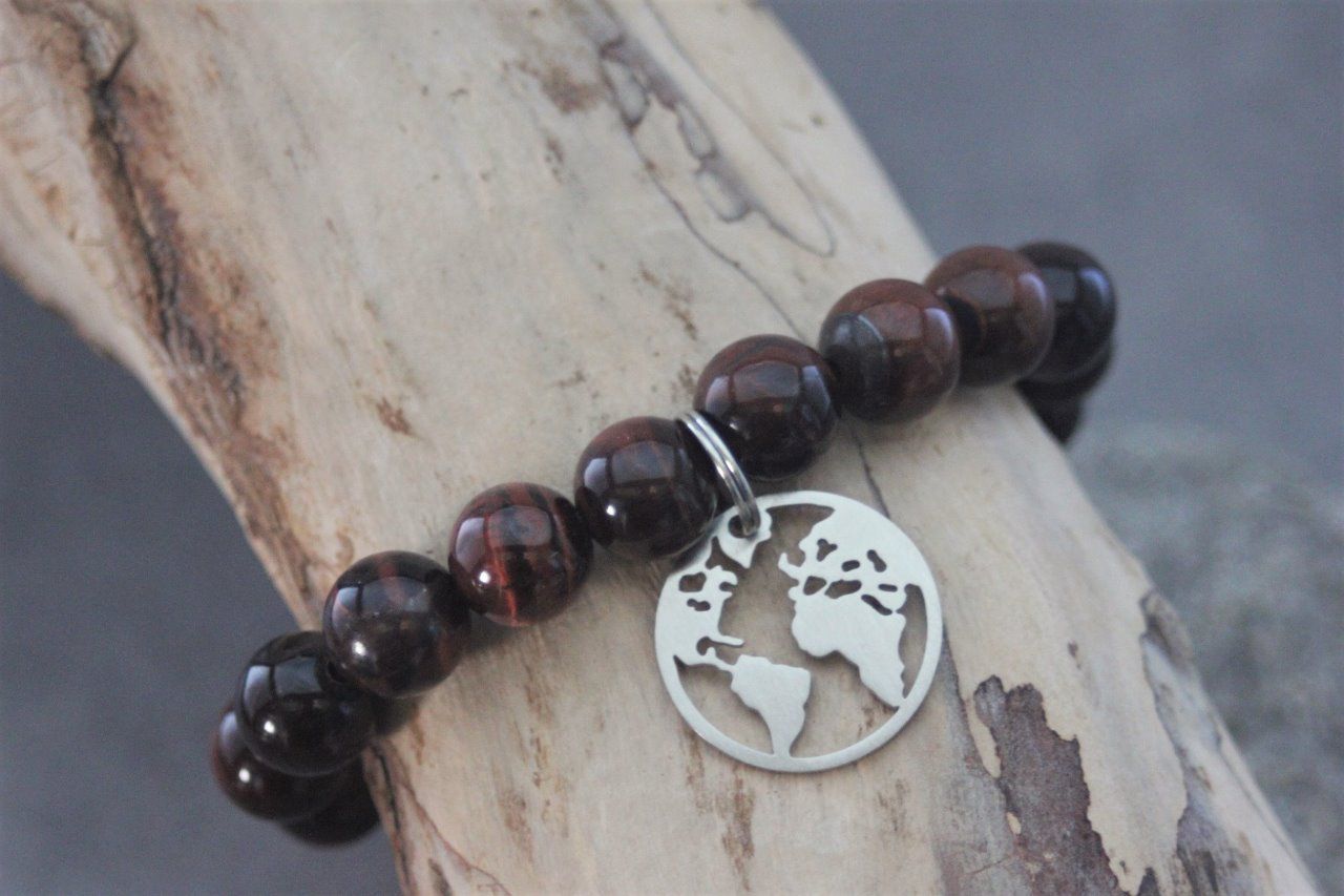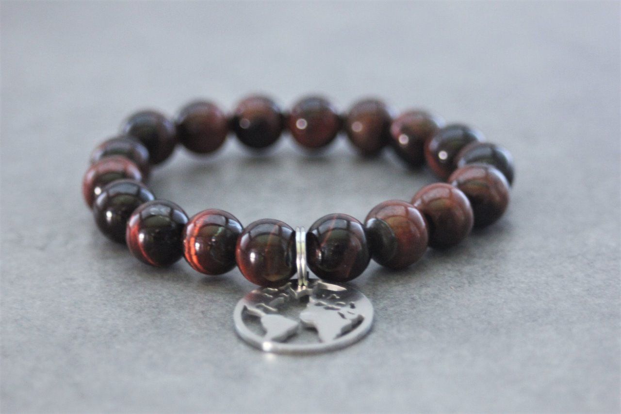 Bracelet en pierres naturelles semi-précieuses et acier inoxydable. Matériaux utilisés : perles oeil de taureau et breloque carte du monde en acier inoxydable.