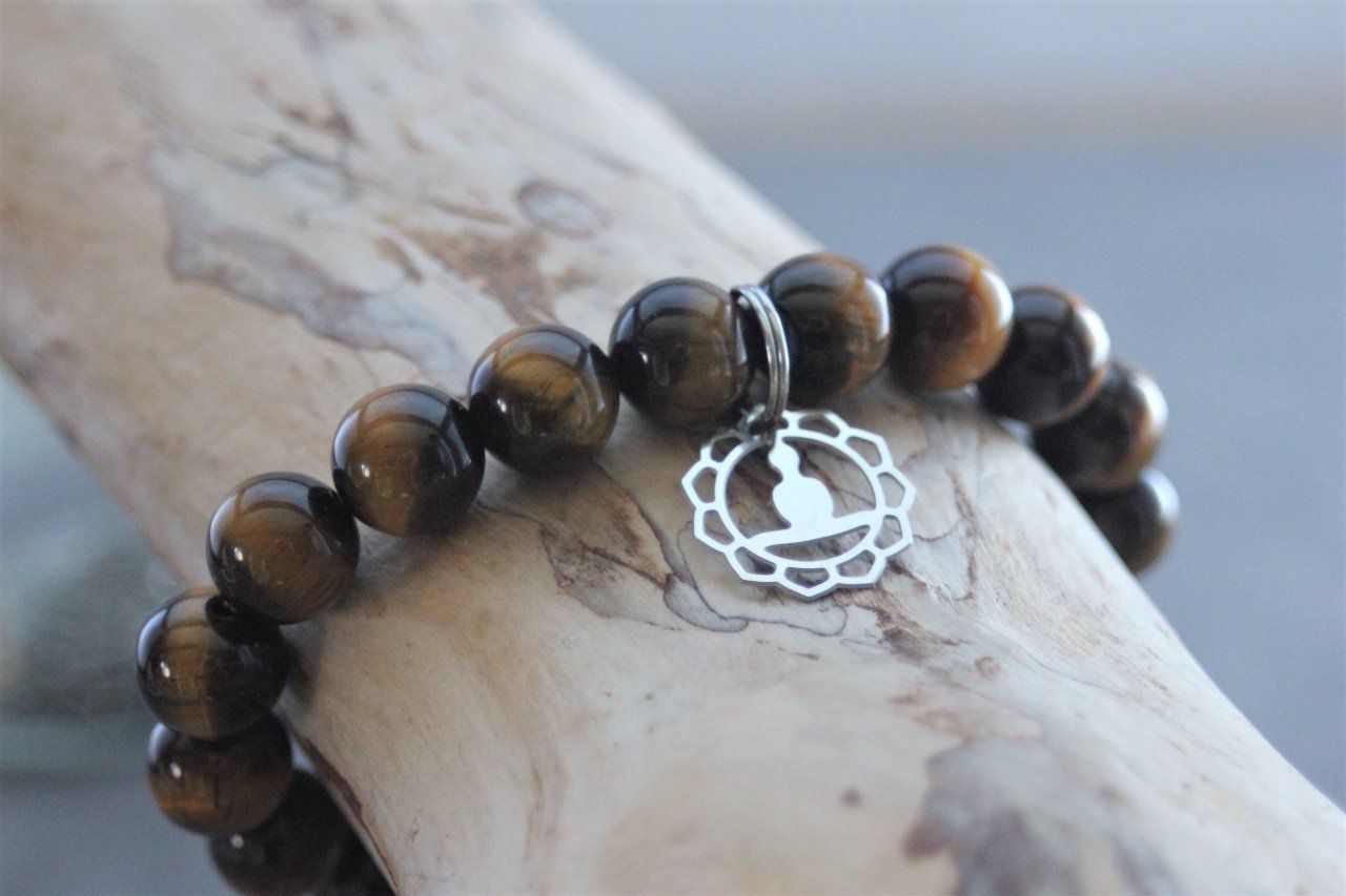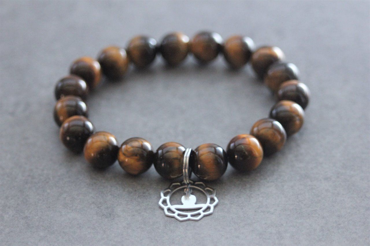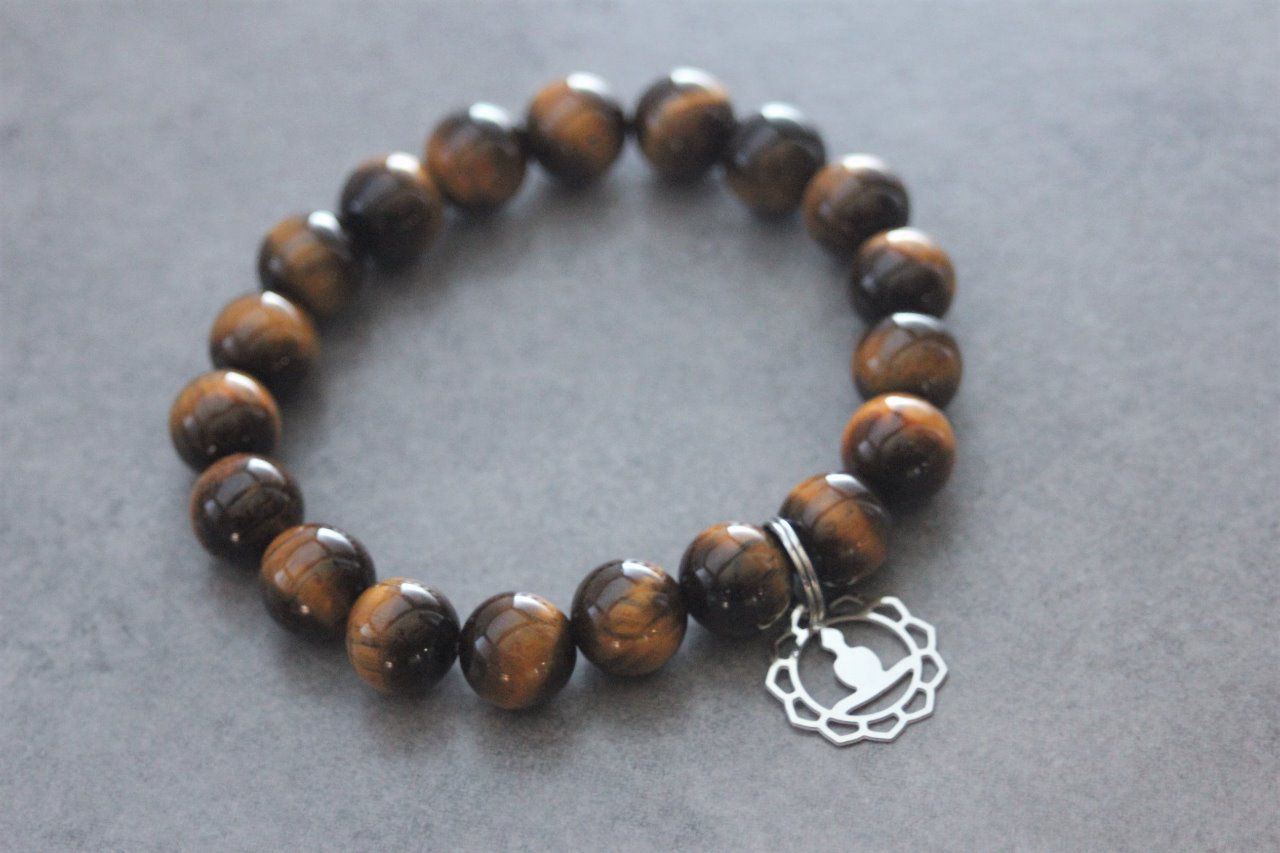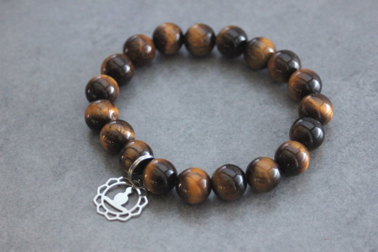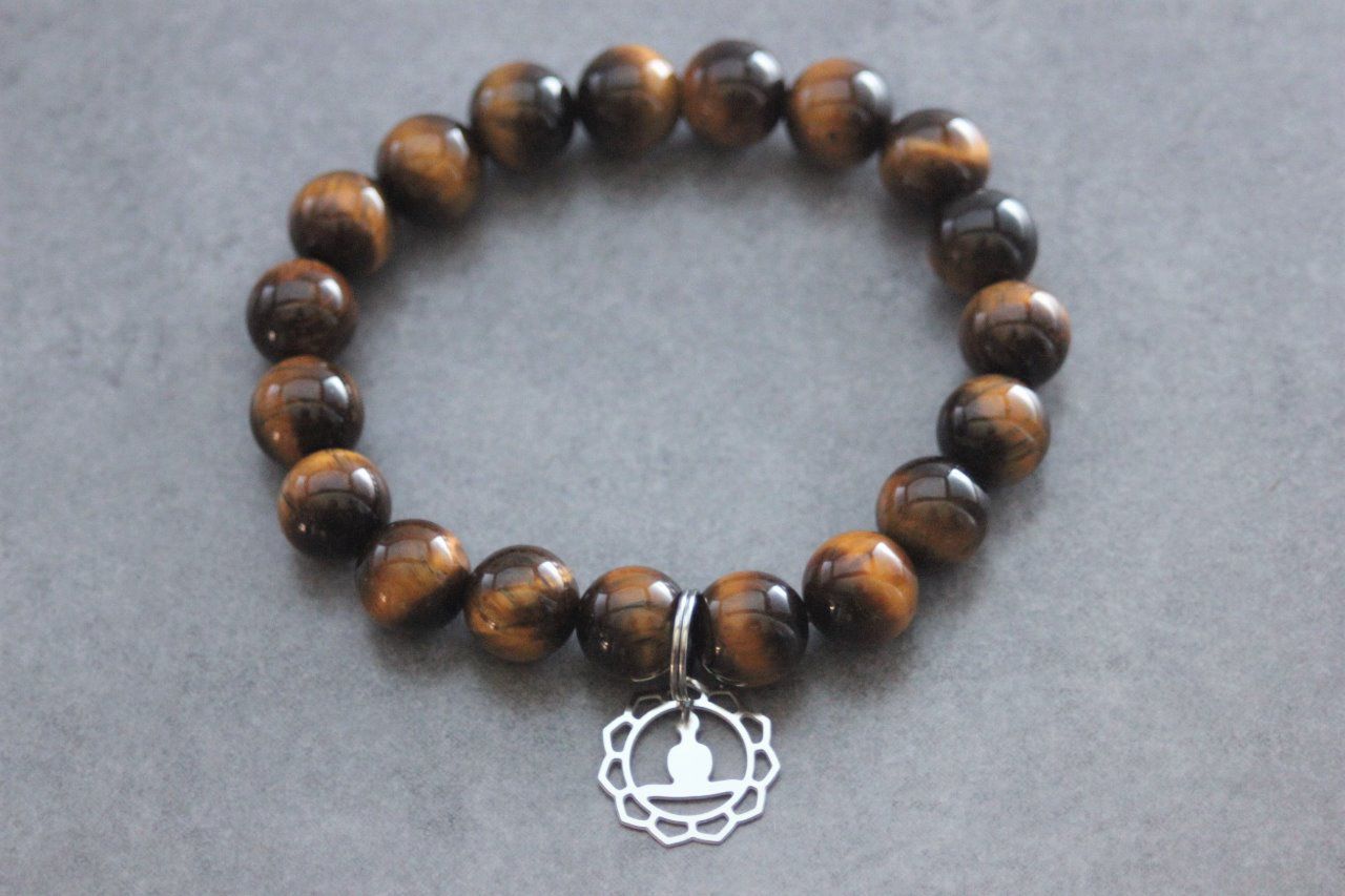 Bracelet en pierres naturelles semi-précieuses et acier inoxydable. Matériaux utilisés : perles oeil de tigre et breloque bouddha en acier inoxydable.