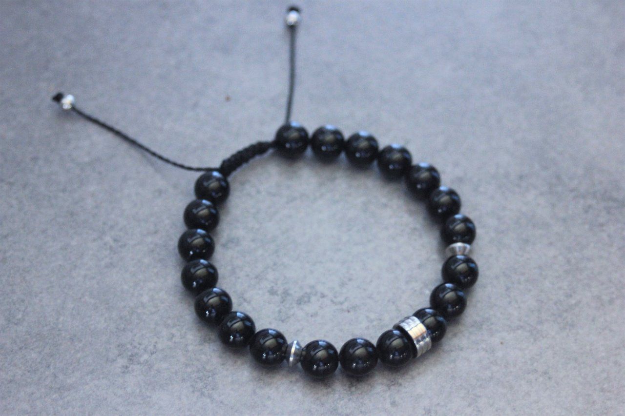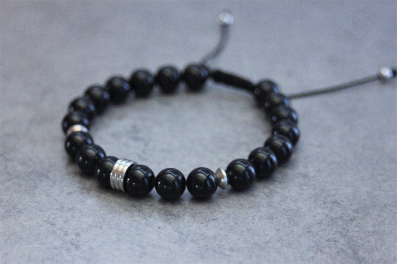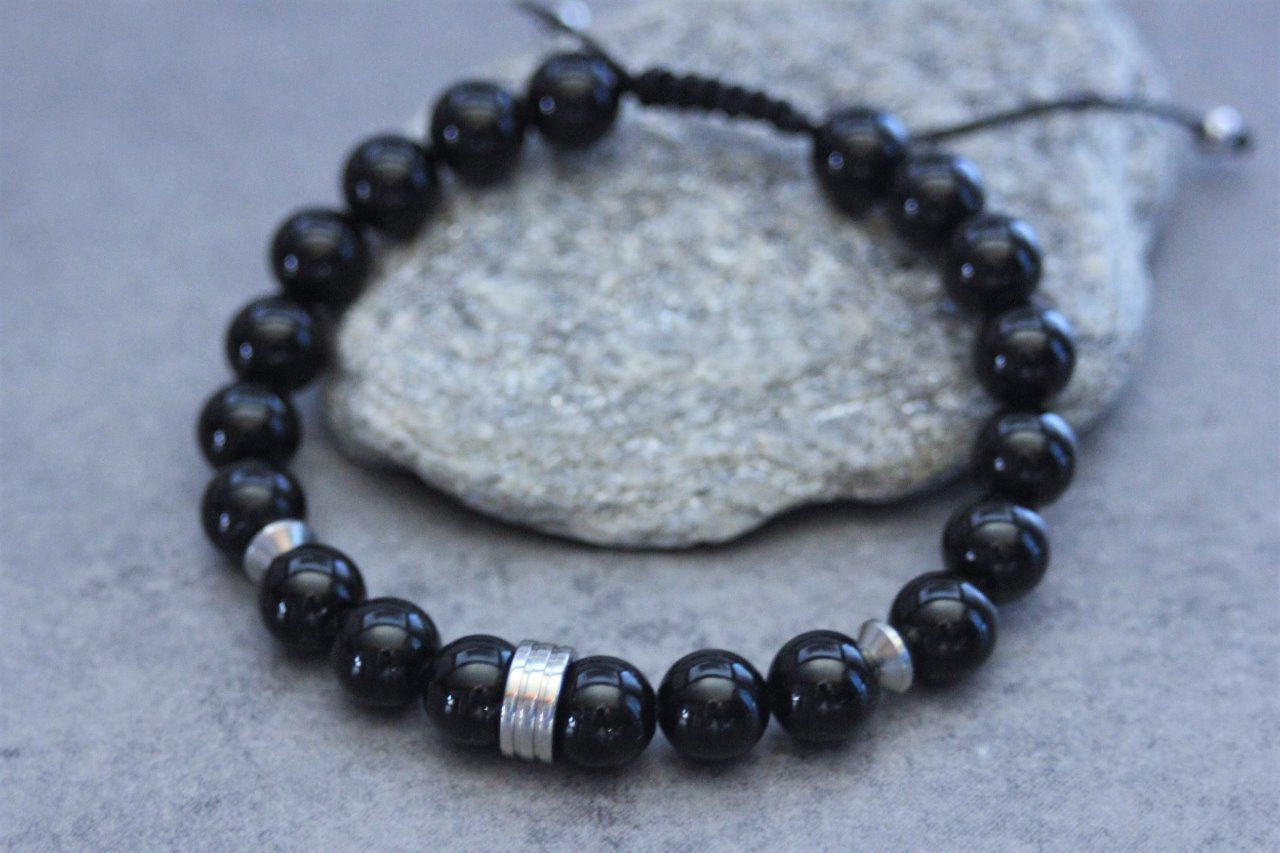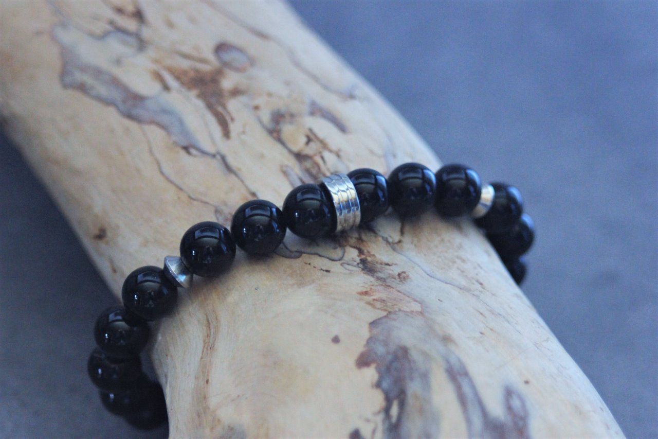 Bracelet en pierres naturelles semi-précieuses et acier inoxydable. Matériaux utilisés : perles onyx, perles en acier inoxydable. Fermoir coulissant (convient à tous les poignets)