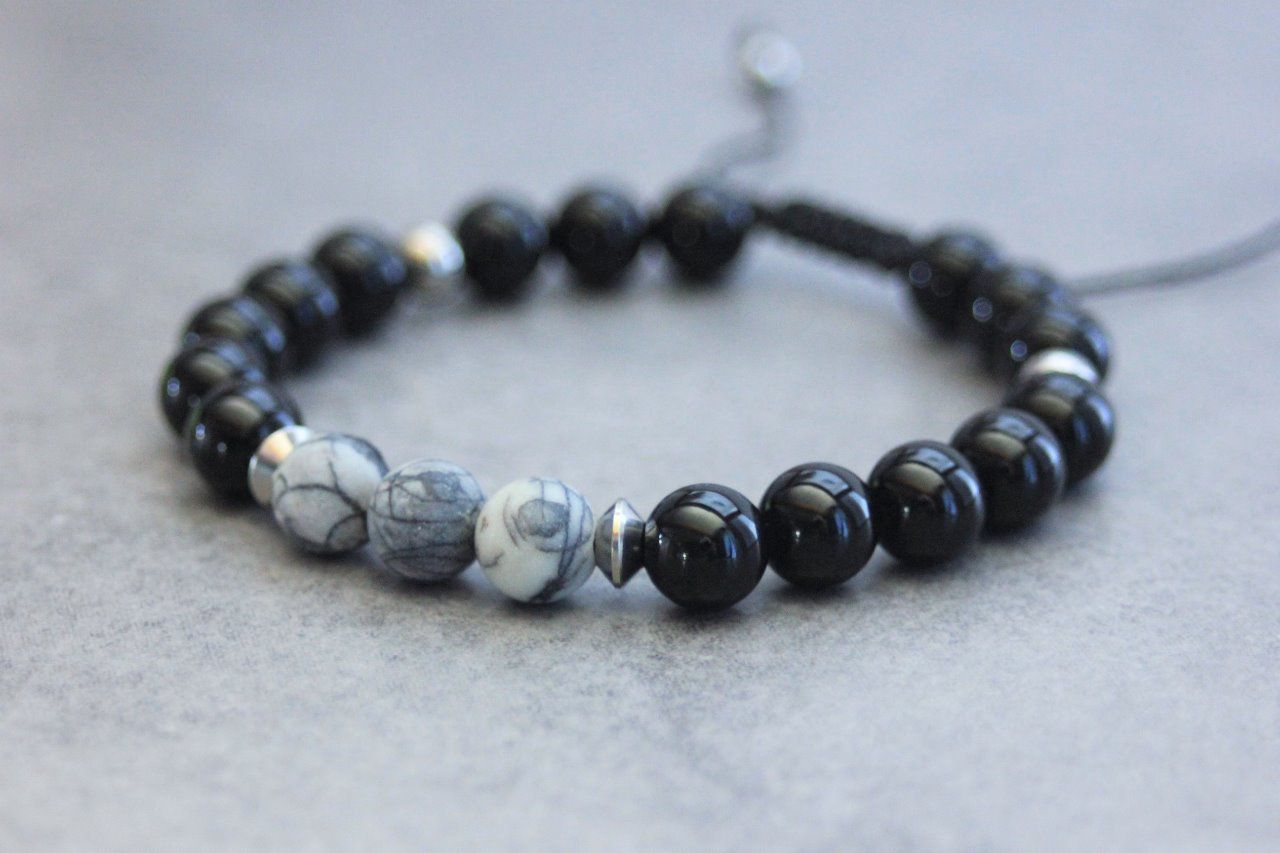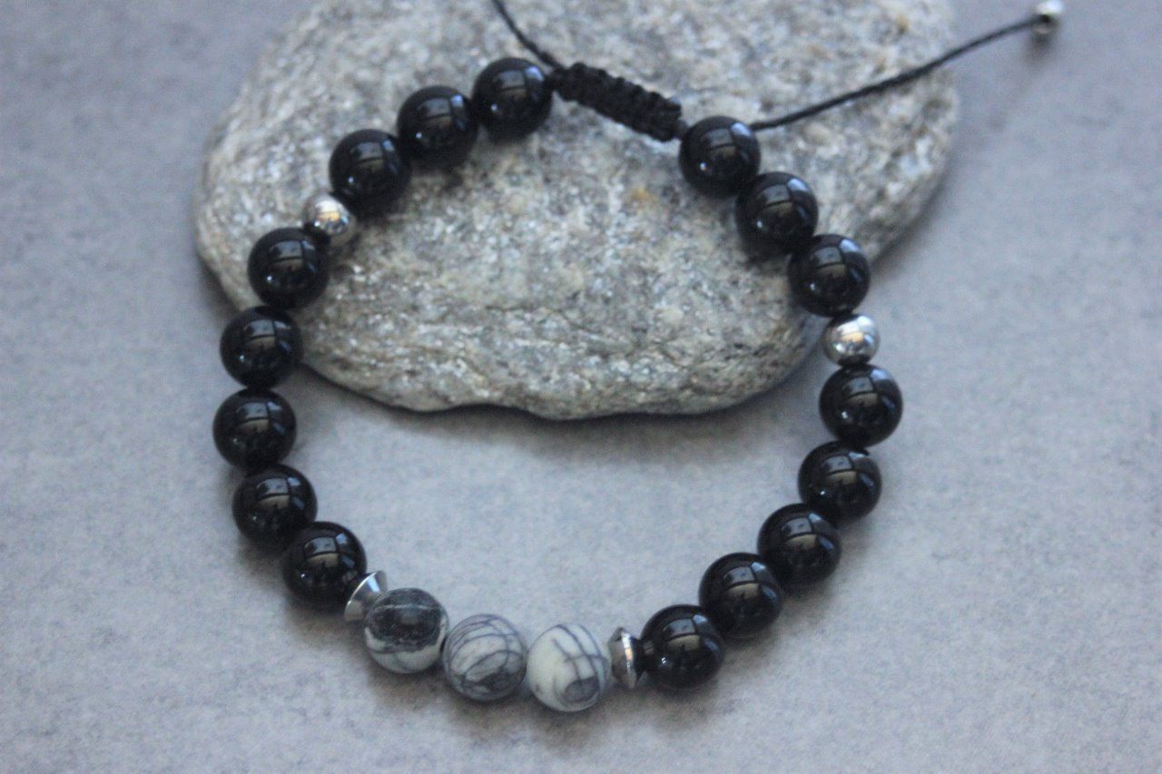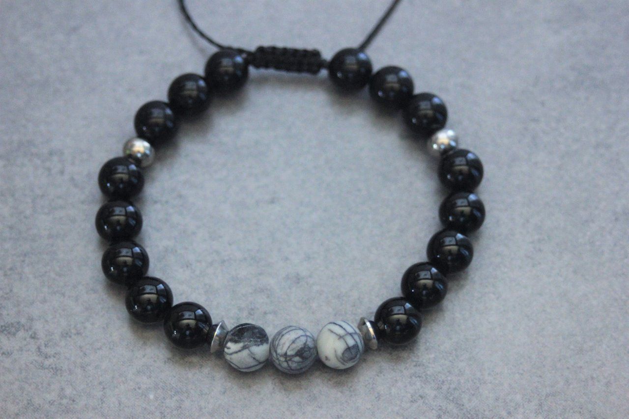 Bracelet en pierres naturelles semi-précieuses et acier inoxydable. Matériaux utilisés : perles onyx, perles jaspe picasso et perles acier inoxydable. Fermoir coulissant (convient à tous les poignets)