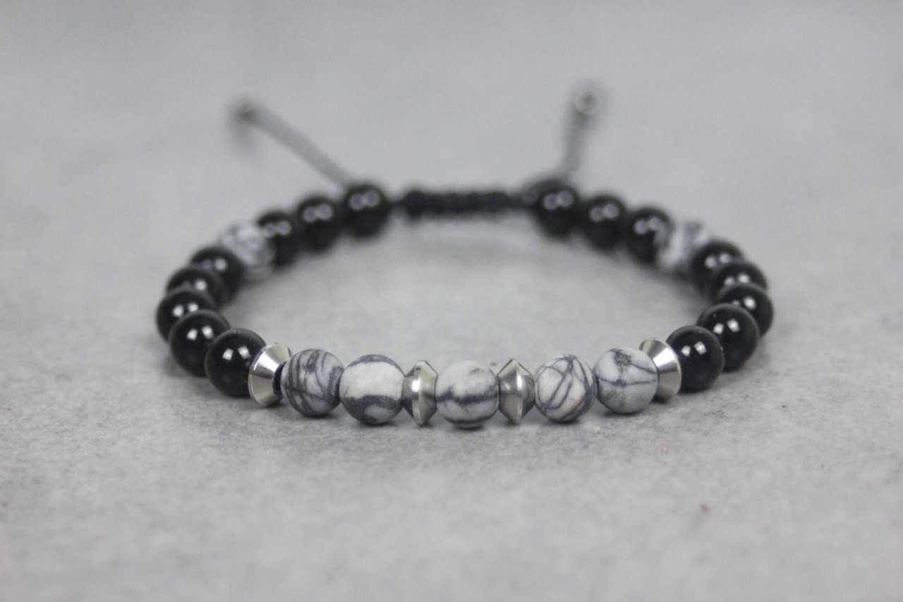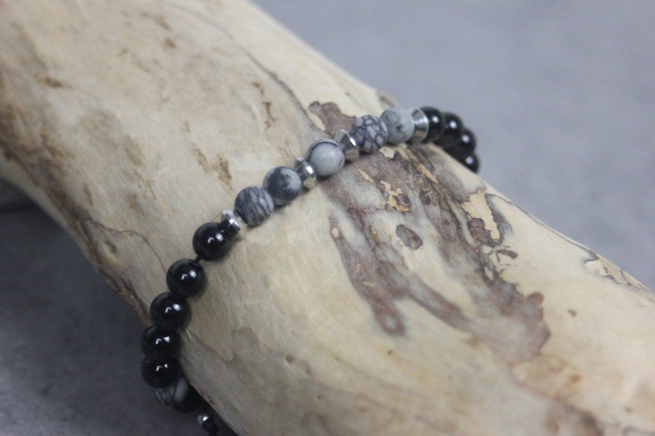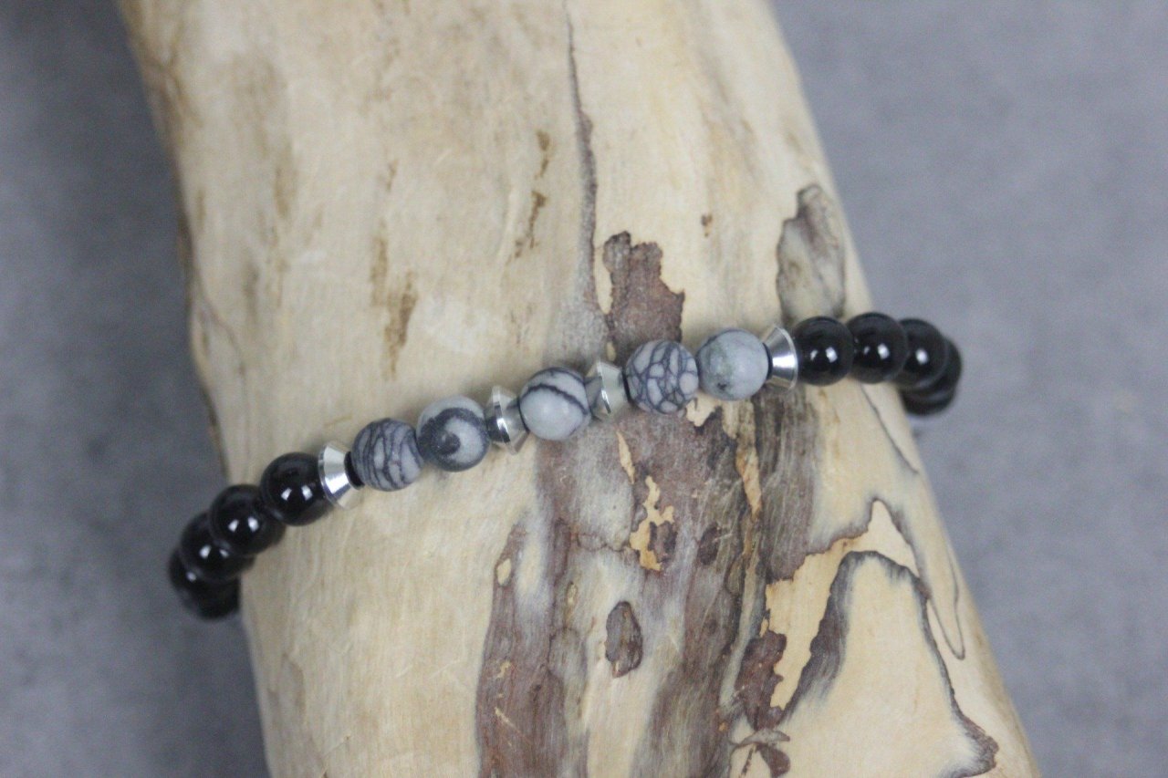Bracelet en pierres naturelles semi-précieuses et acier inoxydable. Matériaux utilisés : perles onyx, jaspe picasso mat et acier inoxydable. Fermoir coulissant (convient à tous les poignets)