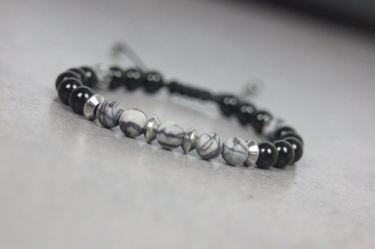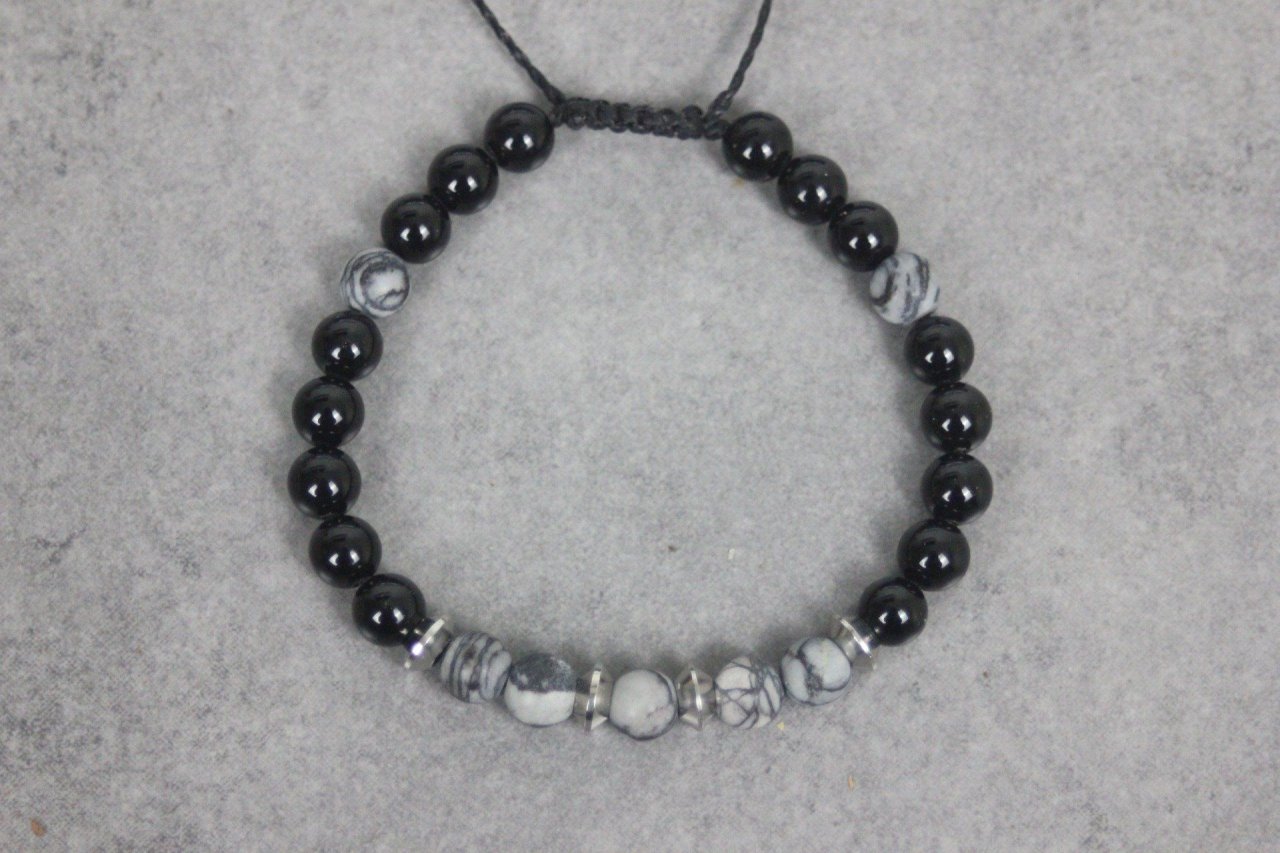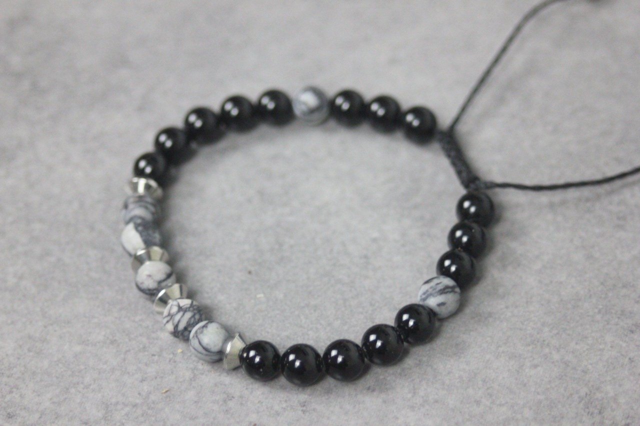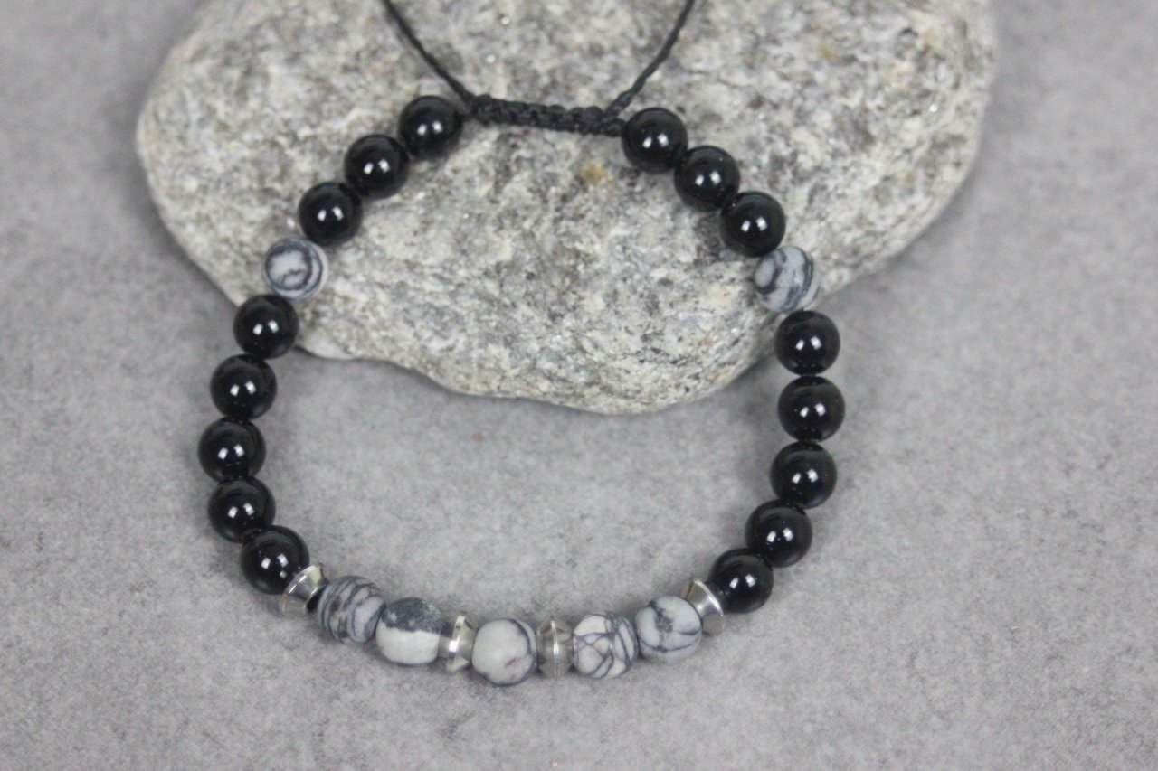 Bracelet en pierres naturelles semi-précieuses et acier inoxydable. Matériaux utilisés : perles onyx, jaspe picasso mat et acier inoxydable. Fermoir coulissant (convient à tous les poignets)