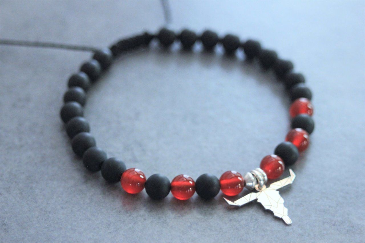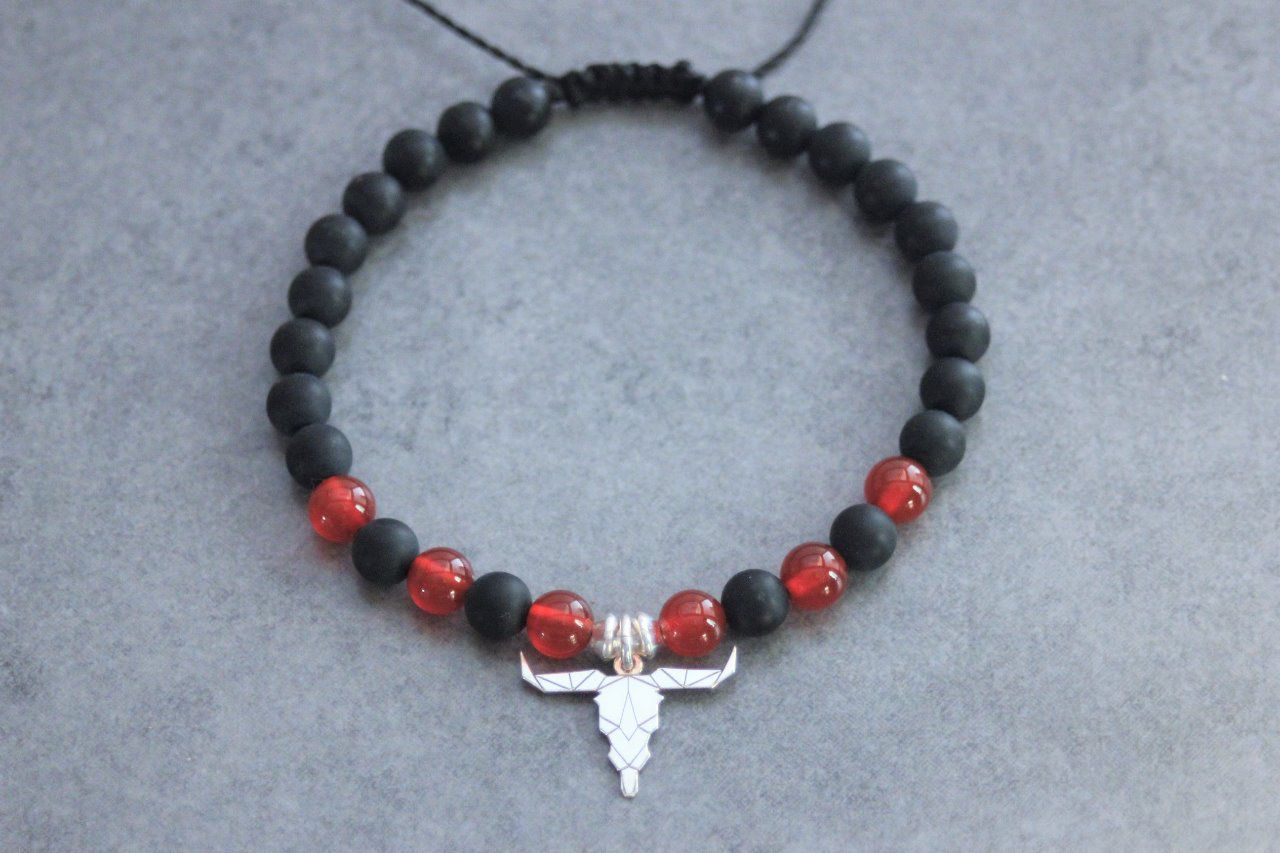Bracelet perles onyx mat, agate rouge et tête de buffle en argent 925
