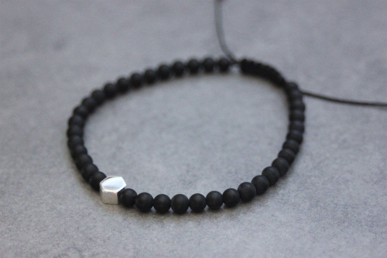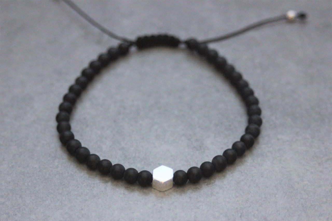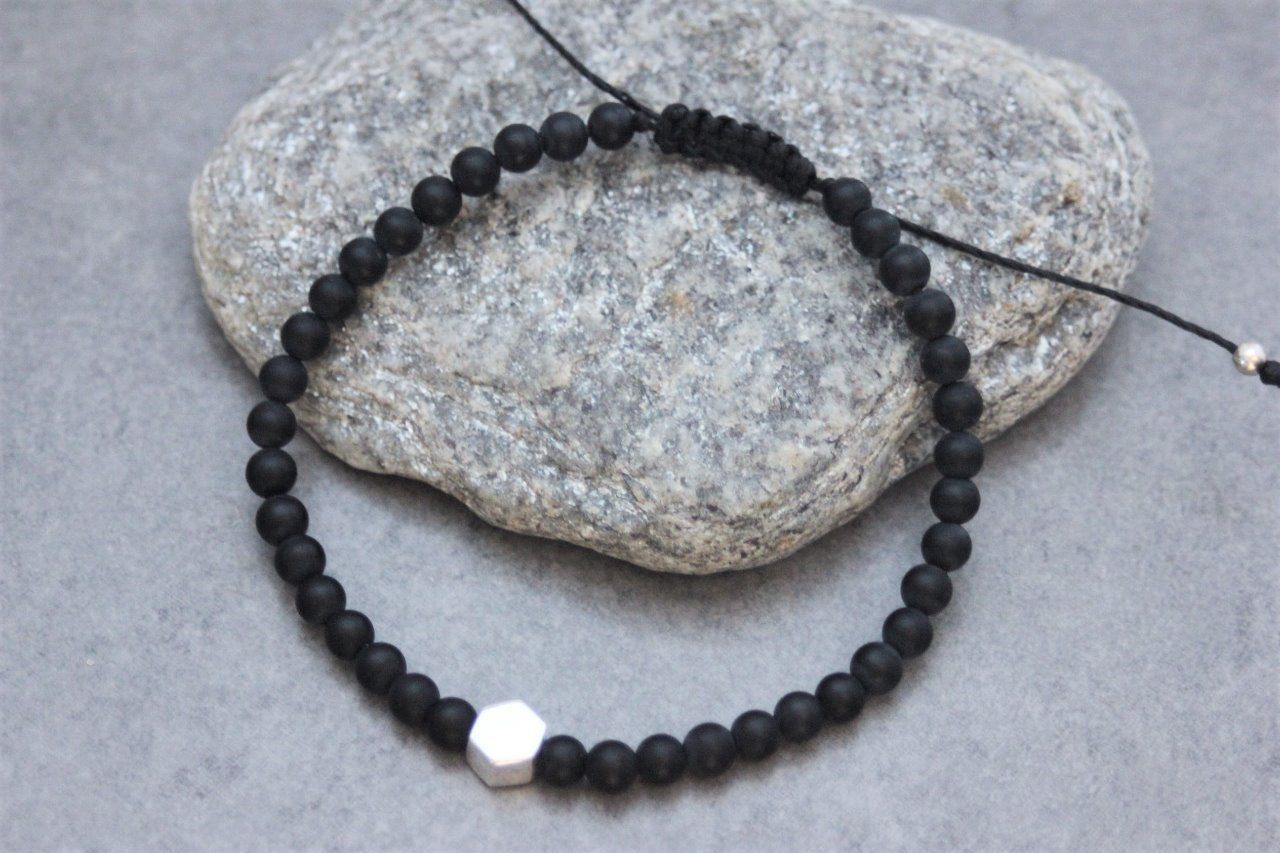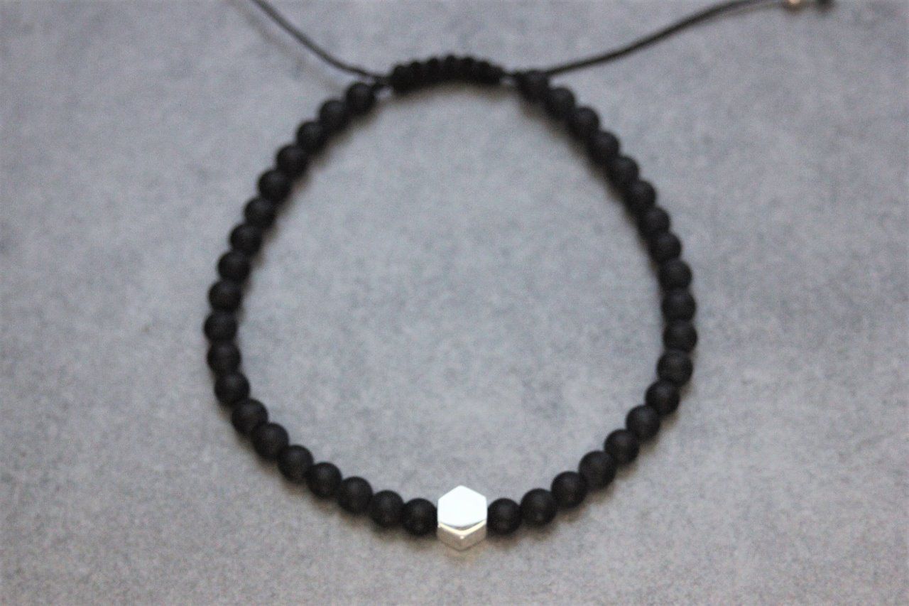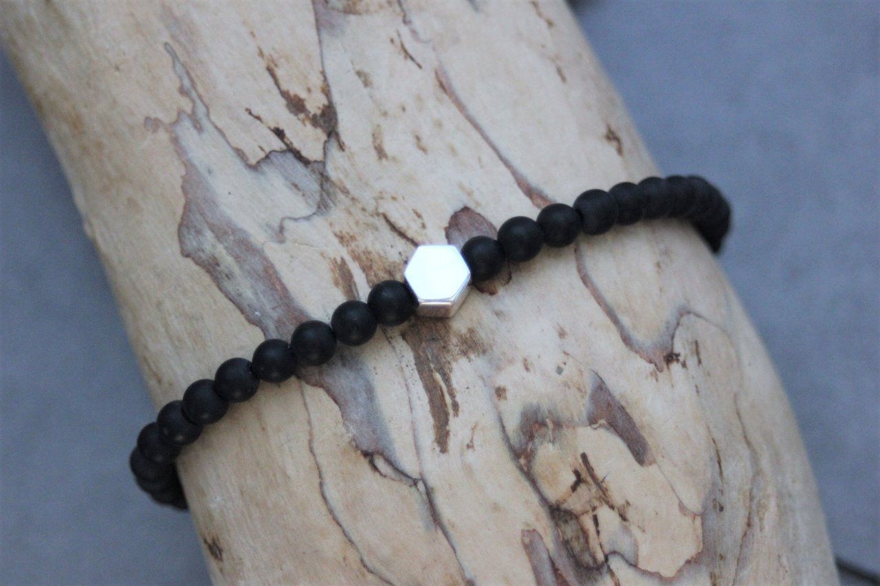 Bracelet perles onyx mat et perle hexagone en argent massif 925 - bracelet pierres naturelles - bracelet perle noir