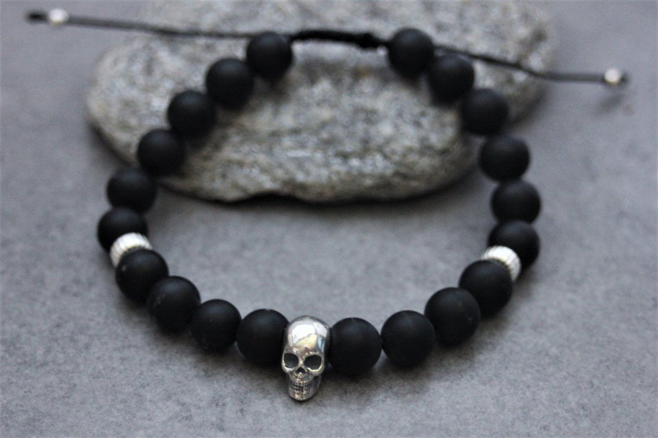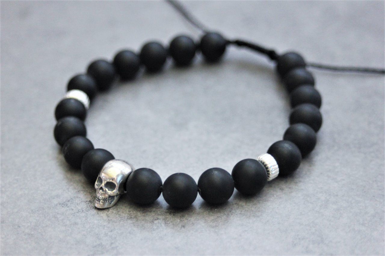 Bracelet perles onyx mat, argent massif et tête de mort argent 925 - bracelet pierres naturelles - bracelet gemmes - Bracelet skull