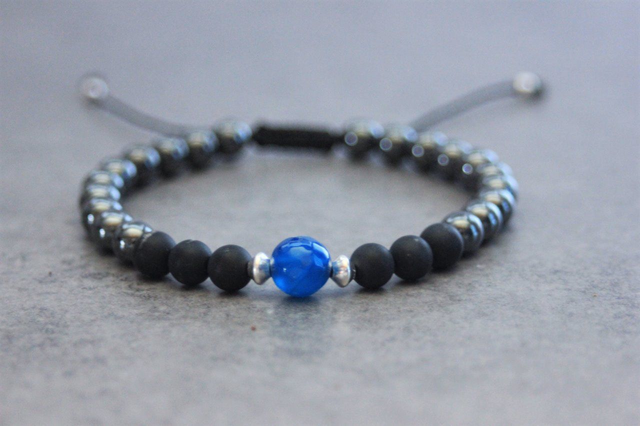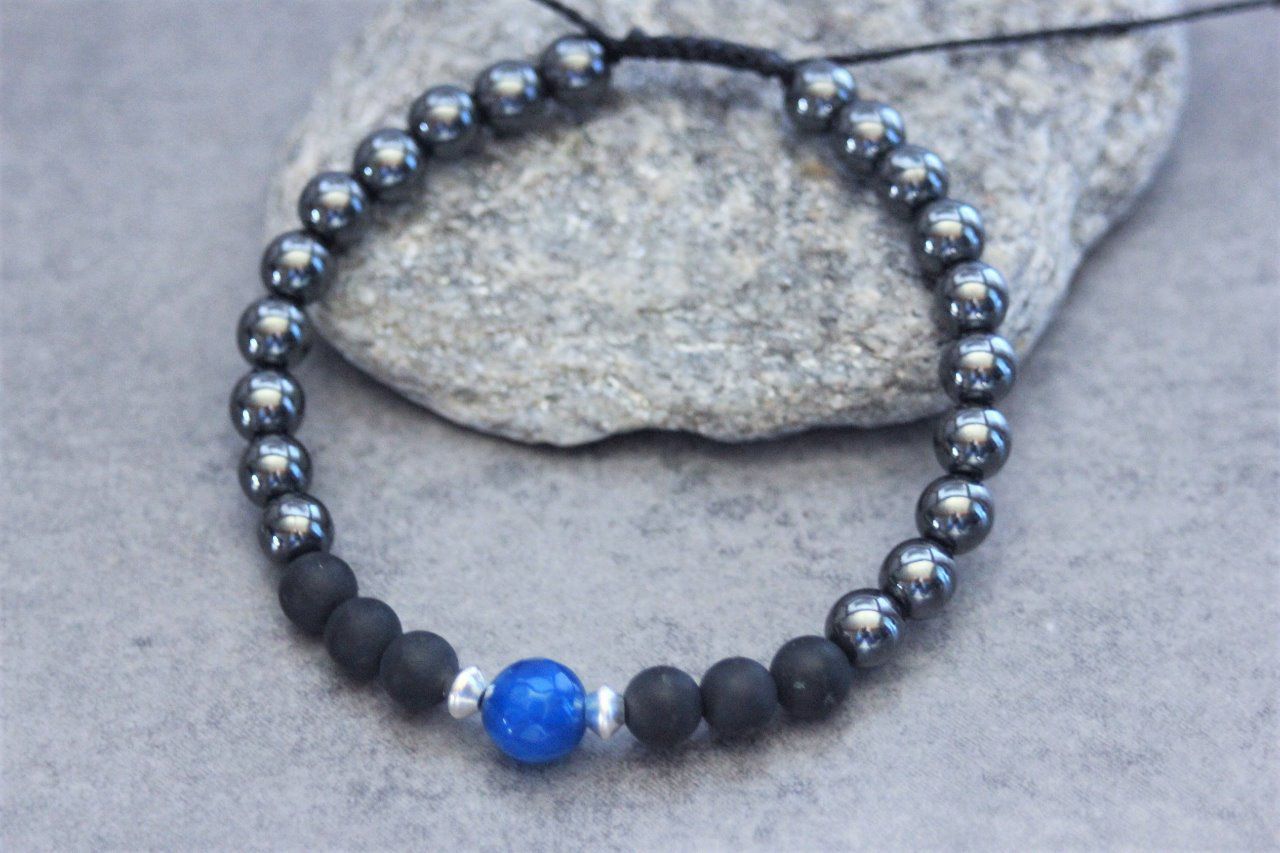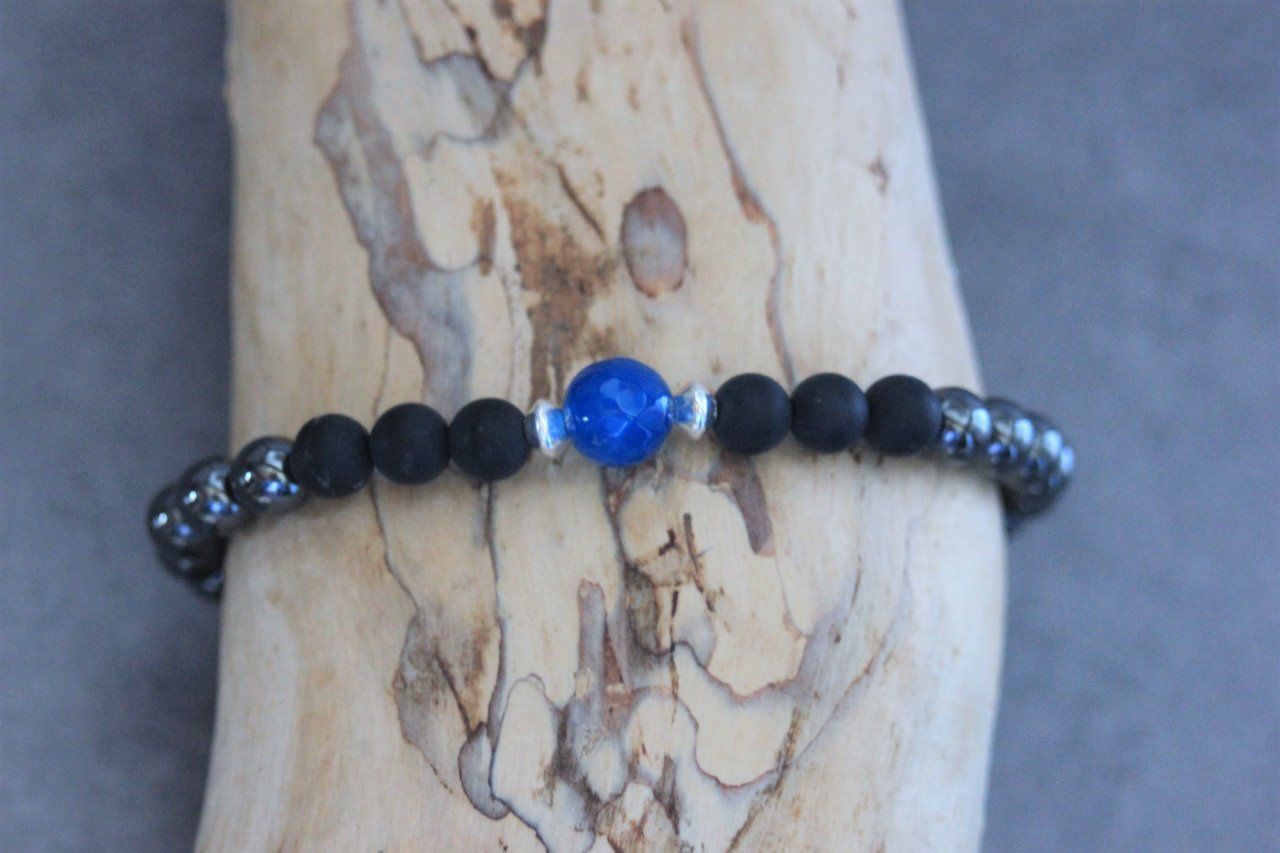 Bracelet perles onyx mat, hématite, agate bleu et argent 925
