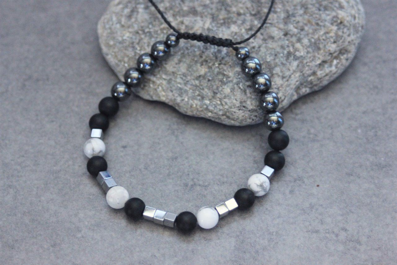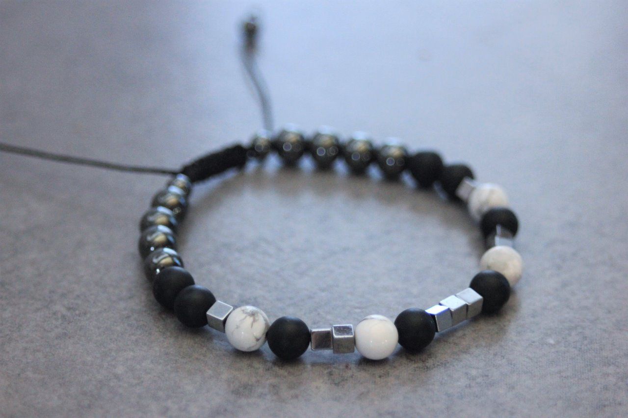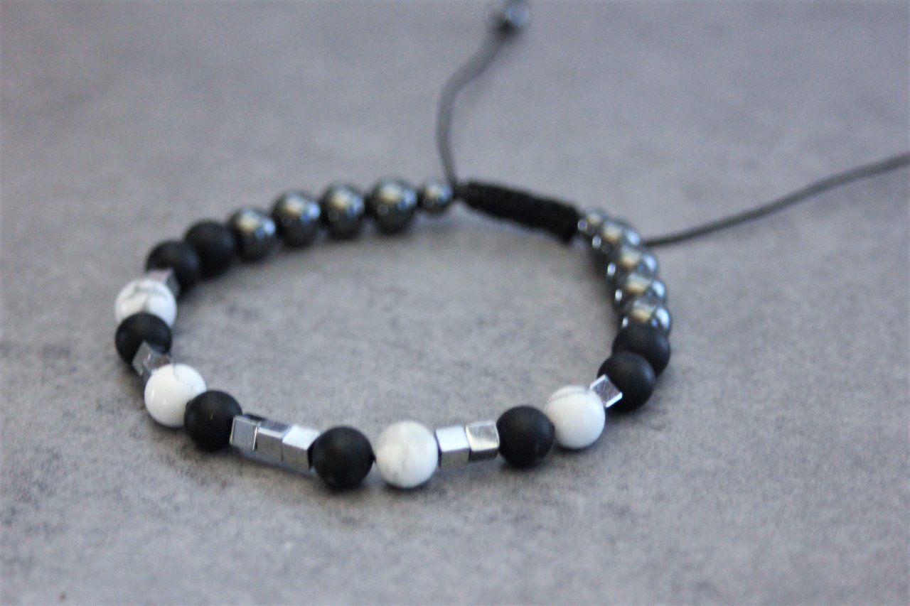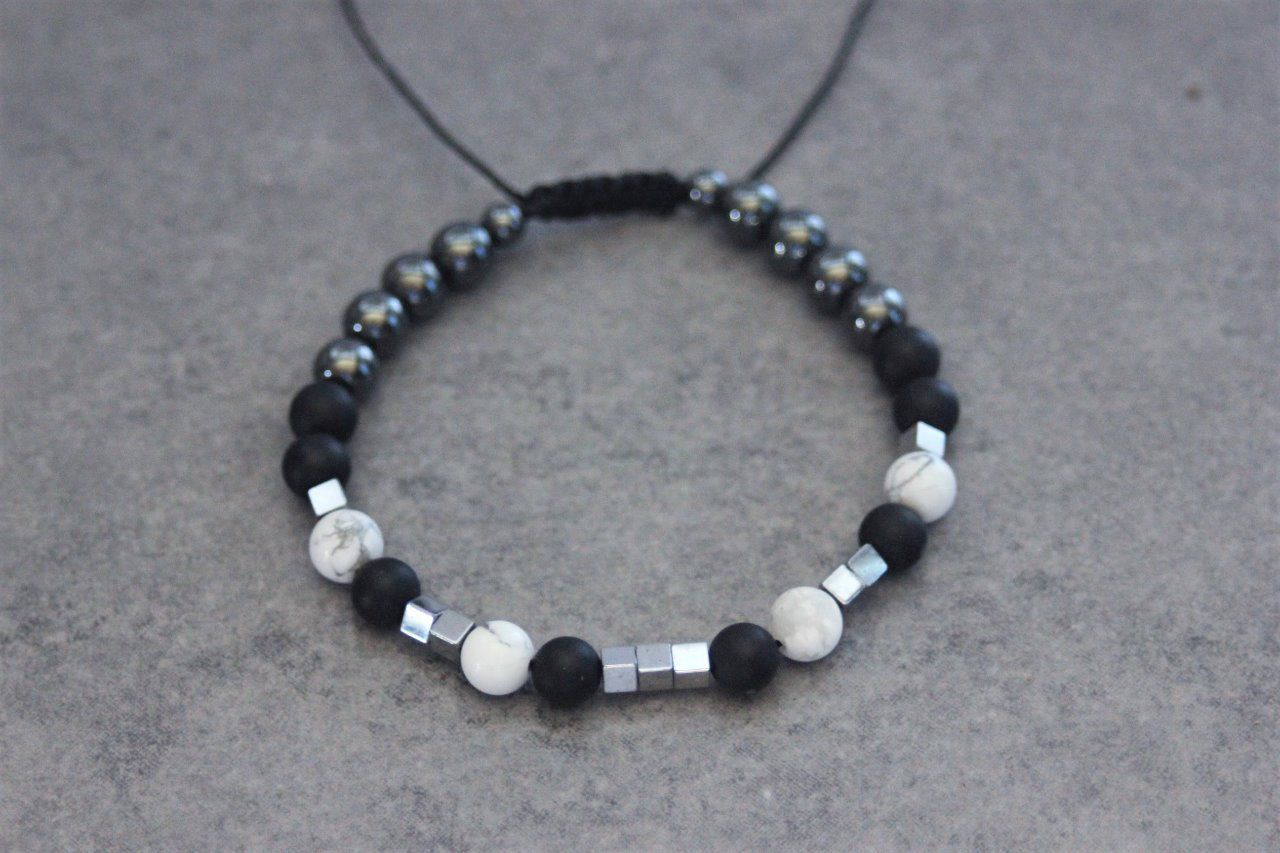 Bracelet en pierres naturelles semi-précieuses. Matériaux utilisés : perles onyx mat, perles howlite blanche et perles en hématite. Fermoir coulissant (convient à tous les poignets)