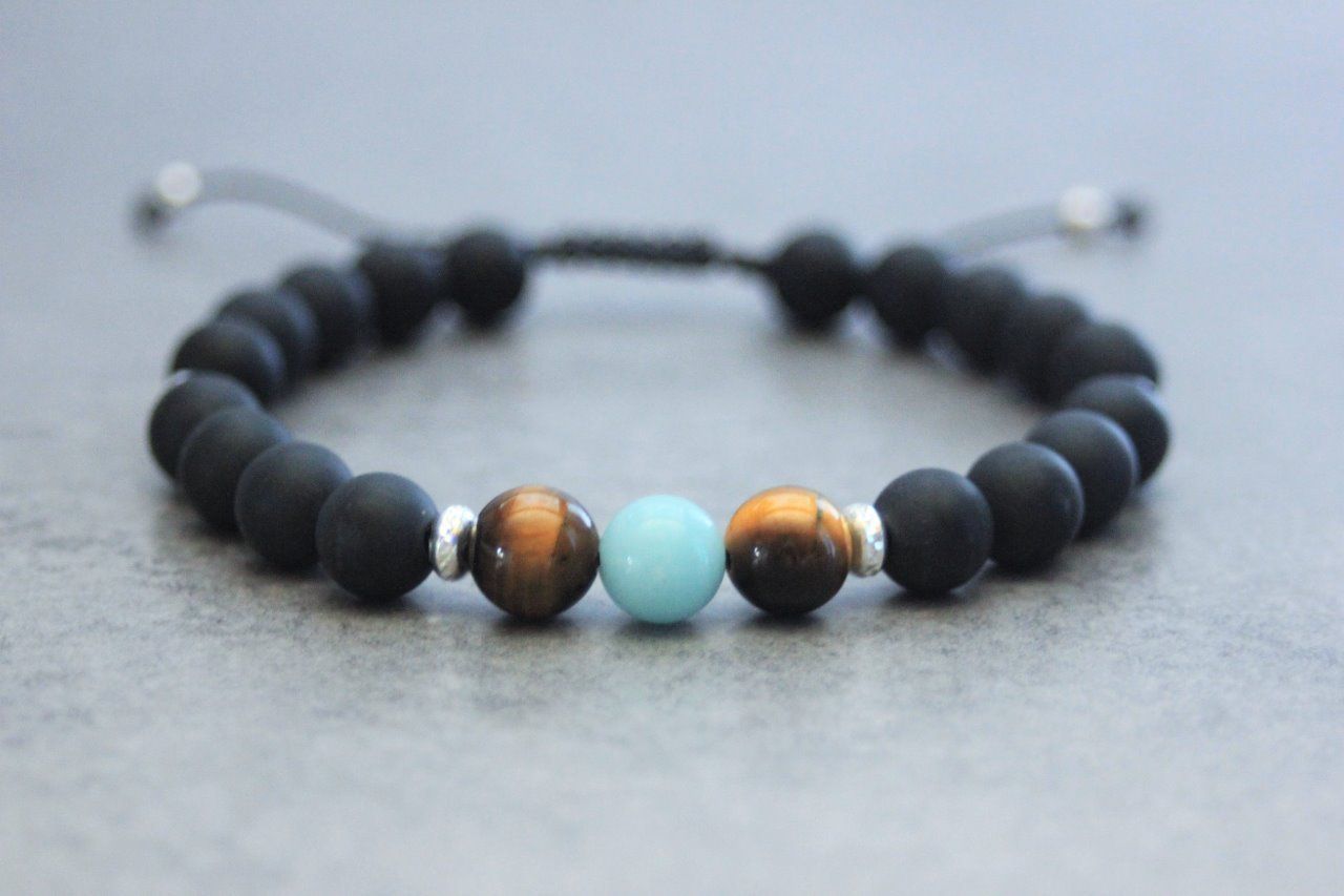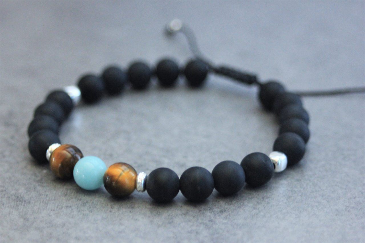 Bracelet perles onyx mat, oeil de tigre, amazonite et argent 925 - bracelet pierres naturelles - bracelet pierres gemmes - Bracelet homme