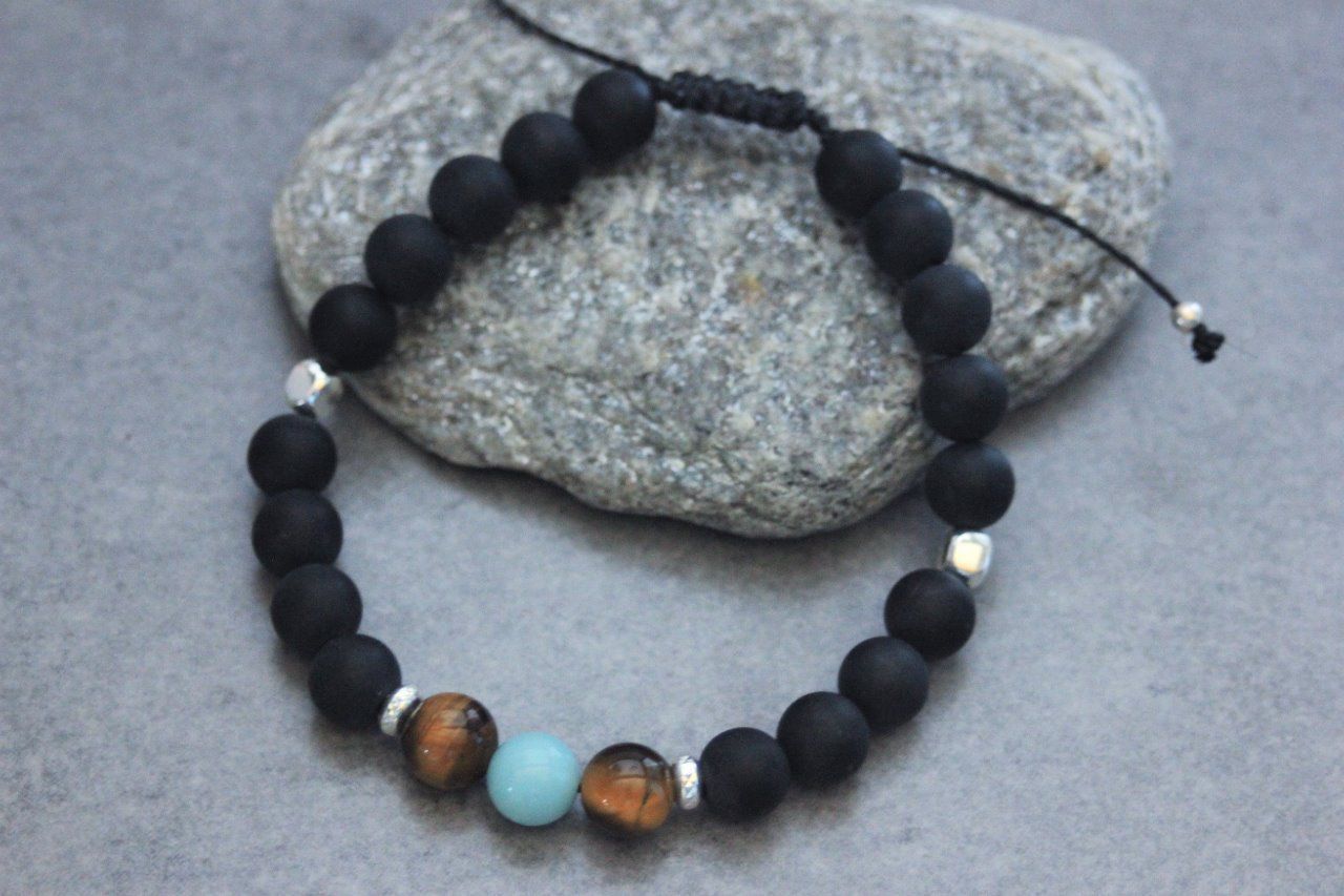 Bracelet en pierres naturelles semi-précieuses et argent massif 925. Matériaux utilisés : perles onyx mat, perles oeil de tigre, perle amazonite et perles argent massif 925. Fermoir coulissant (convient à tous les poignets)
