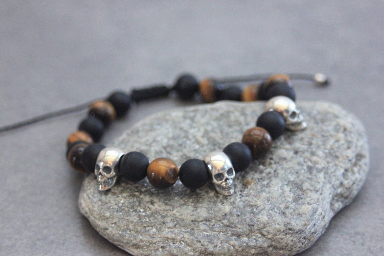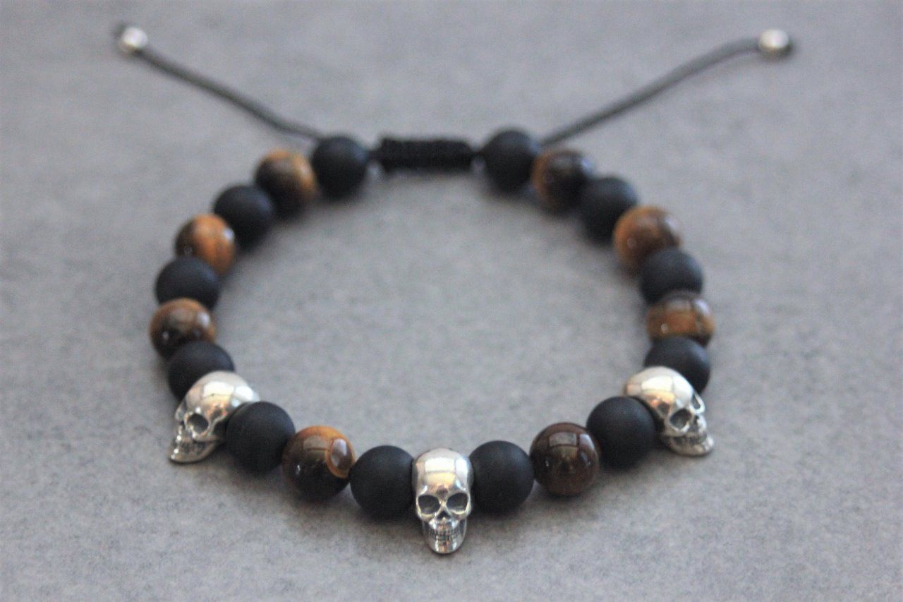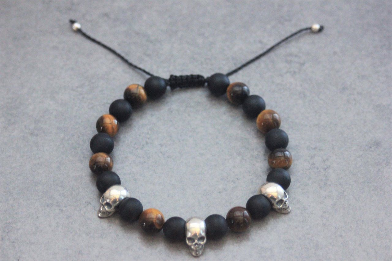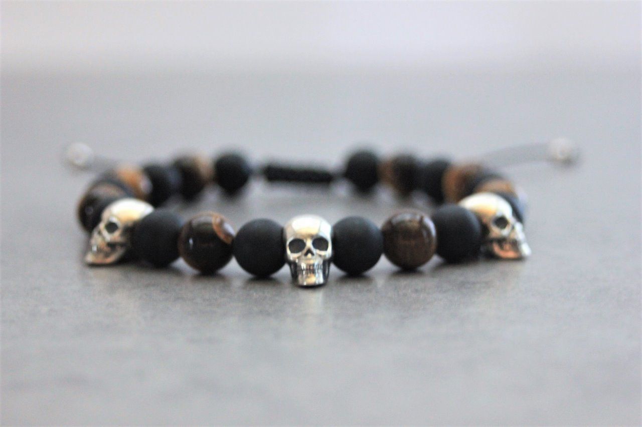Bracelet perles onyx mat, oeil de tigre et 3 têtes de mort argent 925