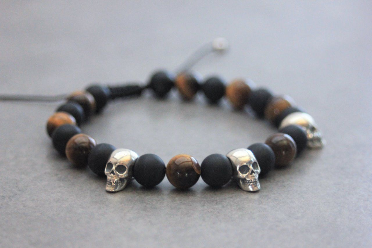 Bracelet en pierres naturelles semi-précieuses et argent massif 925. Matériaux utilisés : perles onyx mat, perles oeil de tigre et têtes de mort en argent massif 925. Fermoir coulissant (convient à tous les poignets)