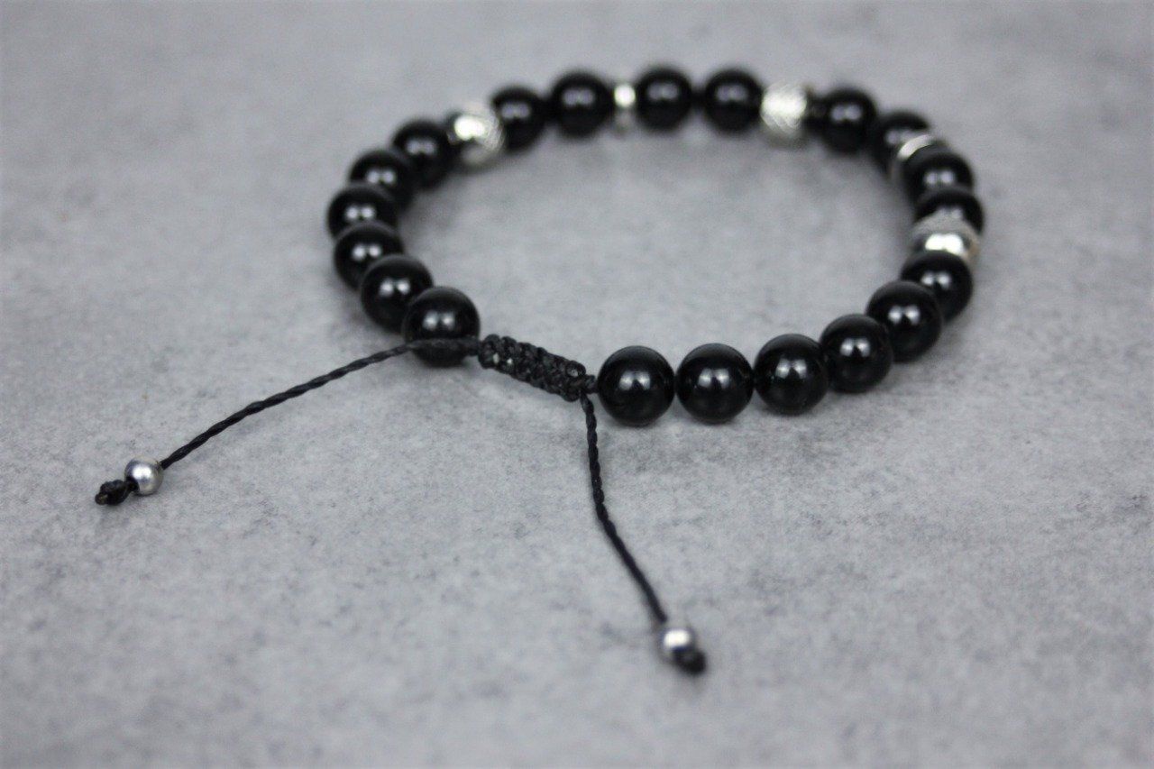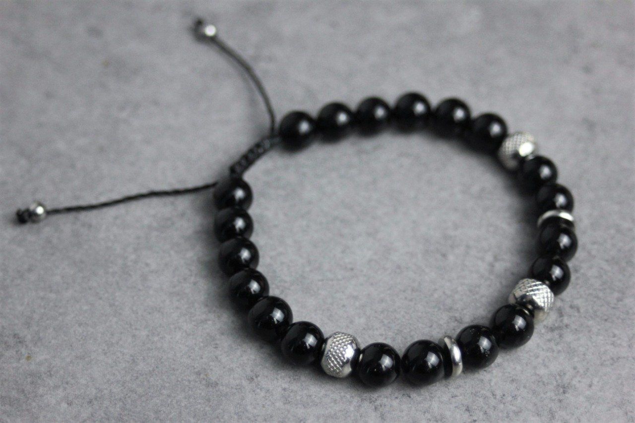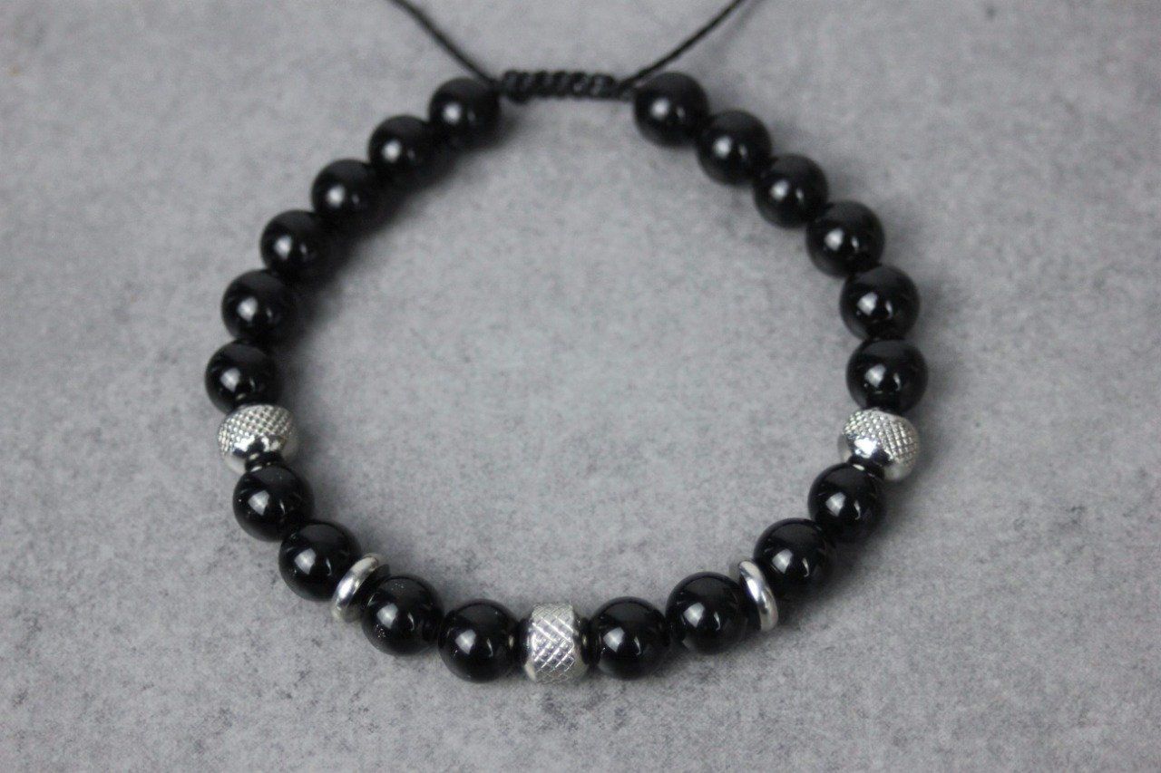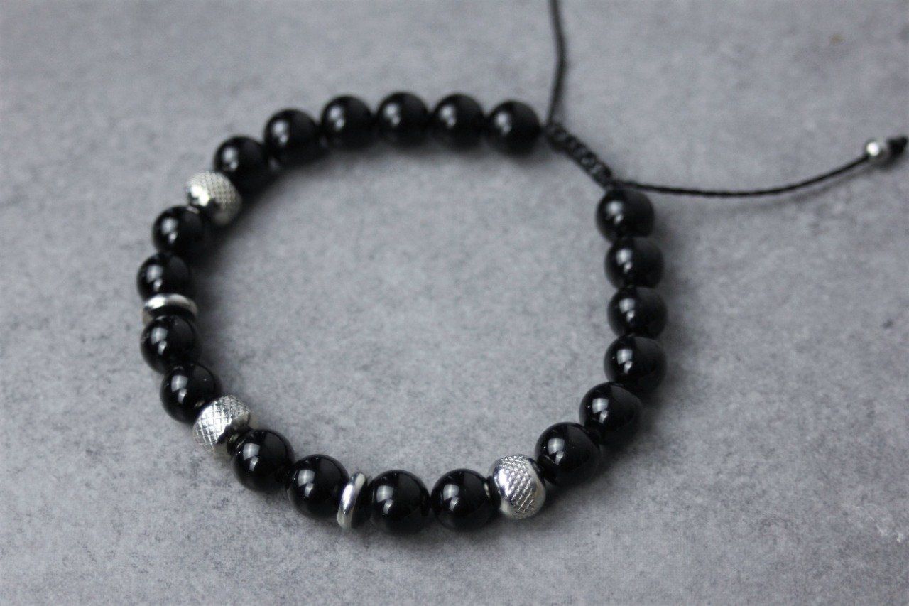 Bracelet en pierres naturelles semi-précieuses et acier inoxydable. Matériaux utilisés : perles onyx noir et perles en acier inoxydable. Fermoir coulissant (convient à tous les poignets)