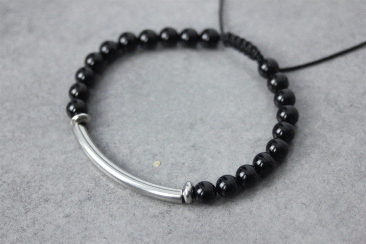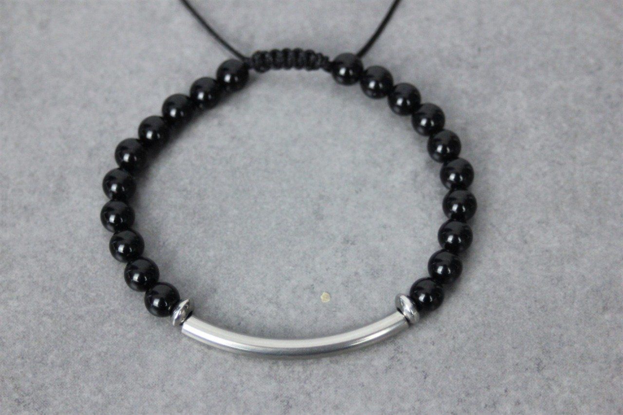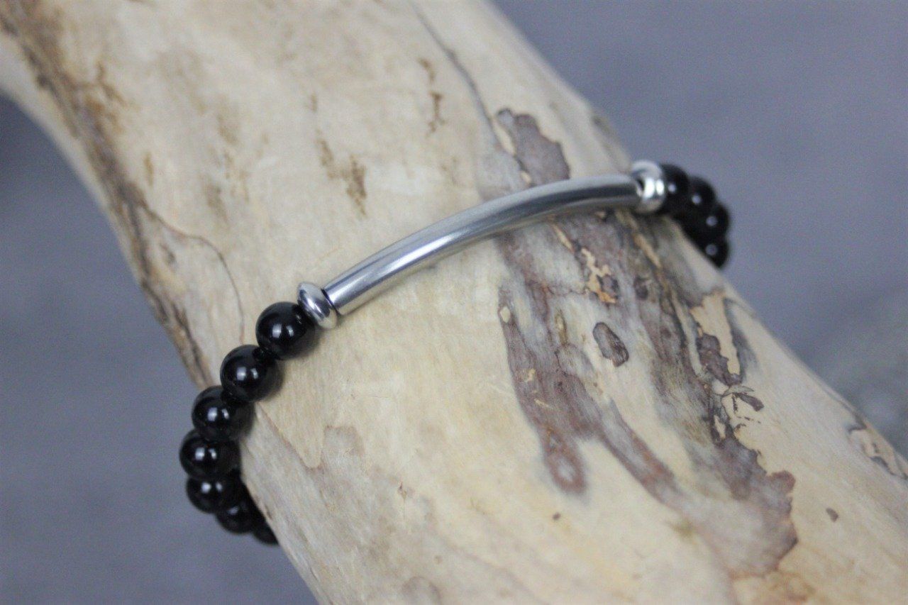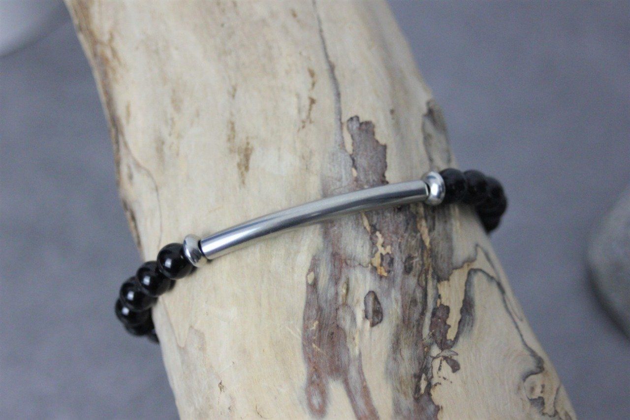 Bracelet perles onyx noir et perle tube acier inoxydable