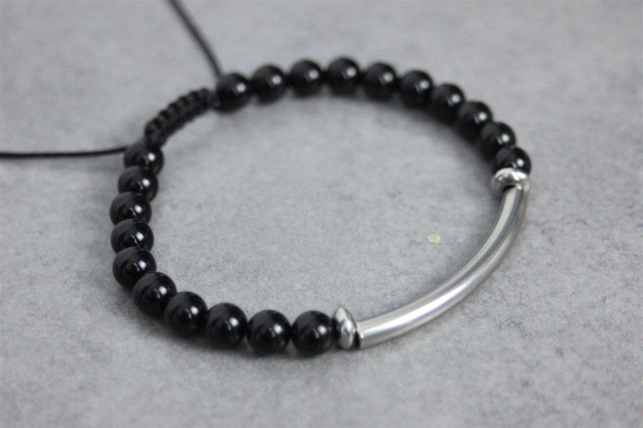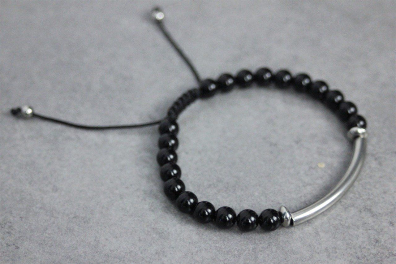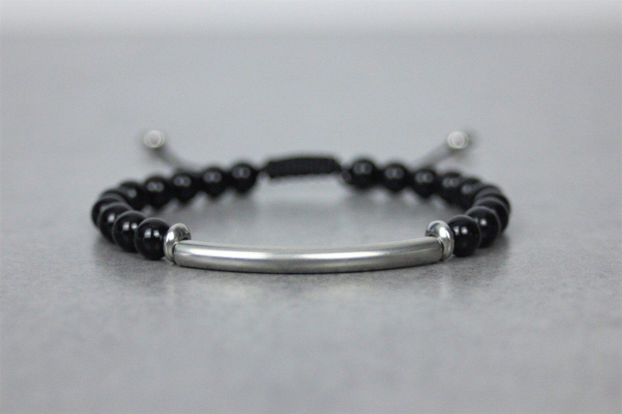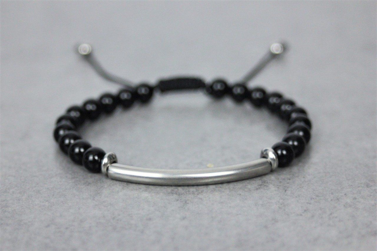 Bracelet perles onyx noir et perle tube acier inoxydable