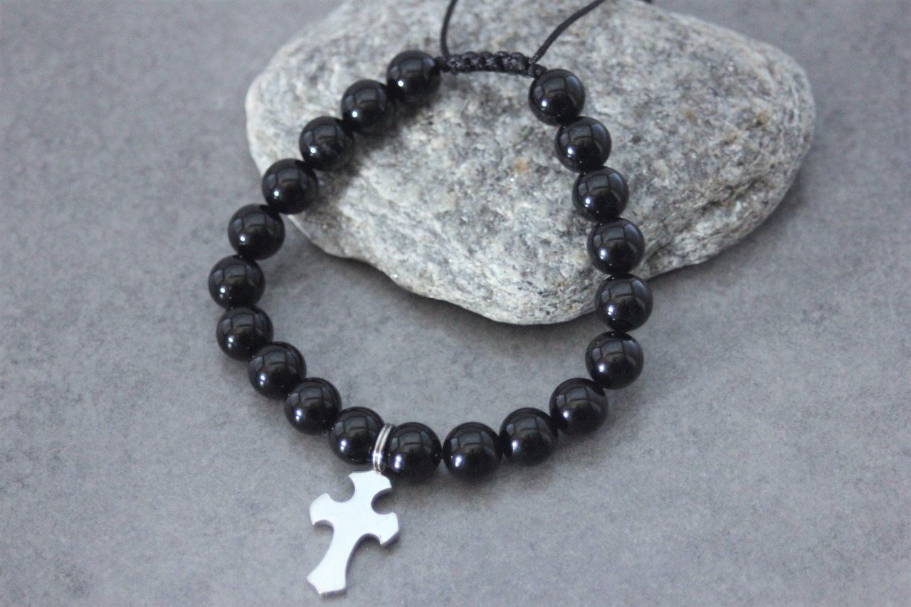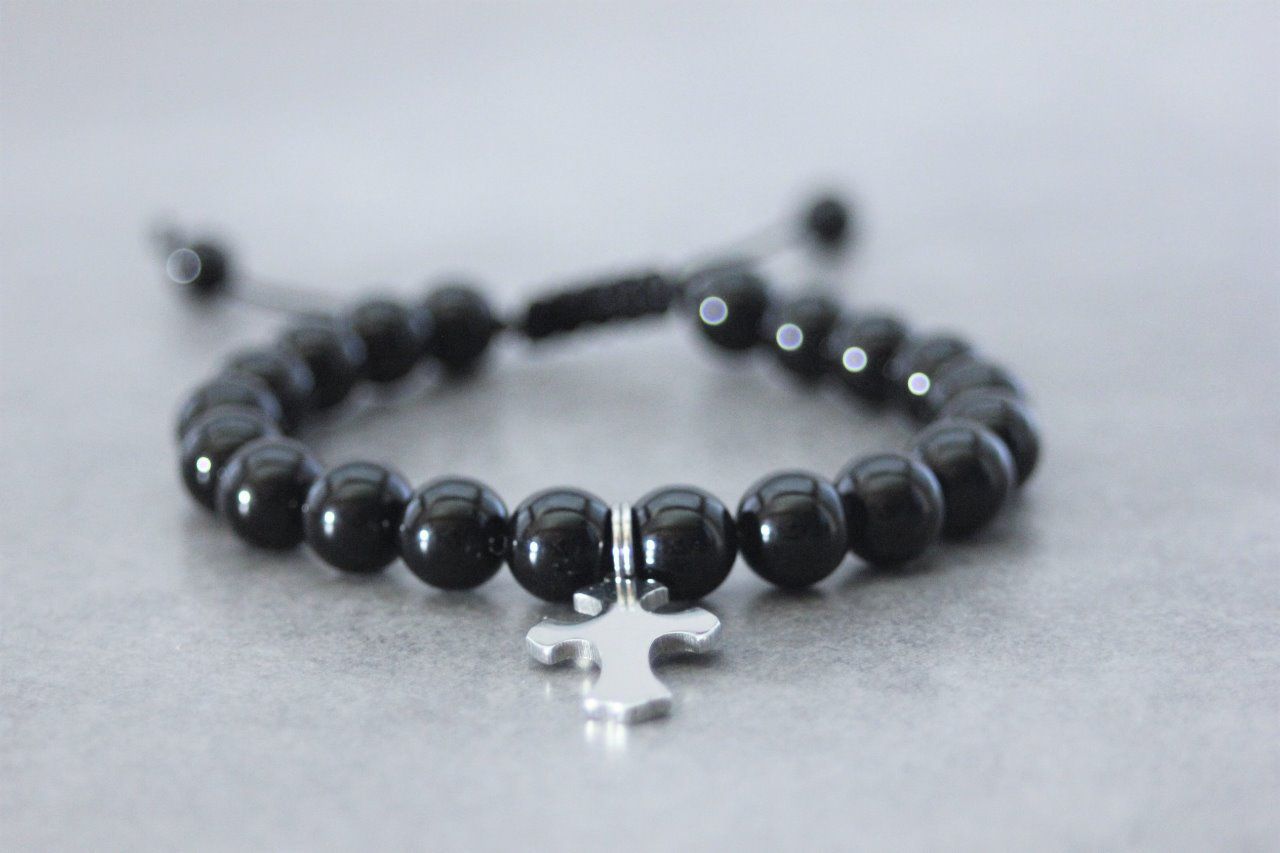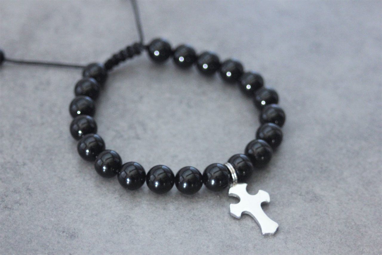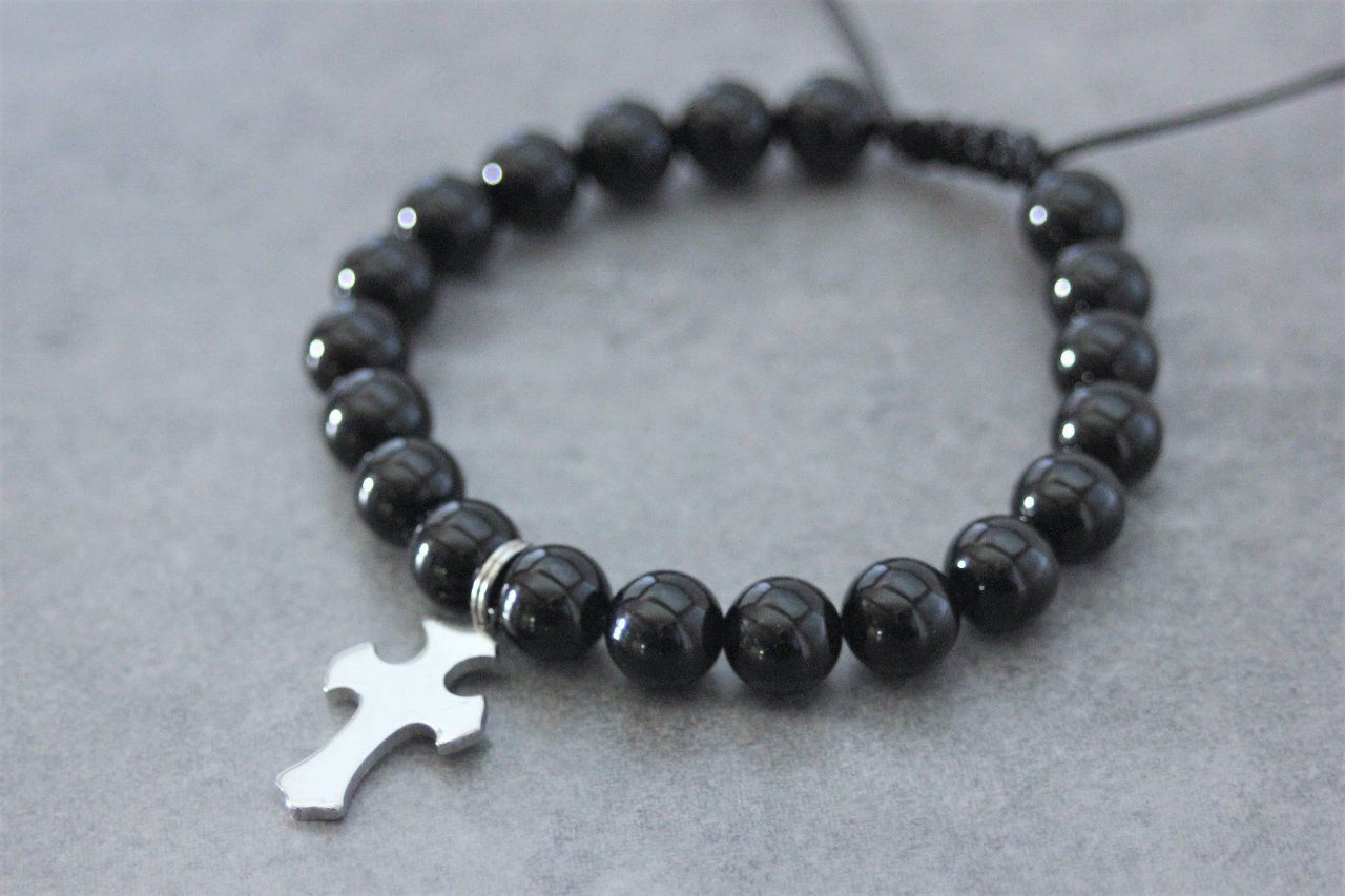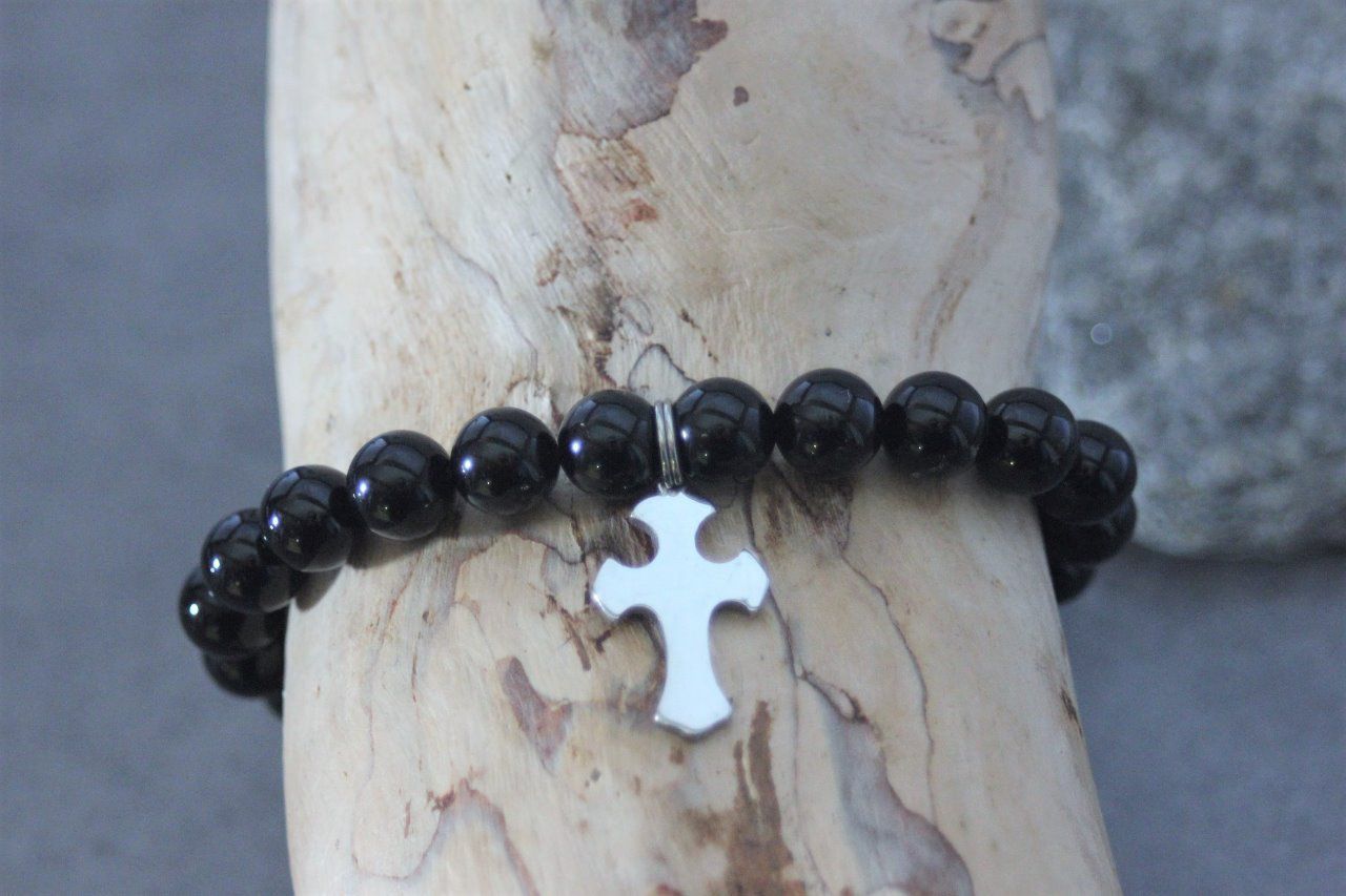 Bracelet en pierres naturelles semi-précieuses et acier inoxydable. Matériaux utilisés : perles onyx et croix en acier inoxydable. Fermoir coulissant (convient à tous les poignets)