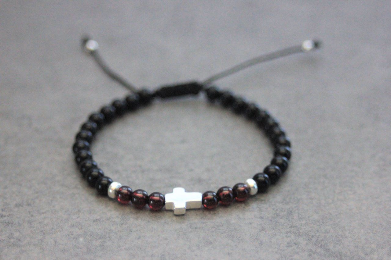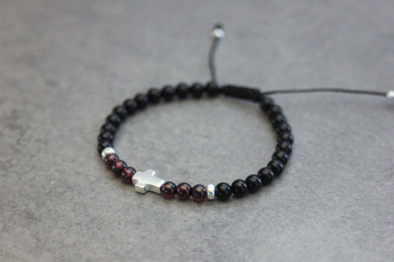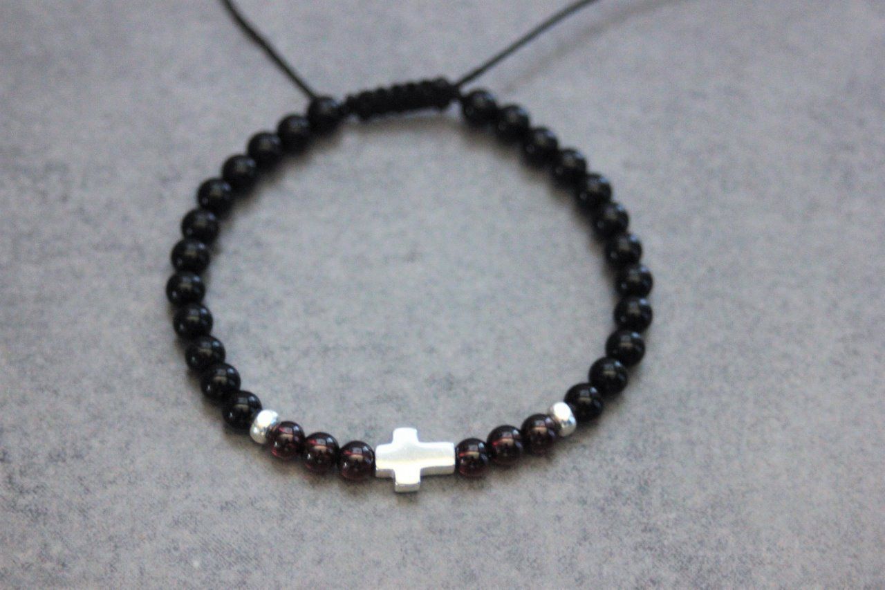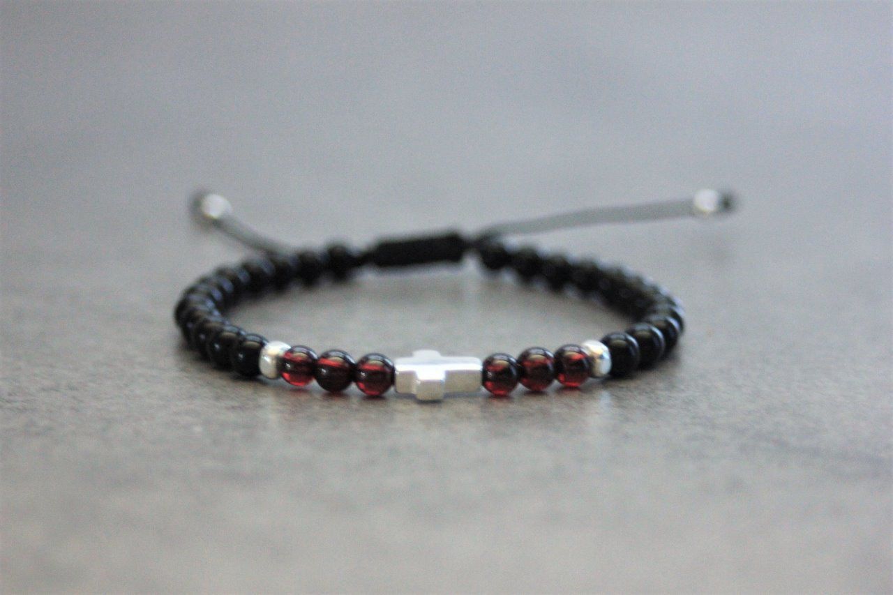 Bracelet en pierres naturelles semi-précieuses et argent massif 925. Matériaux utilisés : perles onyx, perles grenat, perles et croix en argent 925. Fermoir coulissant (convient à tous les poignets)