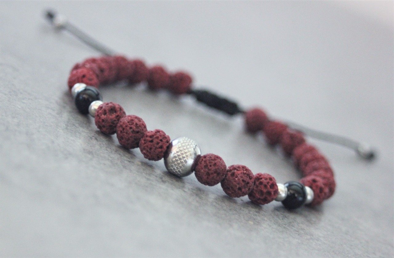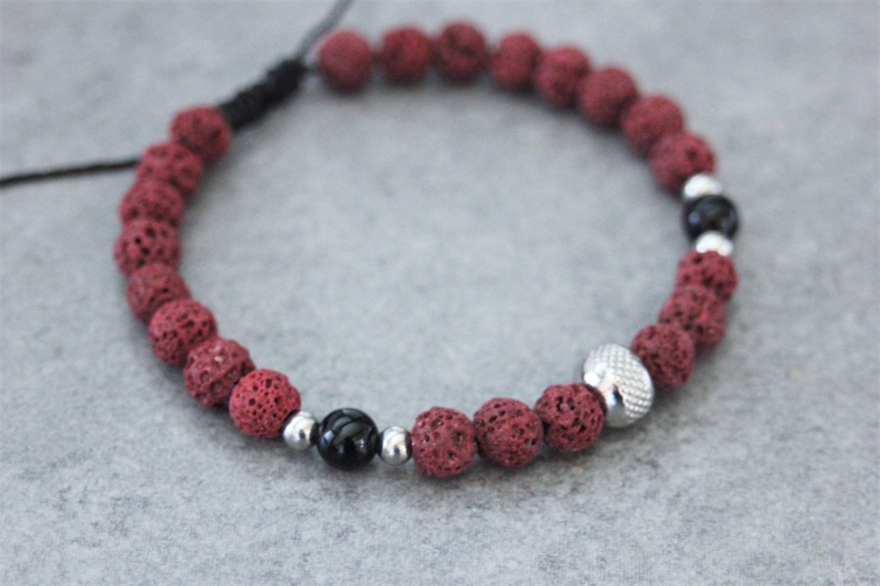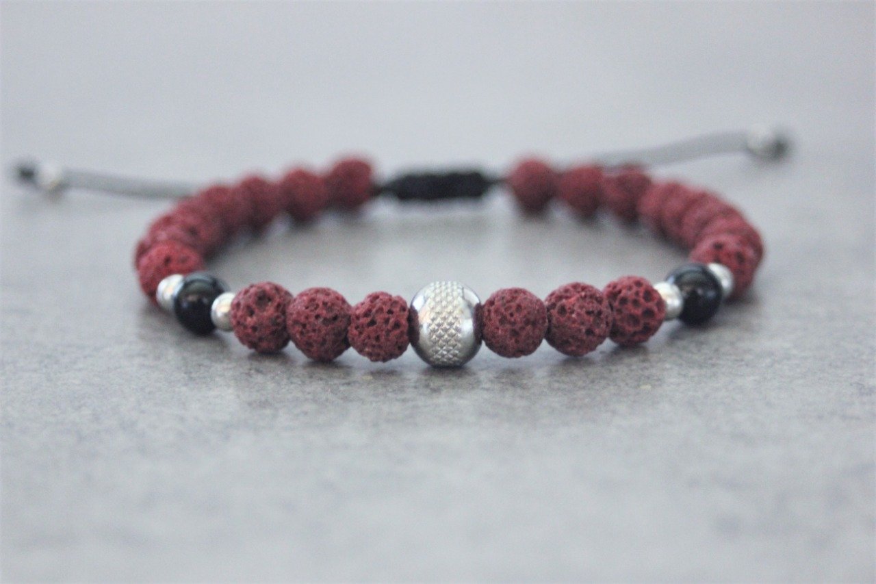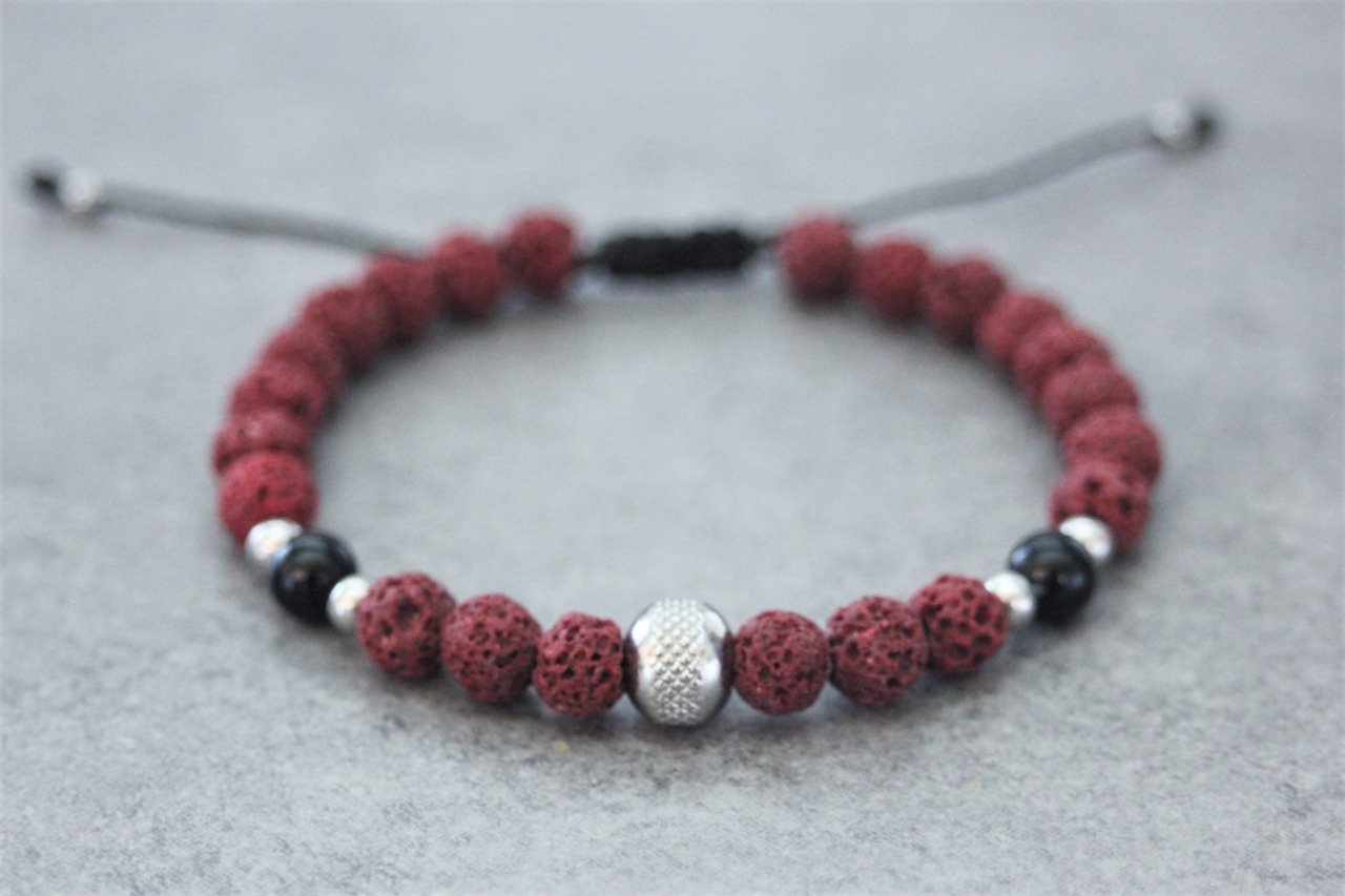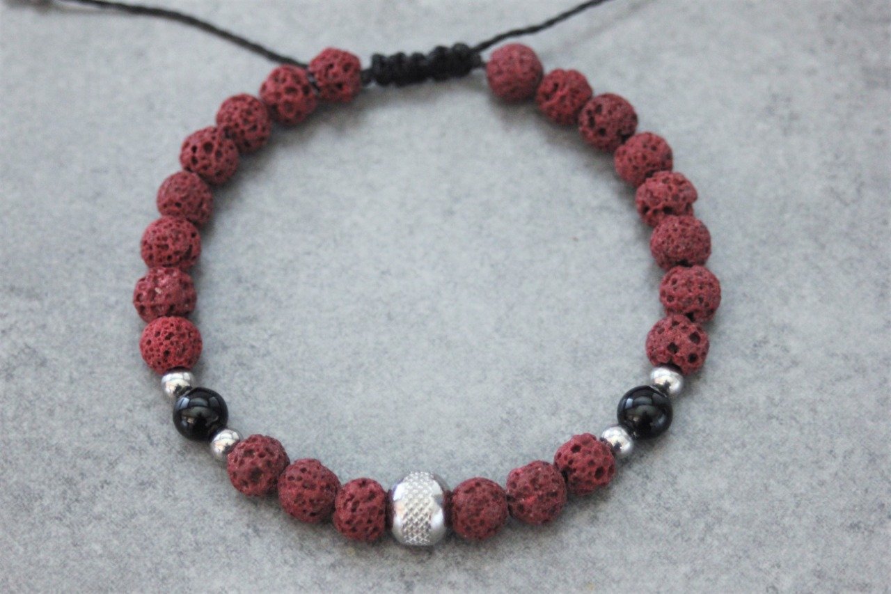 Bracelet en pierres naturelles semi-précieuses et acier inoxydable. Matériaux utilisés : perles pierre de lave rouge, perles onyx et perles acier inoxydable. Fermoir coulissant (convient à tous les poignets)