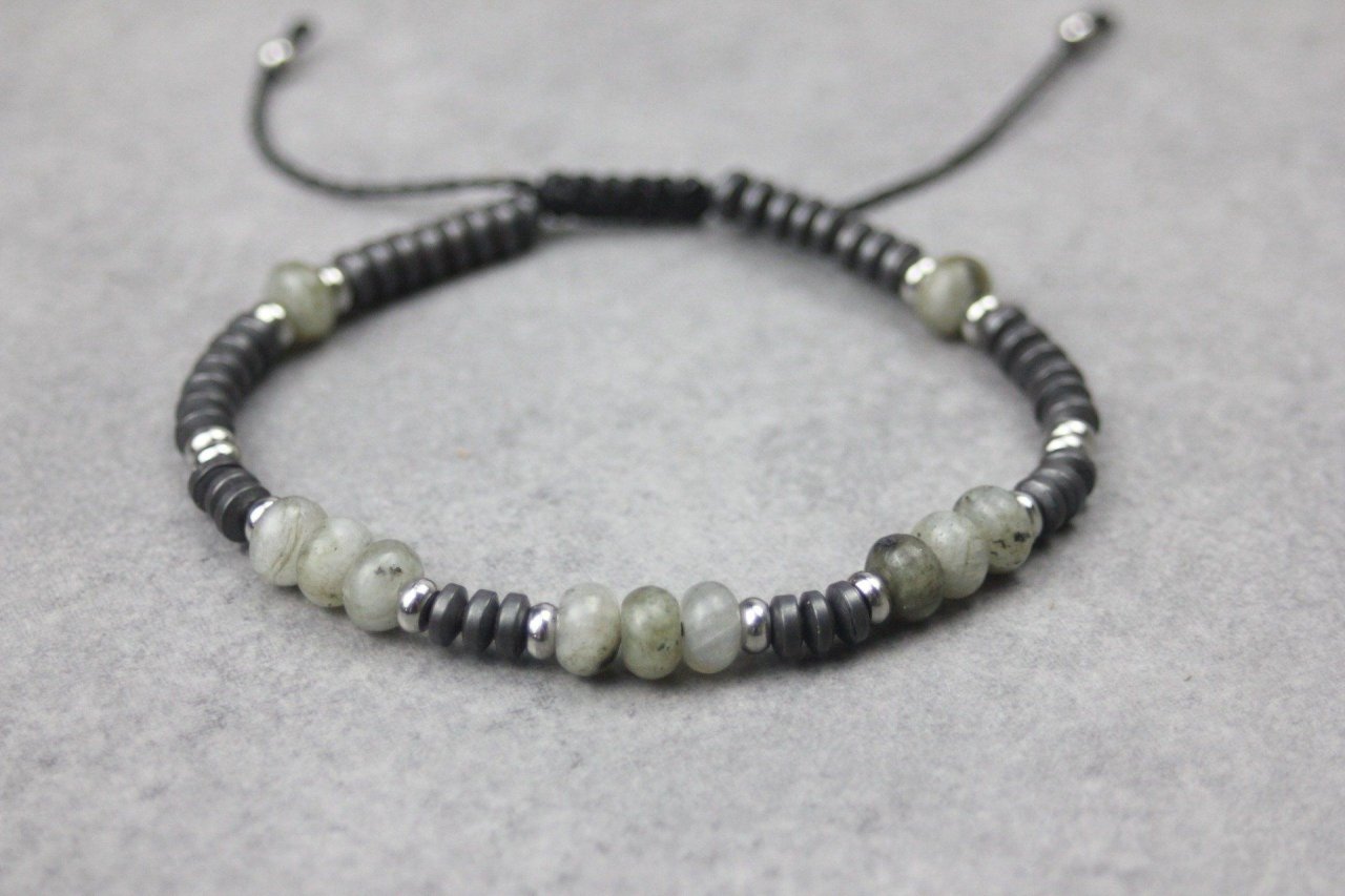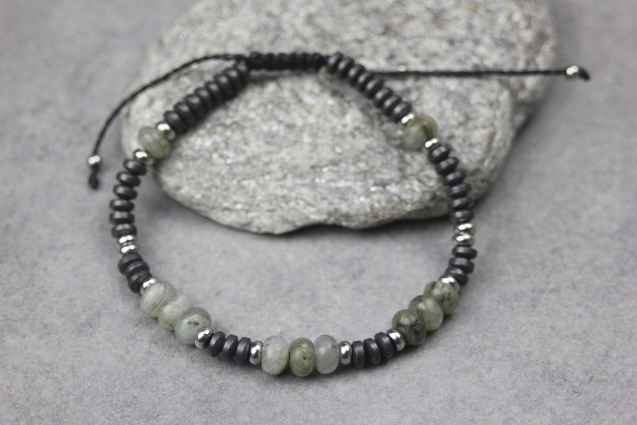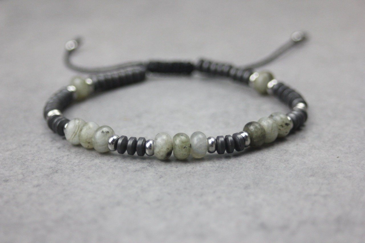 Bracelet en pierres naturelles semi-précieuses et acier inoxydable. Matériaux utilisés : perles rondelles labradorite, hématite mat et acier inoxydable. Fermoir coulissant (convient à tous les poignets)