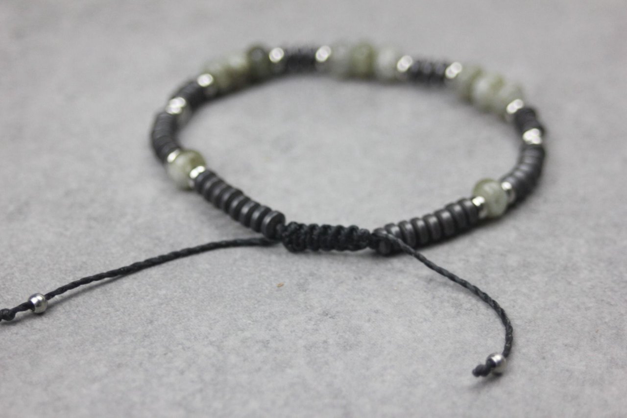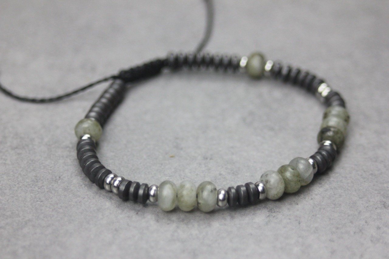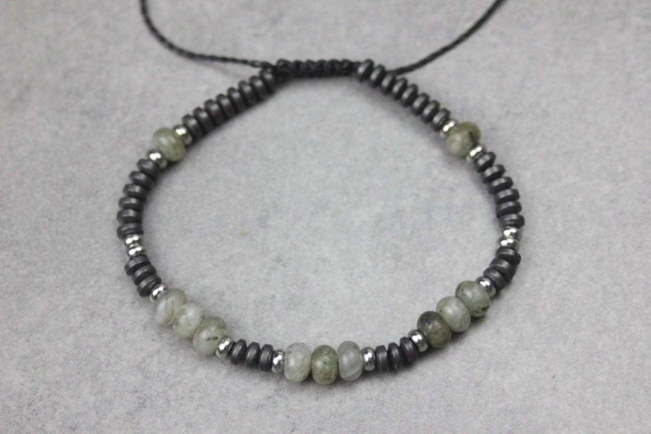 Bracelet en pierres naturelles semi-précieuses et acier inoxydable. Matériaux utilisés : perles rondelles labradorite, hématite mat et acier inoxydable. Fermoir coulissant (convient à tous les poignets)