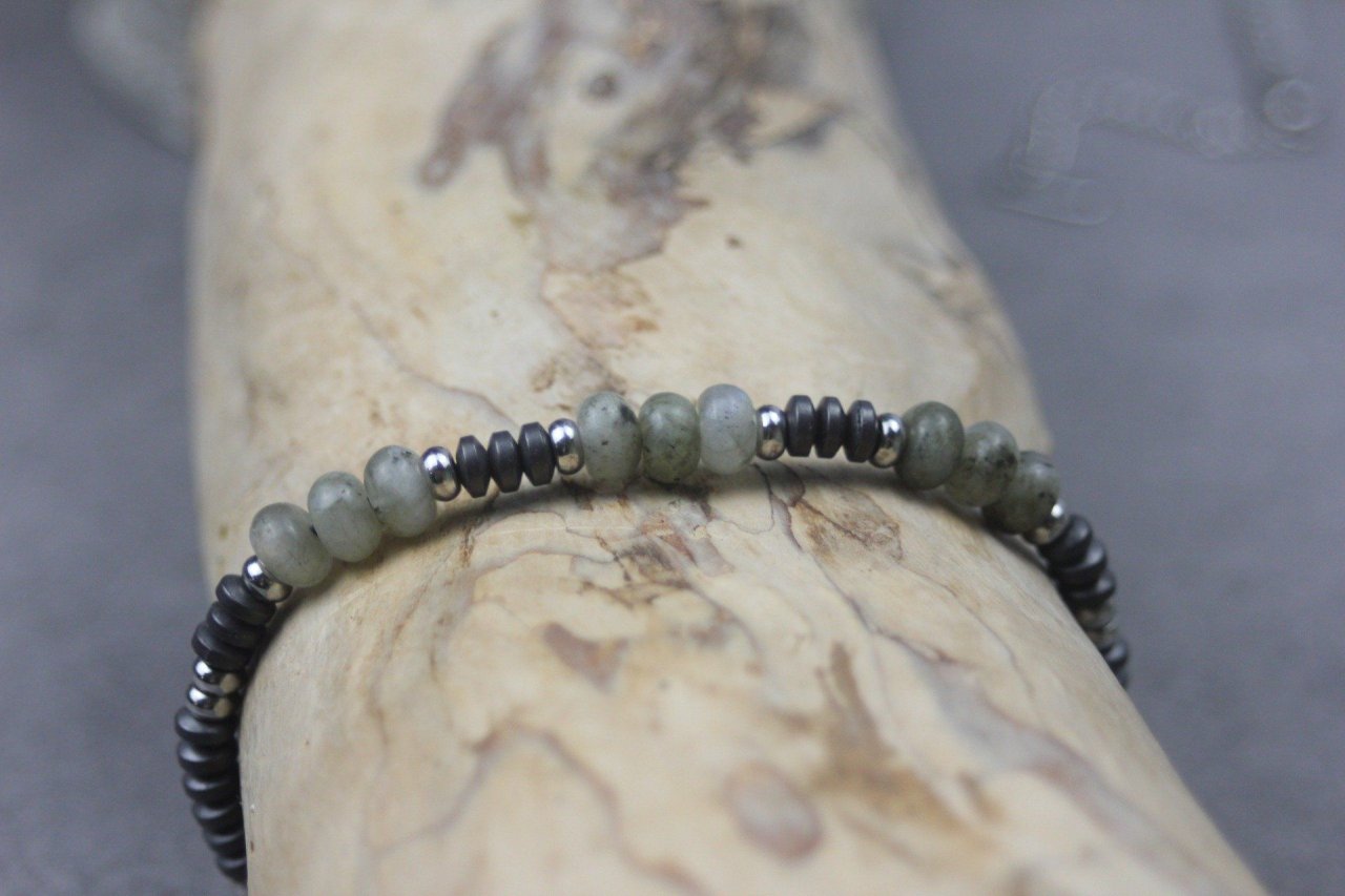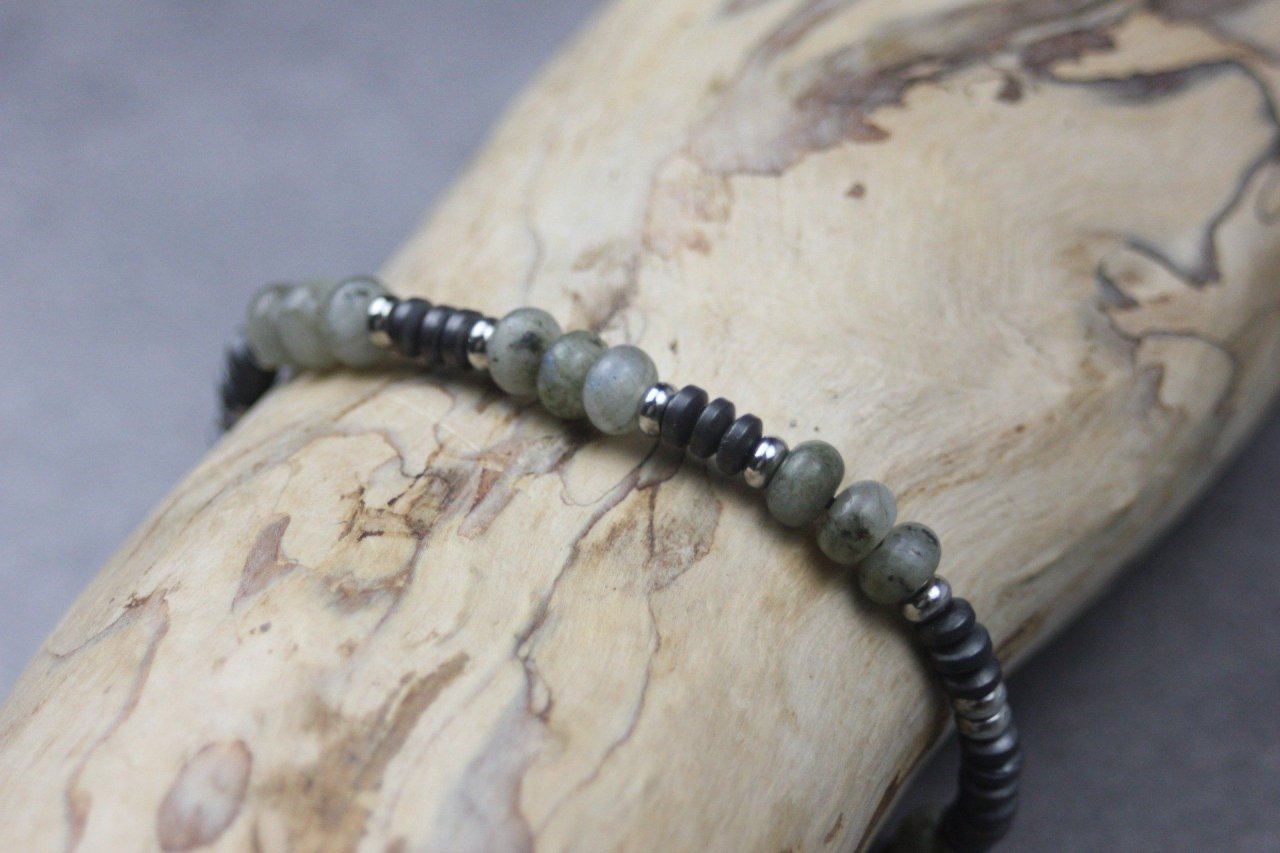 Bracelet perles rondelles labradorite, wood stone et hématite - bracelet pierres naturelles - bracelet pierres gemmes - Bracelet homme perles