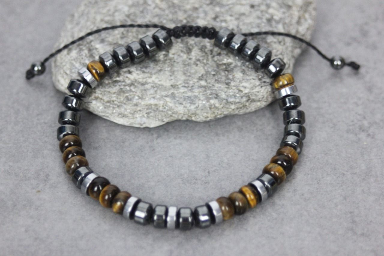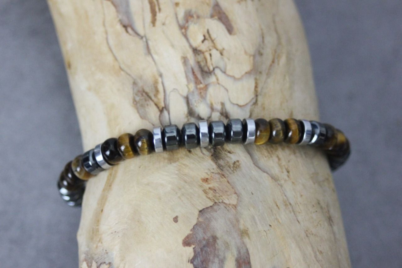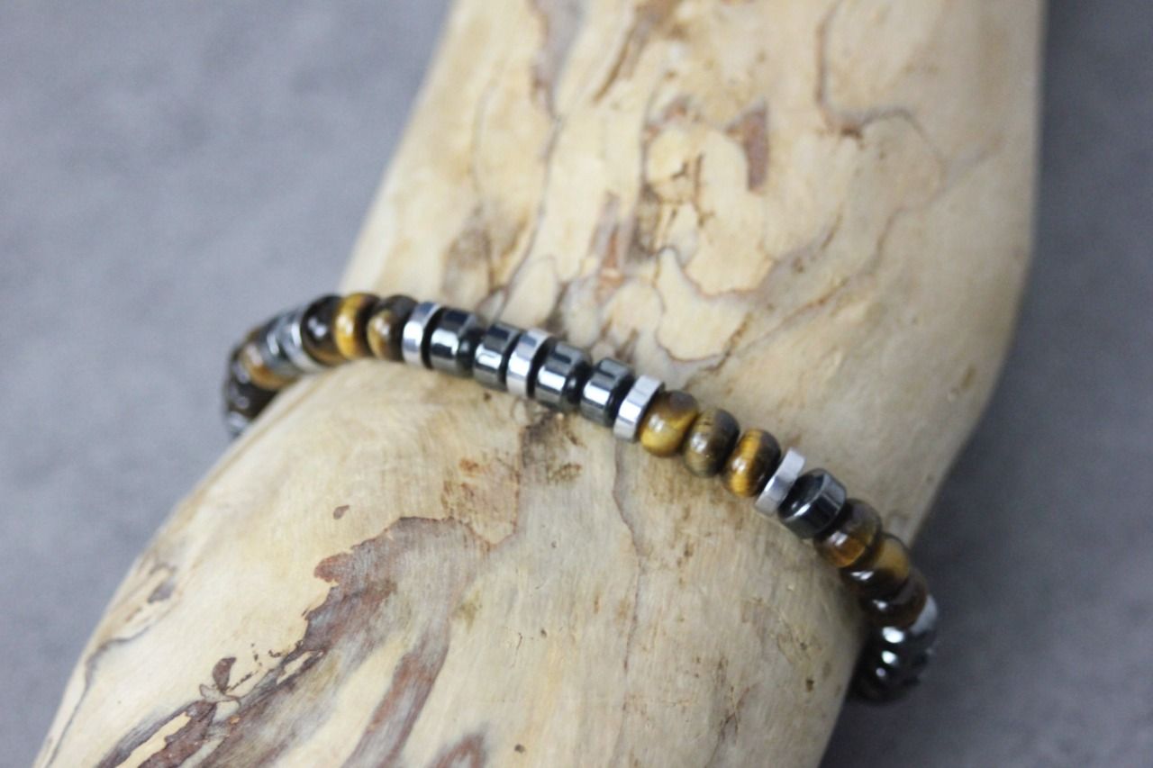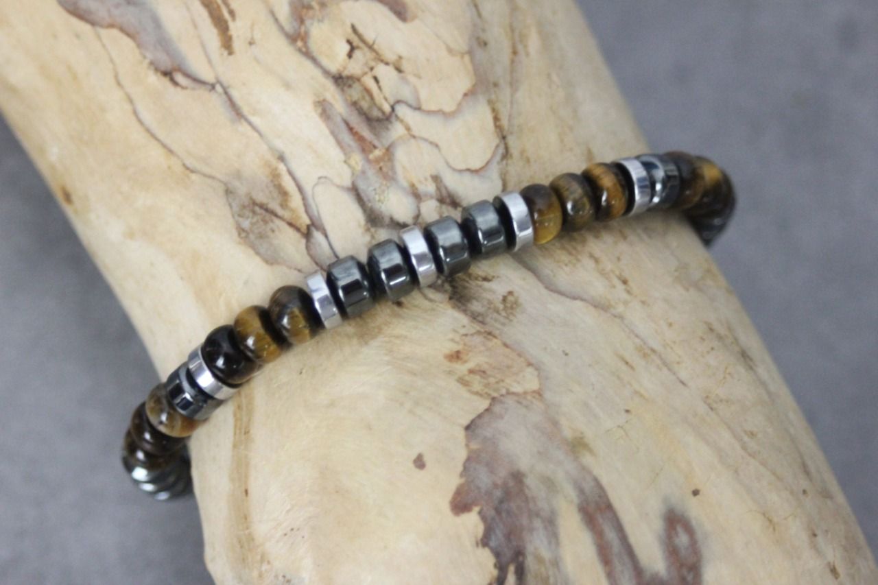 Bracelet en pierres naturelles semi-précieuses. Matériaux utilisés : perles rondelles oeil de tigre, hématite et hématite argentée. Fermoir coulissant (convient à tous les poignets)