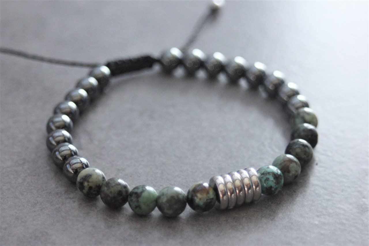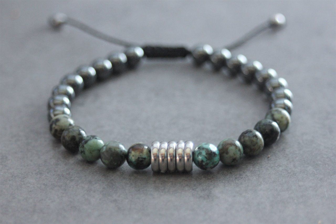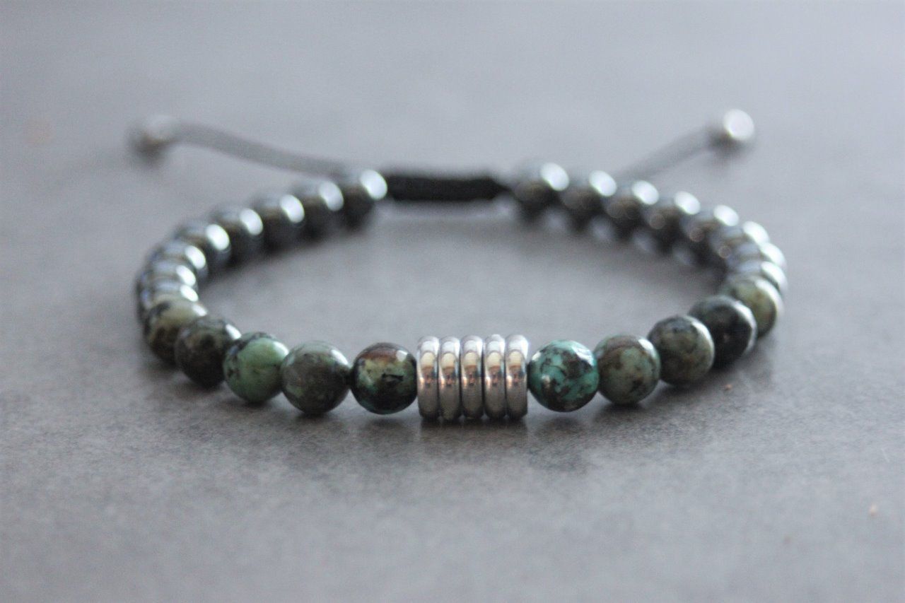 Bracelet en pierres naturelles semi-précieuses et acier inoxydable. Matériaux utilisés : perles turquoise africaine, perles hématite et acier inoxydable. Fermoir coulissant (convient à tous les poignets)