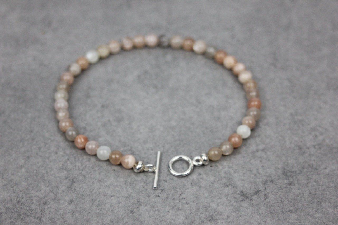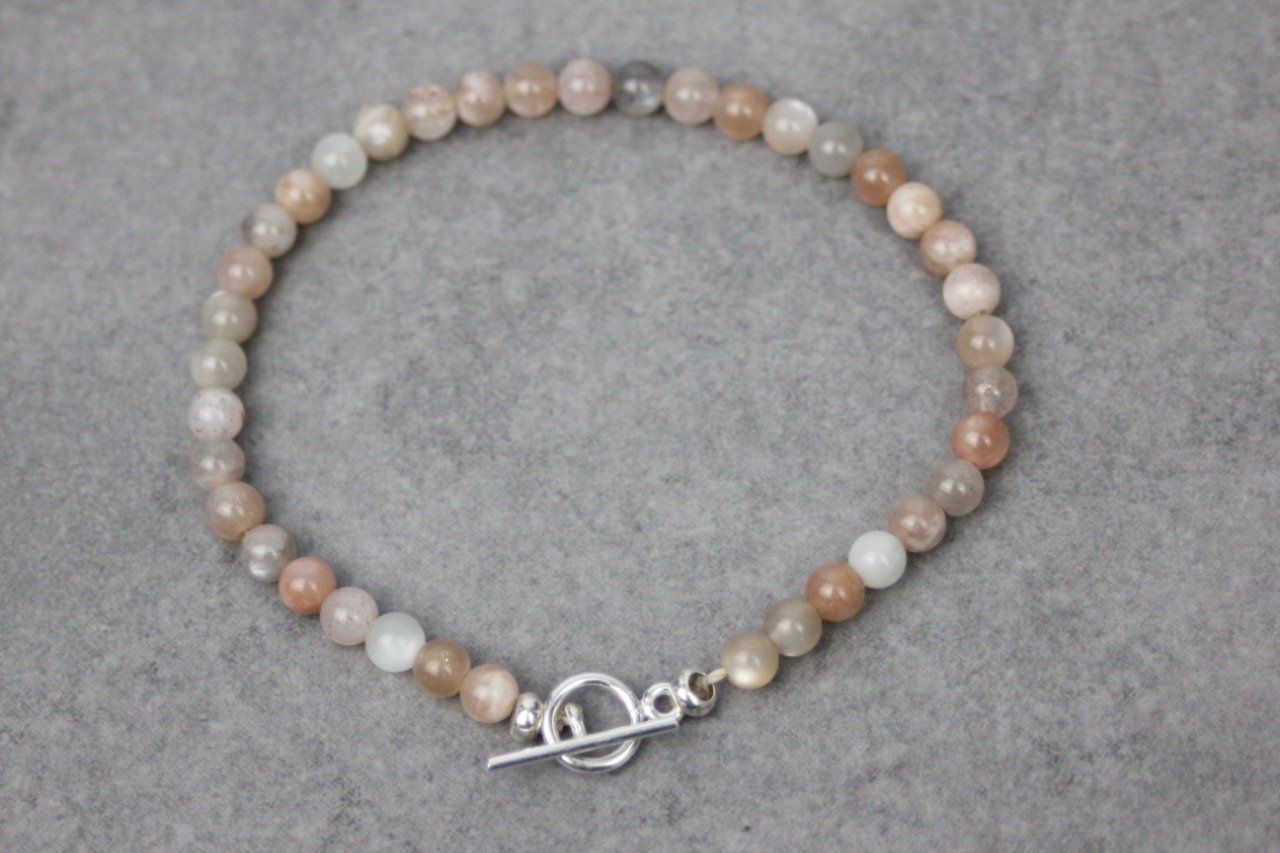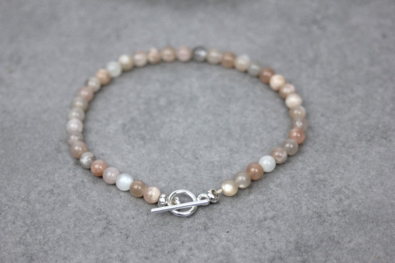 Bracelet en pierres naturelles semi-précieuses et argent massif. Matériaux utilisés : perles pierres de lune et perles argent massif. Fermoir toggle. Plusieurs longueurs disponibles