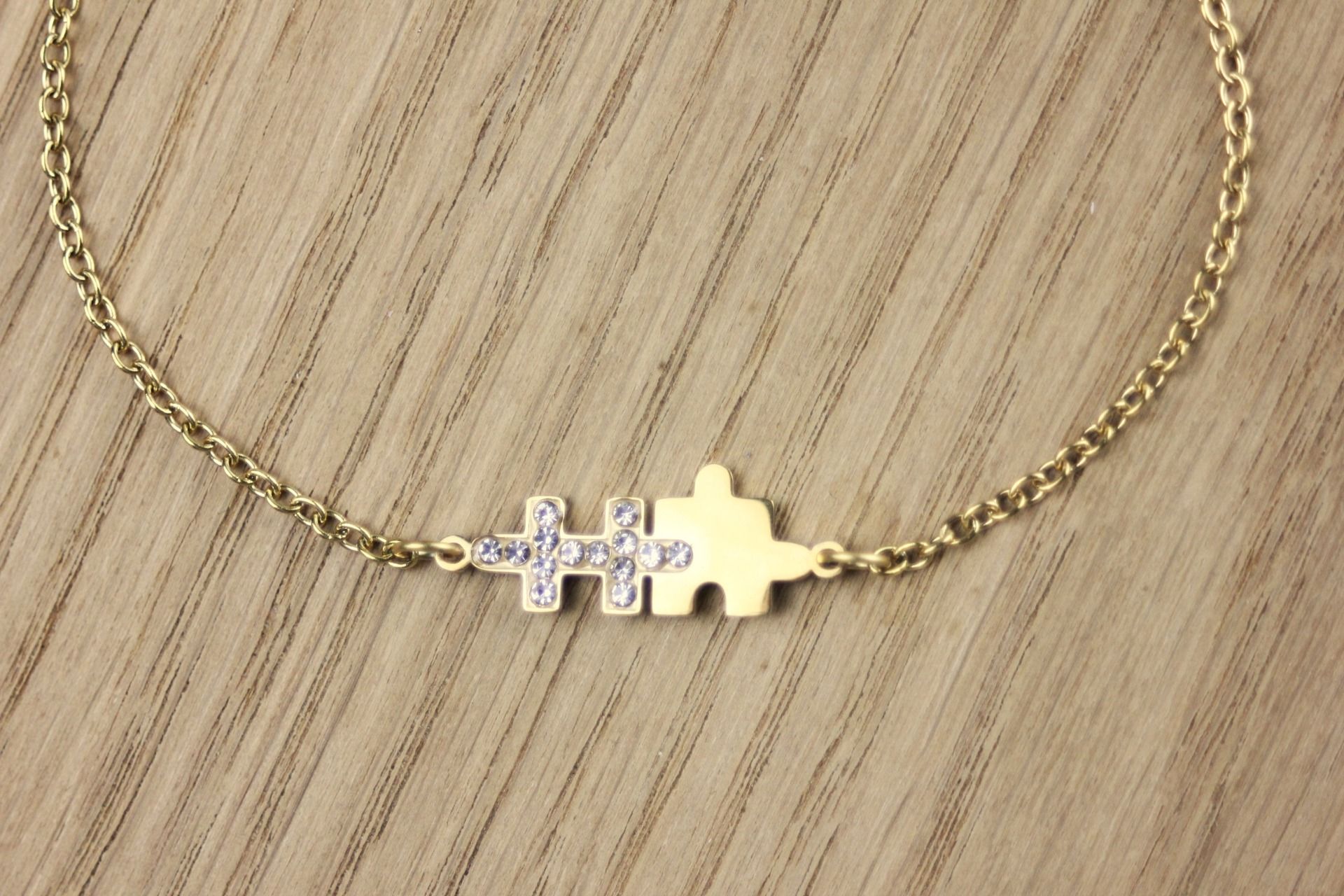 Chaine en acier inoxydable doré avec intercalaire puzzle 2 pièces dont l'une des pièces est ornée d'oxydes de zirconiums étincellants.