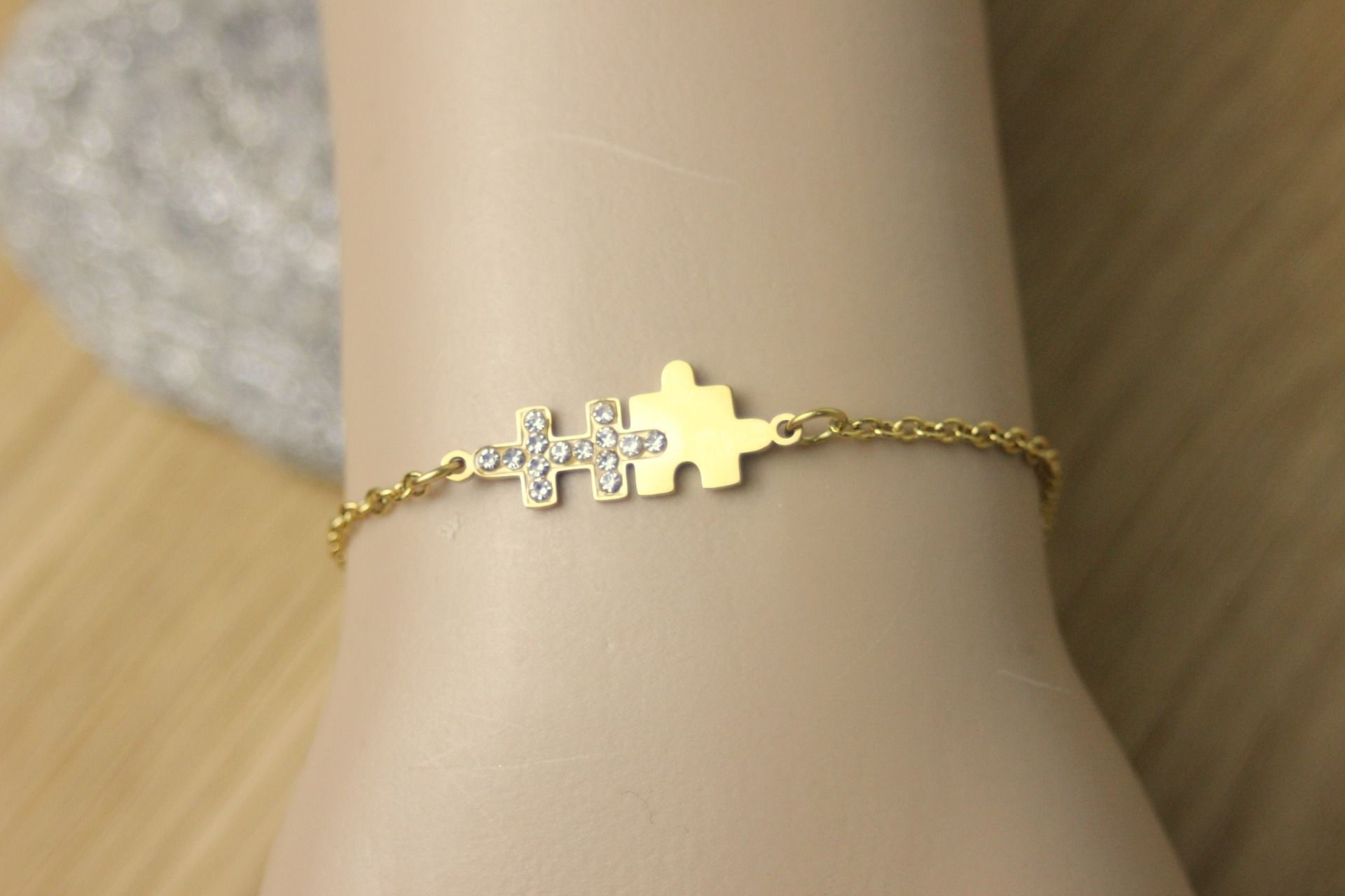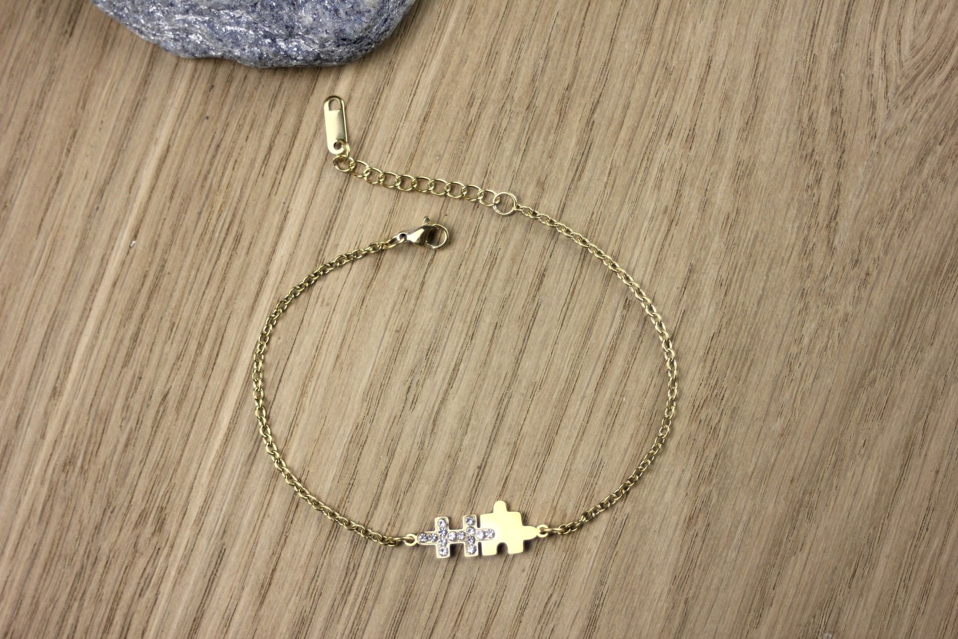 Bracelet acier inoxydable doré avec intercalaire puzzle 2 pièces et zirconiums. Longueur réglable.