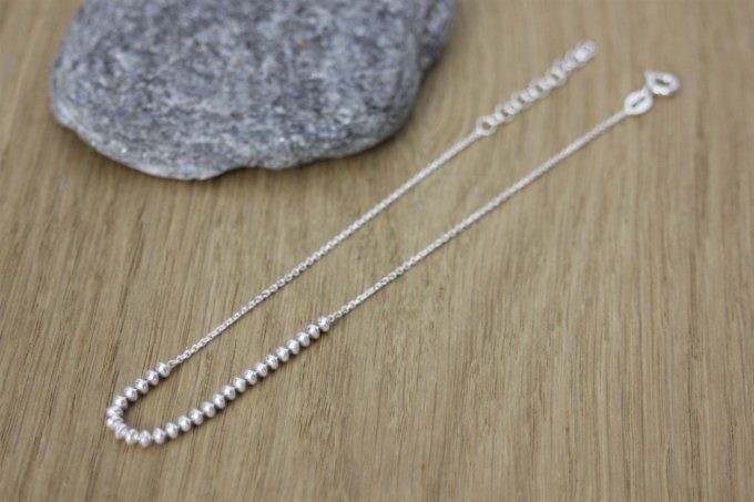 Bracelet chaine de cheville minimaliste en argent massif avec petites perles disques en argent massif. Longueur réglable de 23 à 26cm