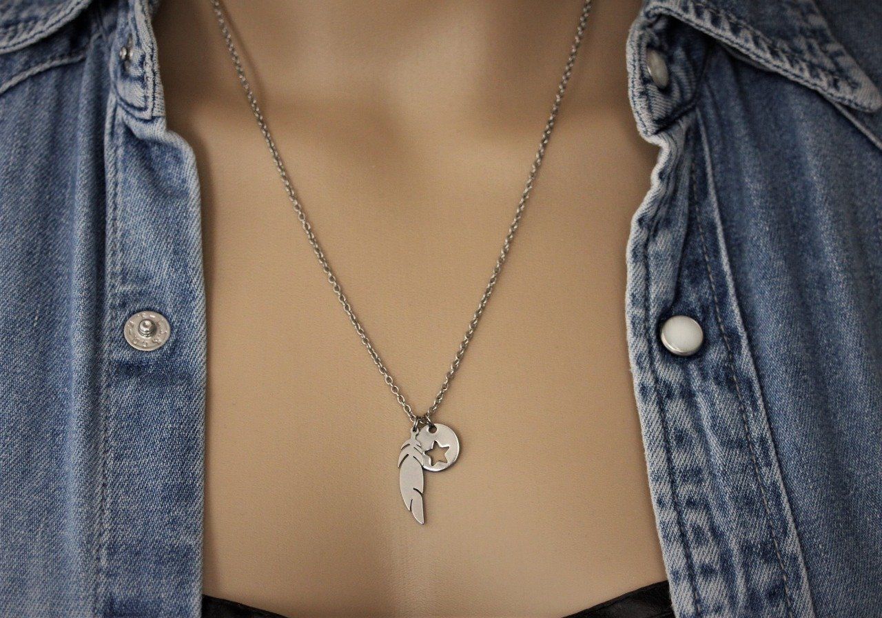 Collier acier inoxydable pendentif plume et médaille étoile - collier minimaliste - collier acier - collier ras de cou