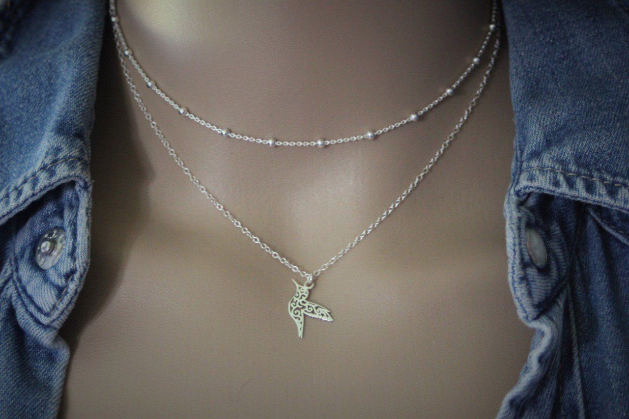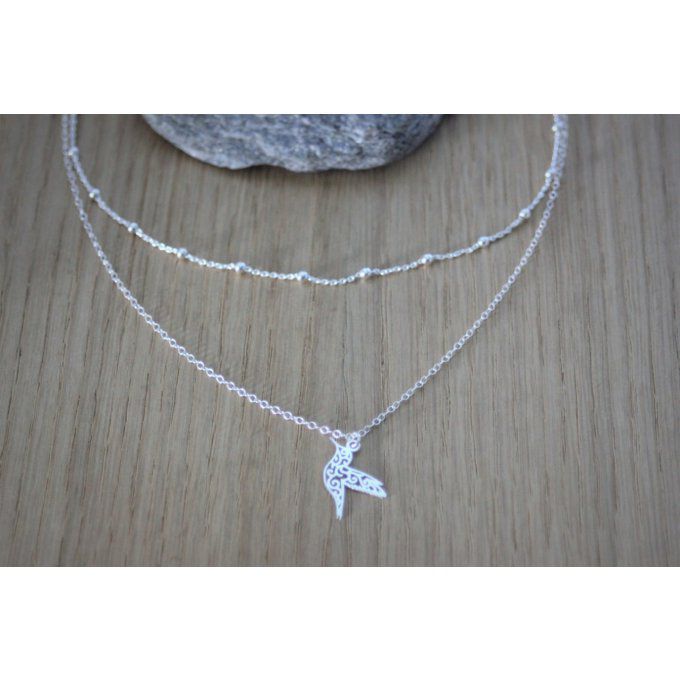 Collier en argent massif double chaine et pendentif colibri - collier fin en argent - collier multi-rangs argent - collier 2 chaines