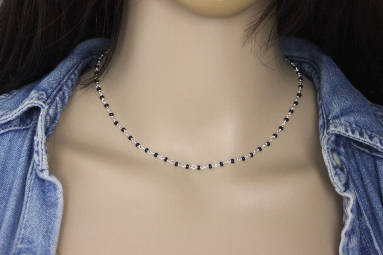 Collier réalisé avec une chaine en argent massif agrémentée de petites perles en pierres gemmes rondes aplaties en onyx noir