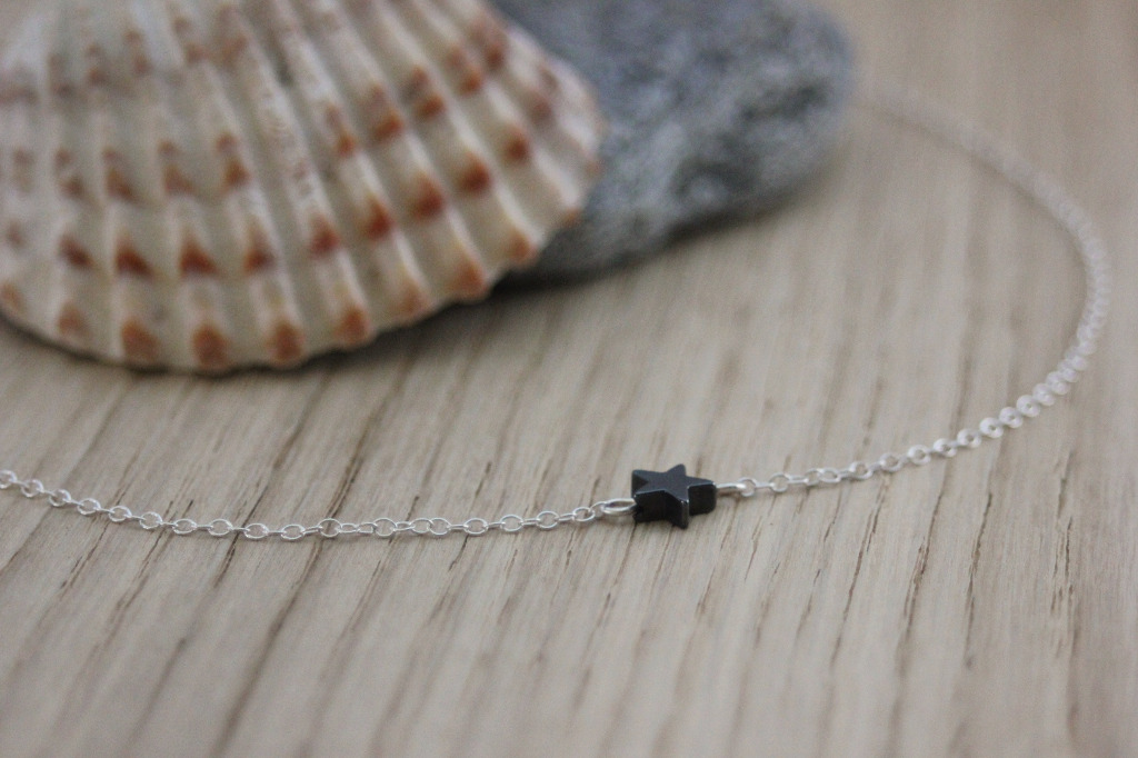 Collier ras du cou en argent massif et petite étoile noire en pierre semi-précieuse. Longueur réglable. Plusieurs longueurs disponibles.