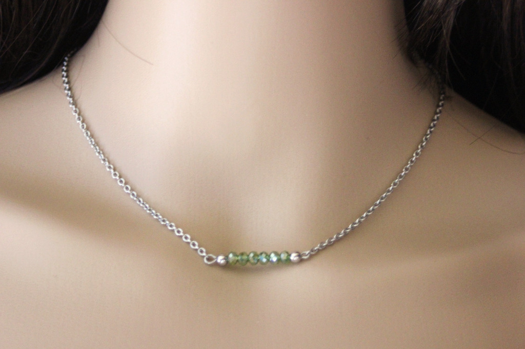 Collier en acier inoxydable et perles facettées vert olive aux reflets brillants.