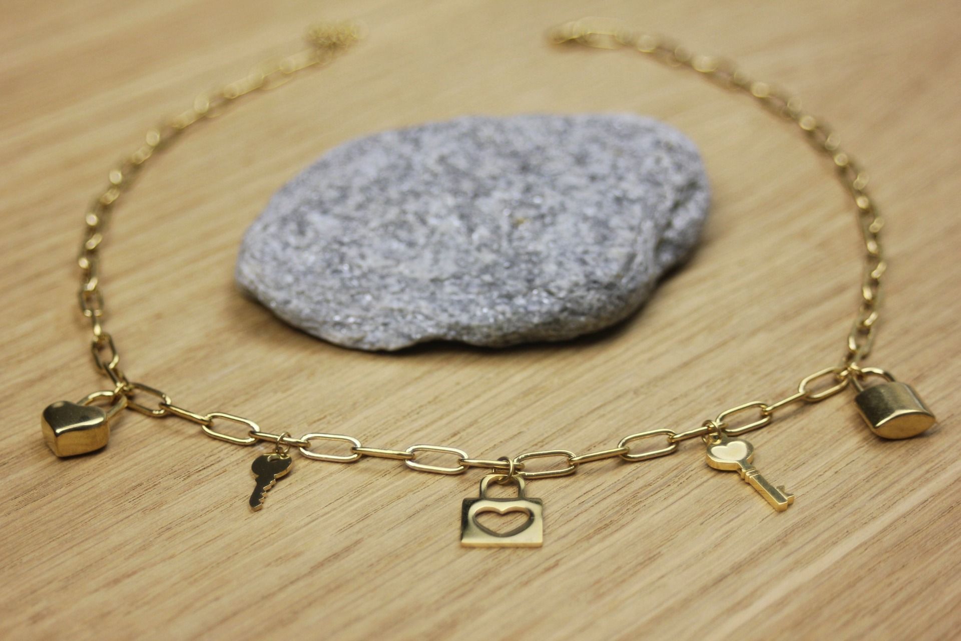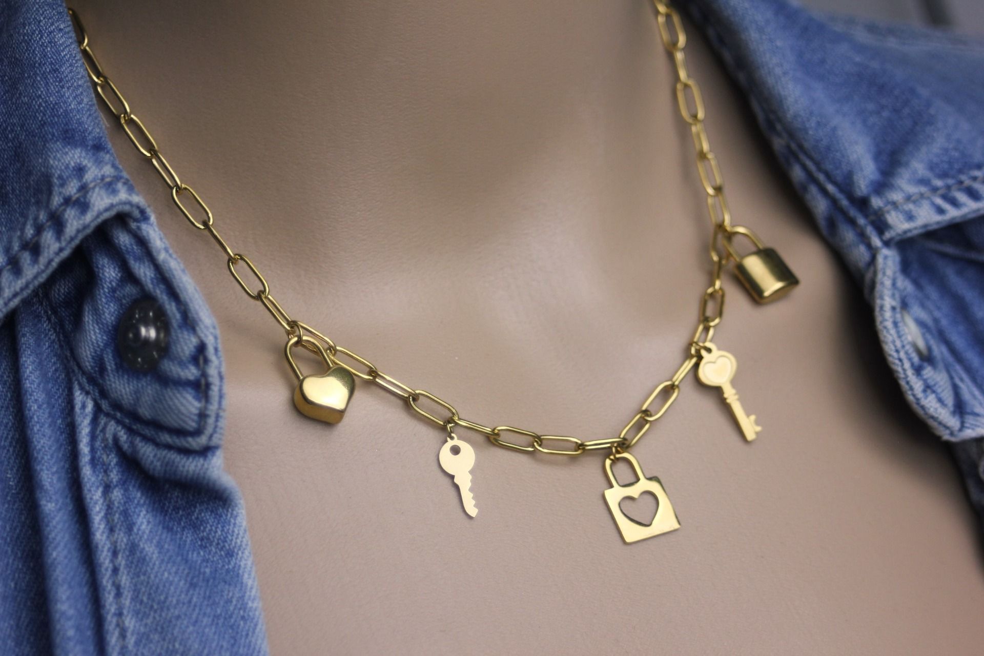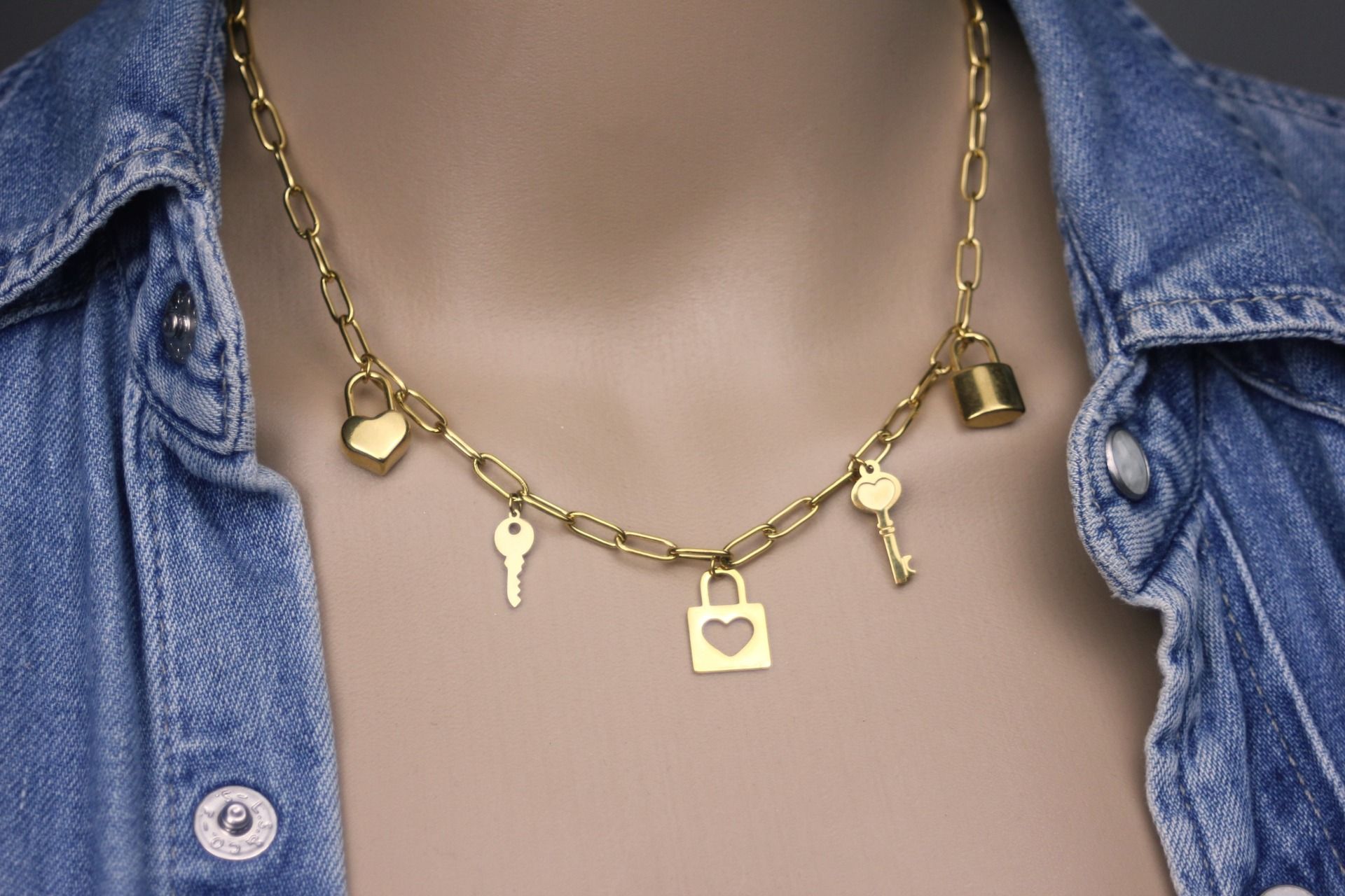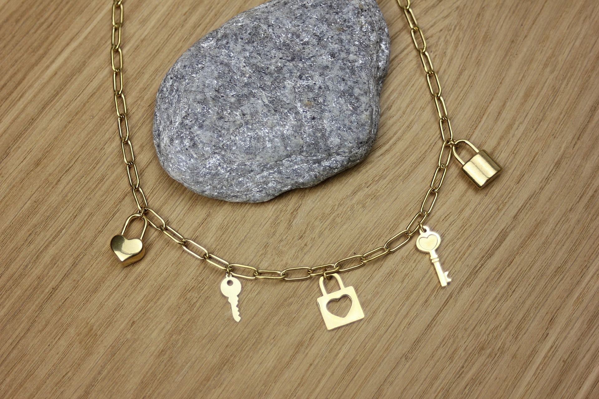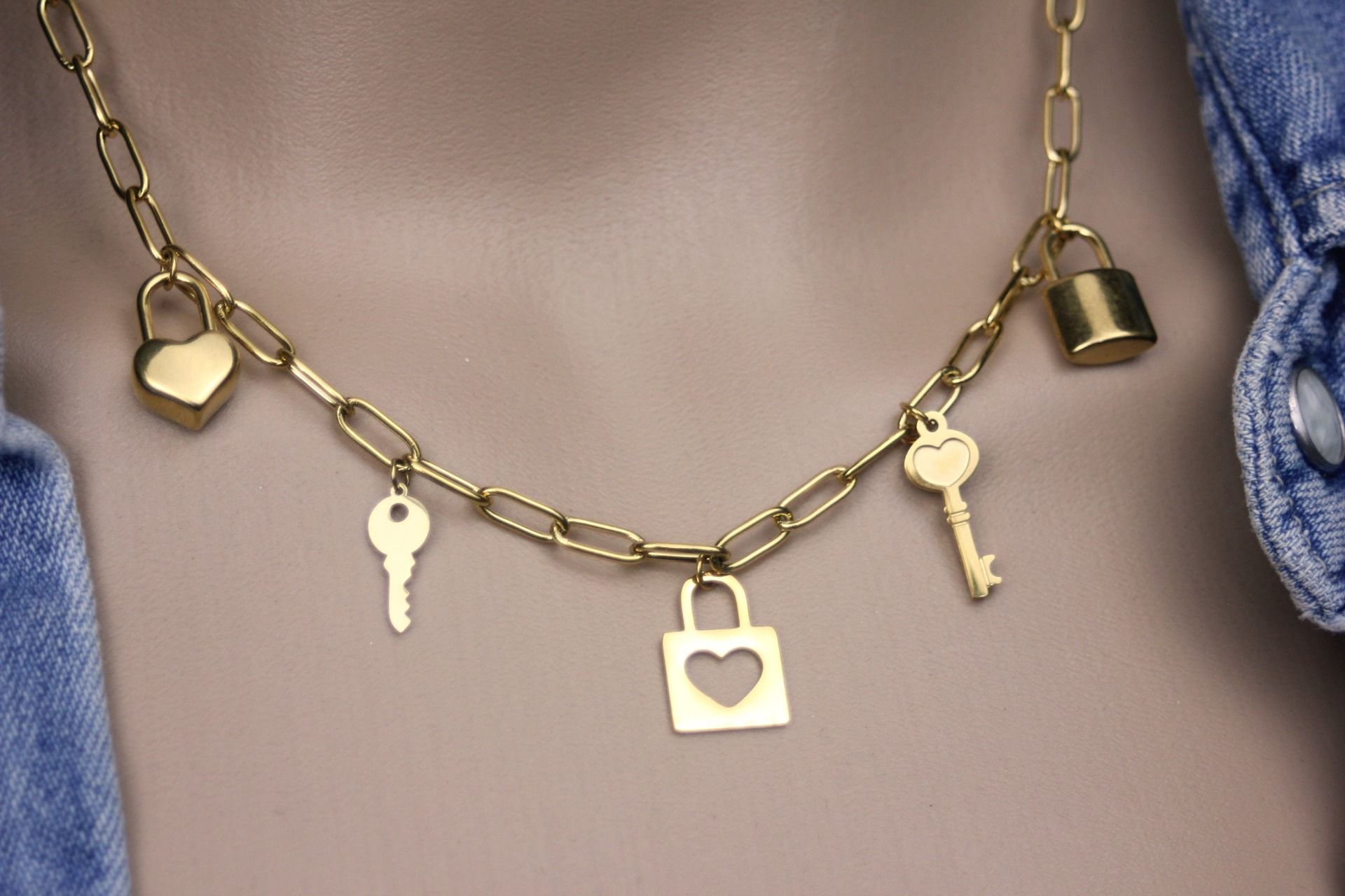 Collier en acier inoxydable doré et breloques clés et cadenas.